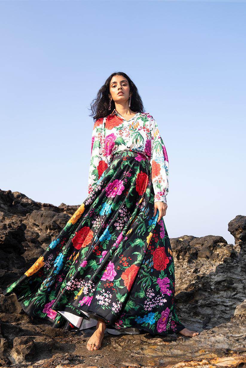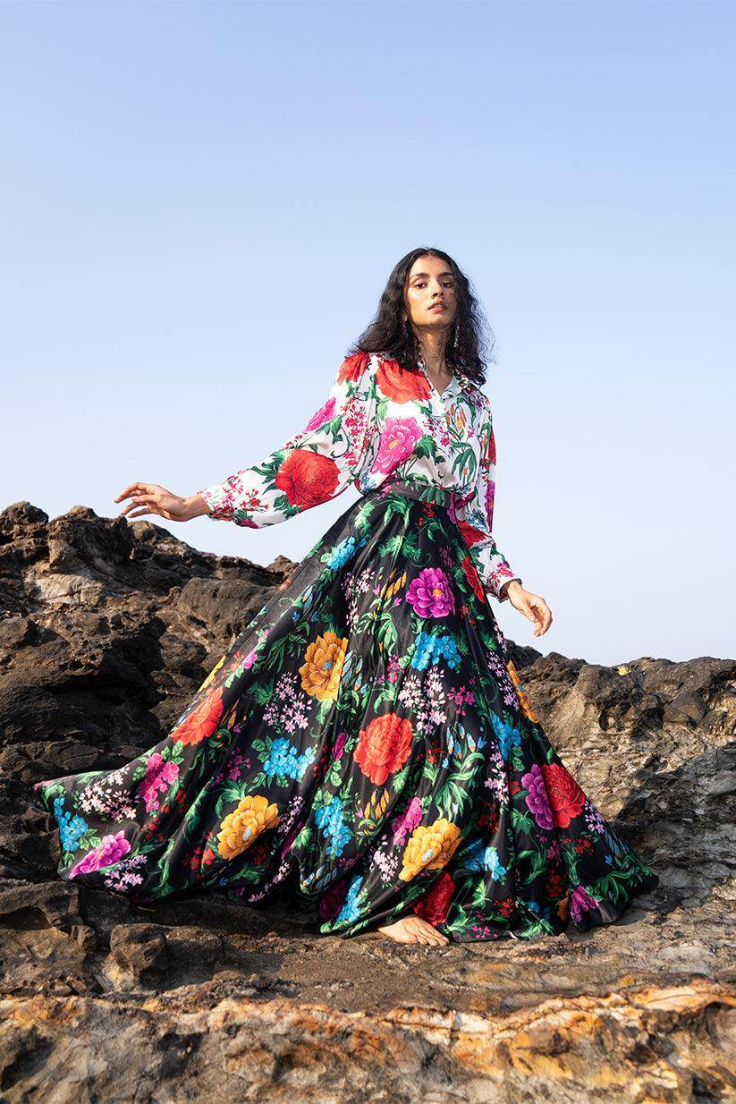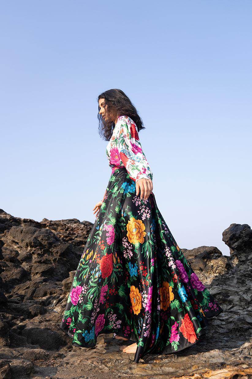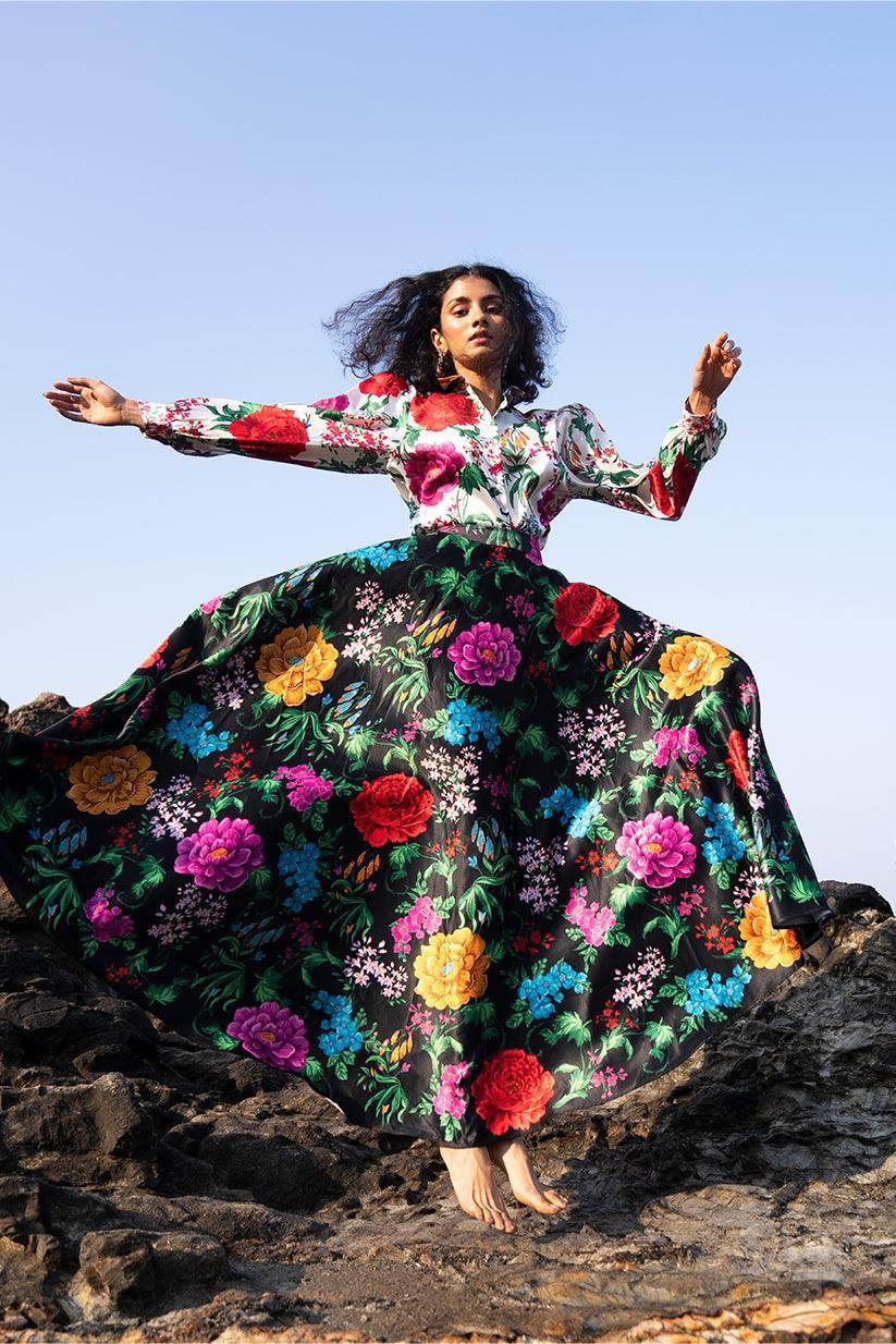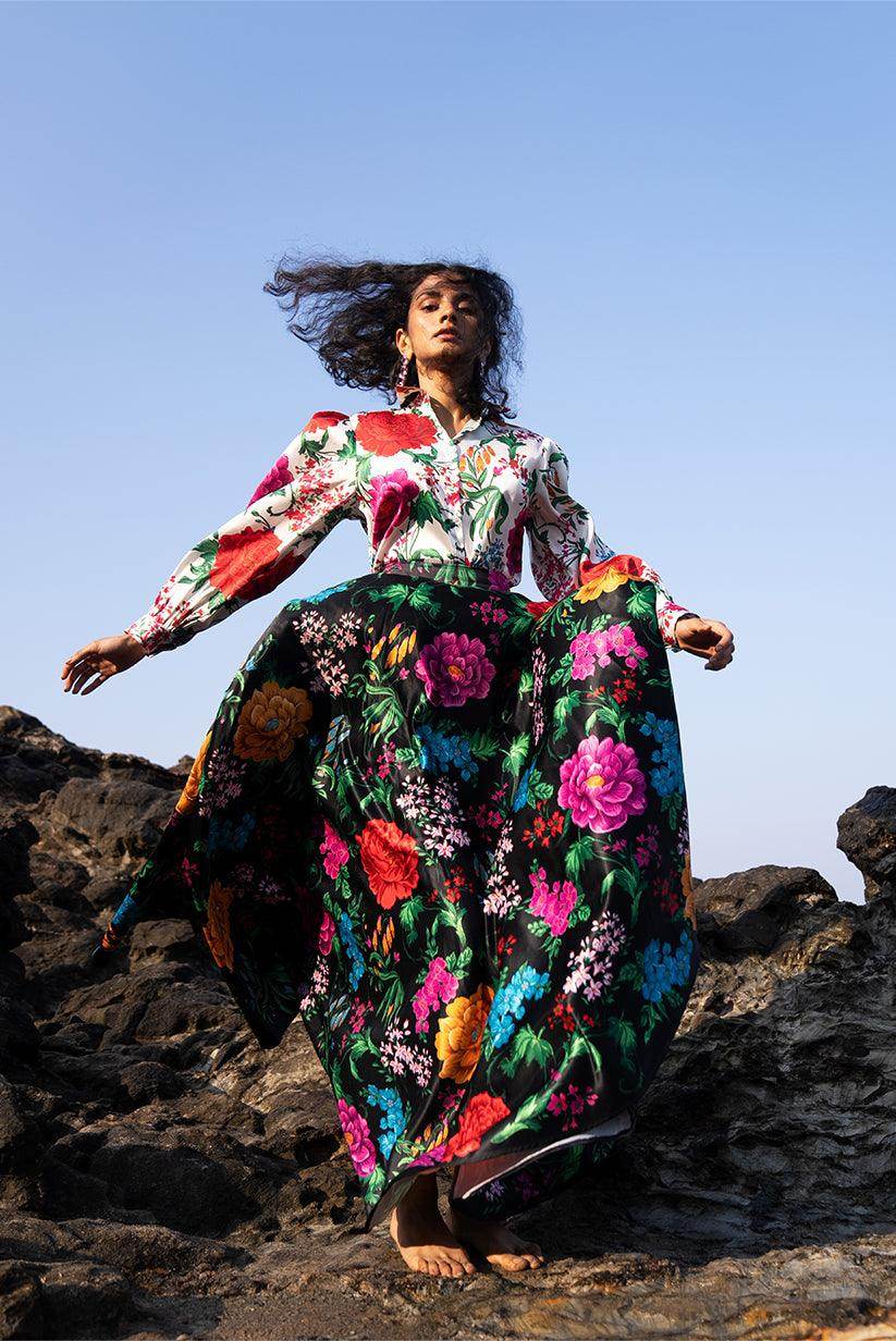 Allover multicolour floral print on a white base. Button down shirt with bishop sleeves and front button placket. Straight cut. Paired with an allover multicolour floral print on a black base maxi skirt in flowy satin with a zip closure on the side.