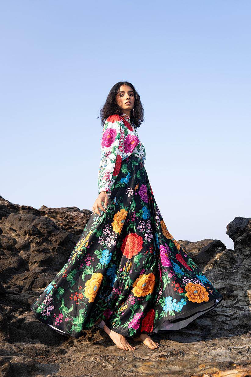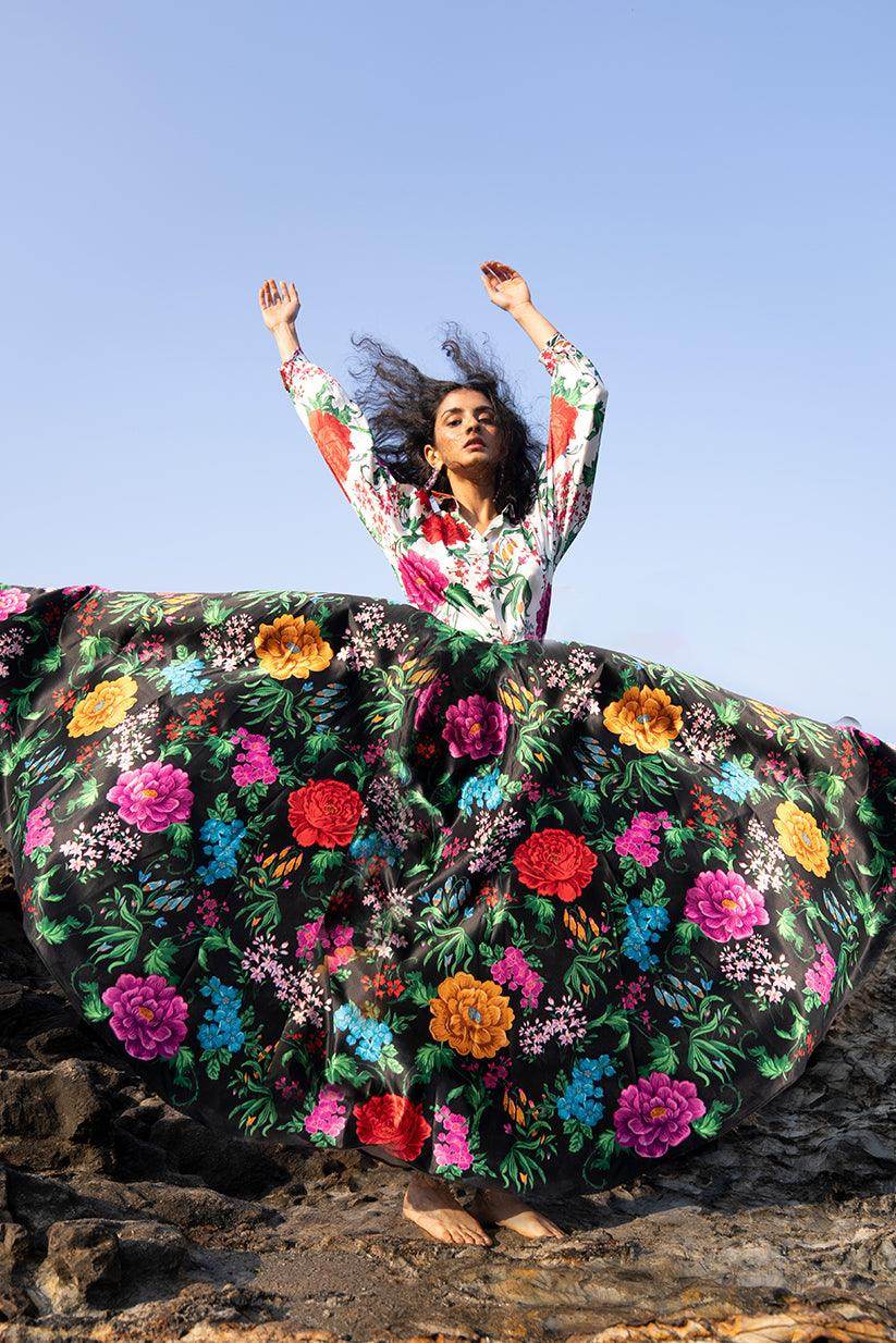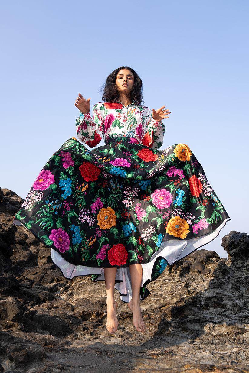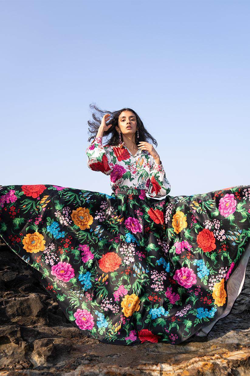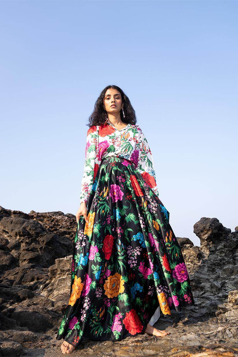 Allover multicolour floral print on a white base. Button down shirt with bishop sleeves and front button placket. Straight cut. Paired with an allover multicolour floral print on a black base maxi skirt in flowy satin with a zip closure on the side.