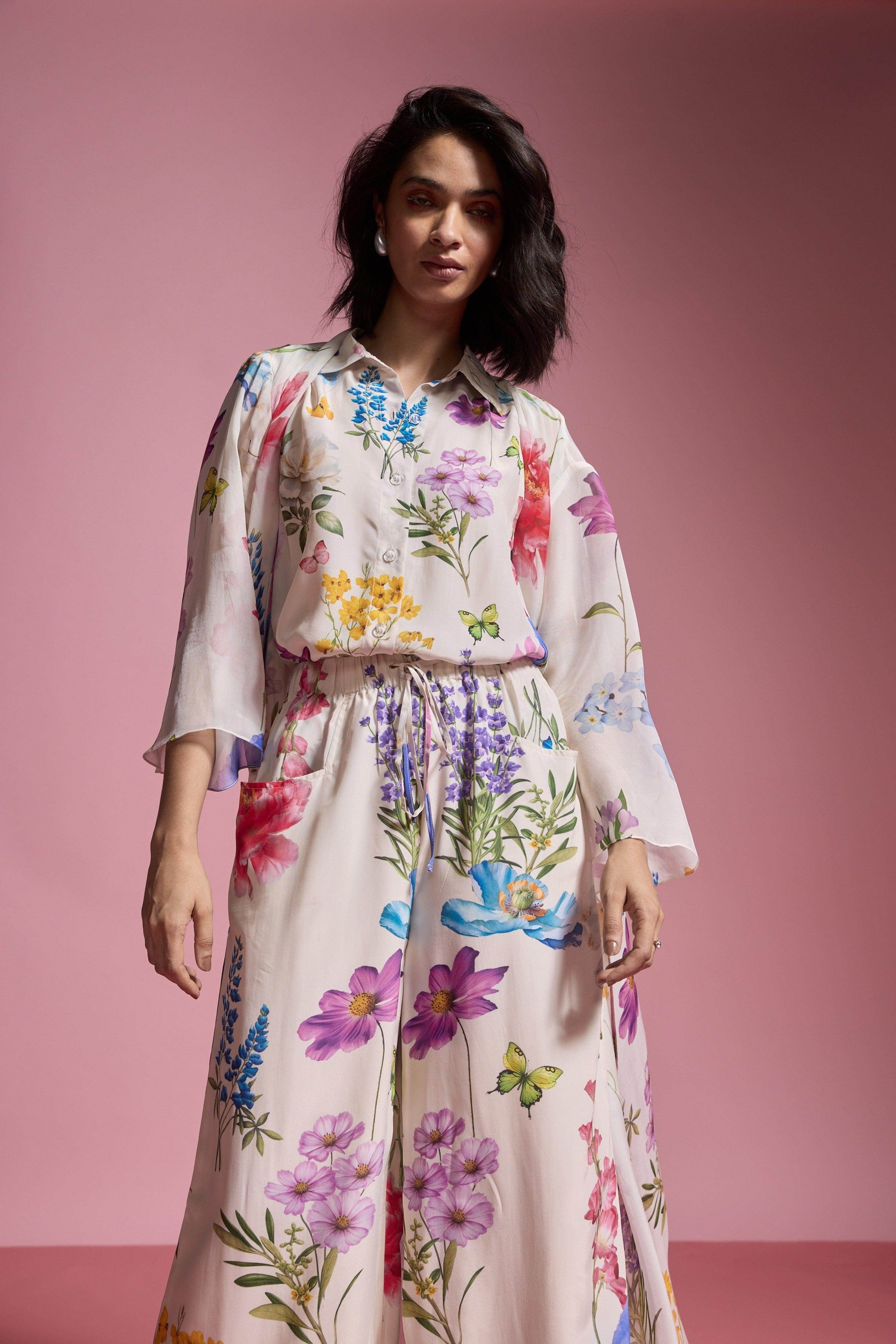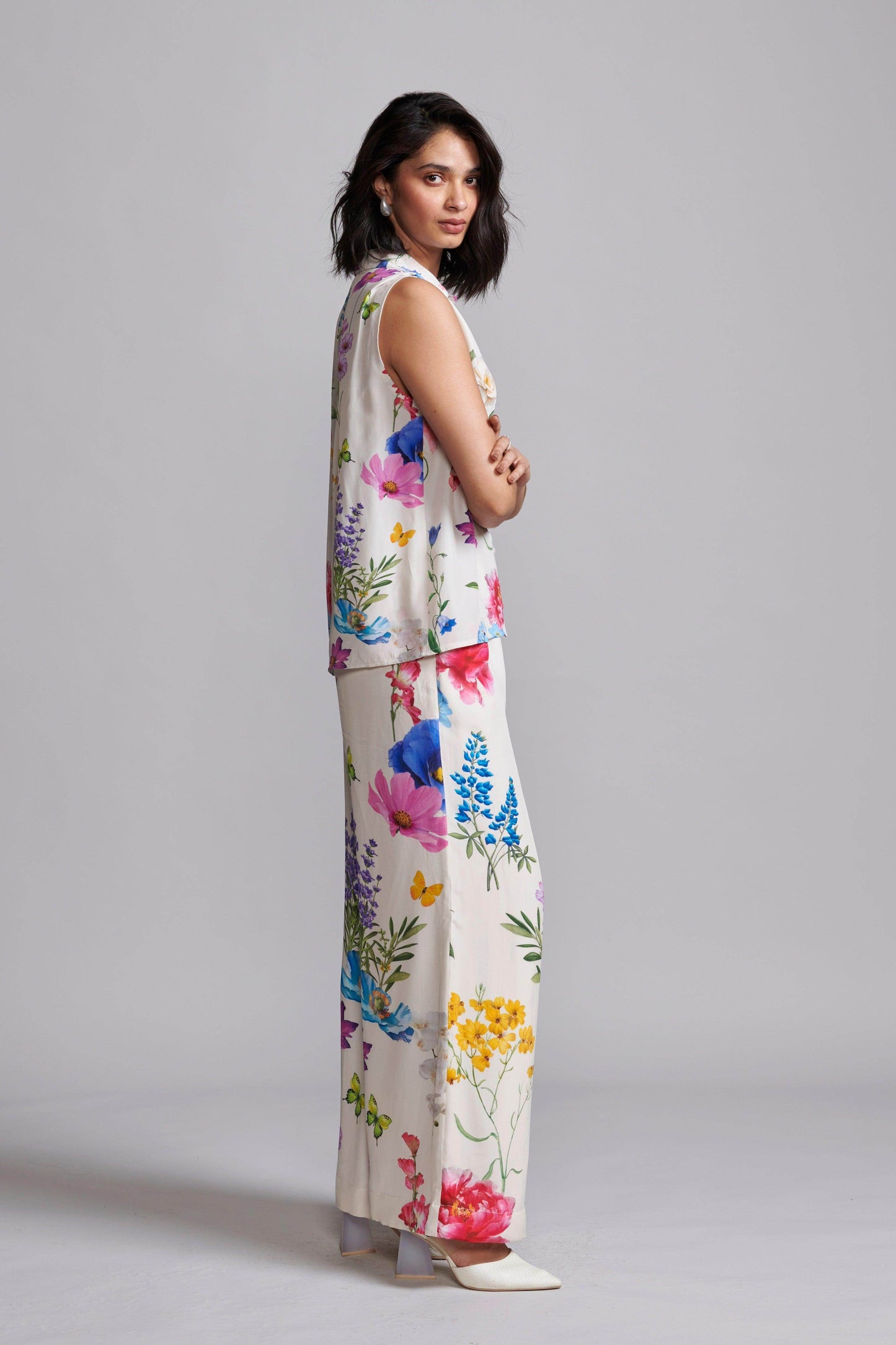 Flared pants in multi-color floral print with stylized front patch pockets. Elasticated waistband with drawstrings. Crafted from breathable viscose fabric. Fully lined.