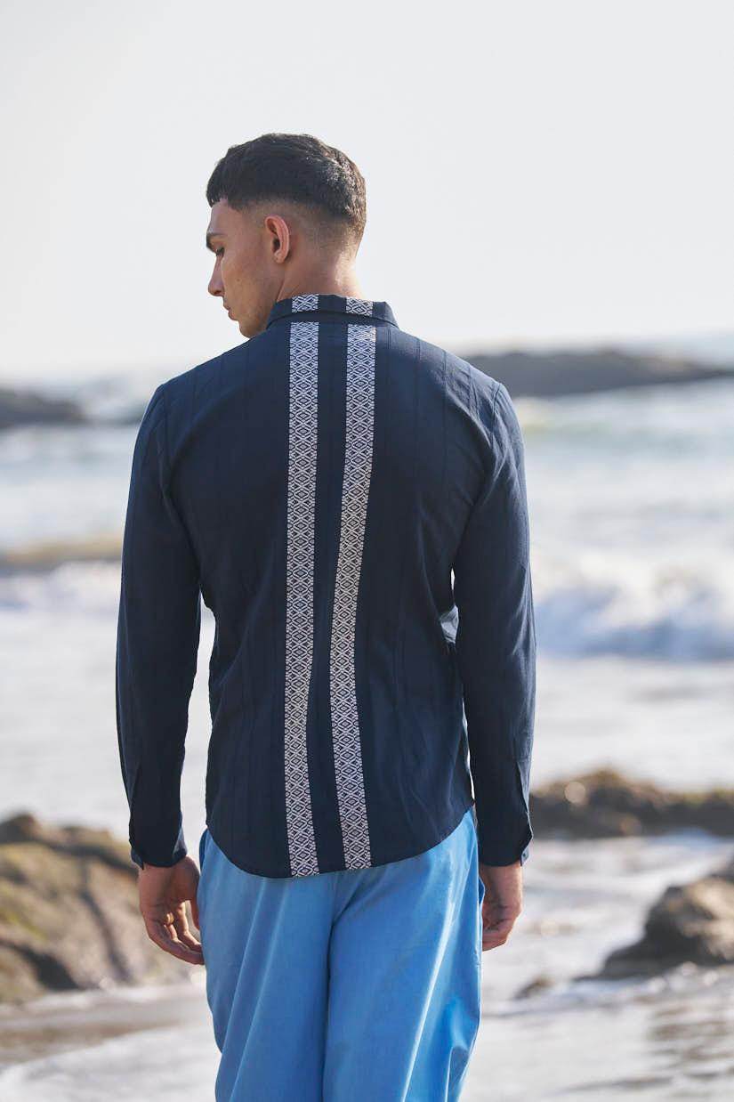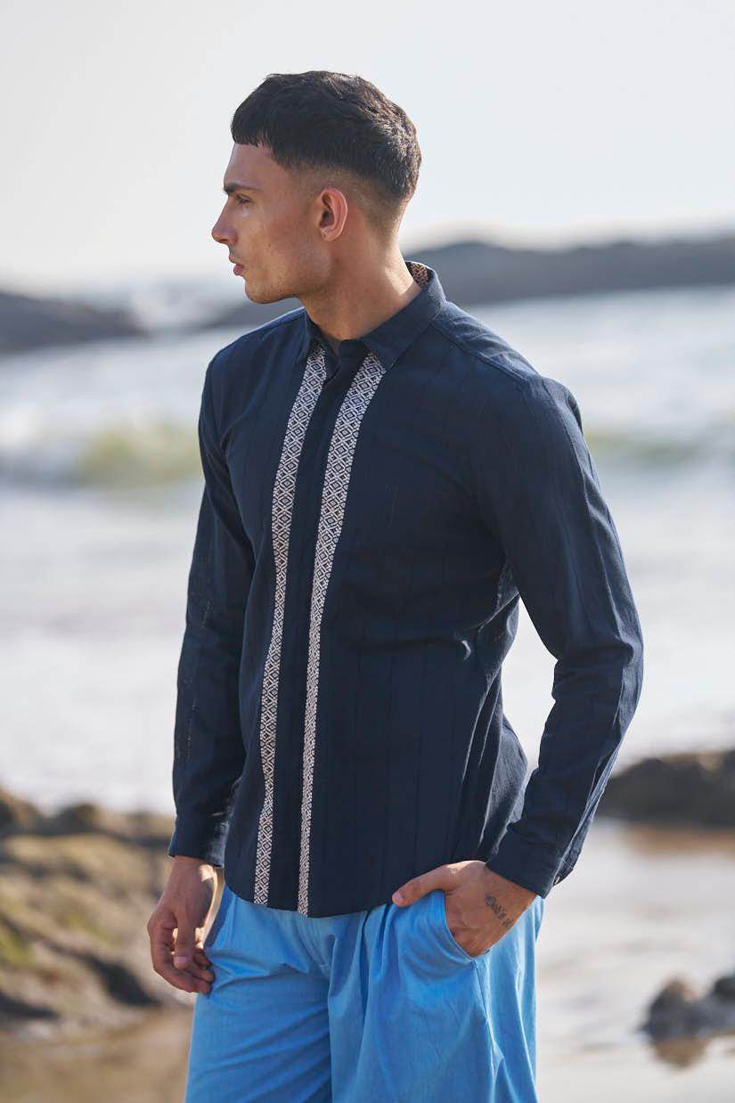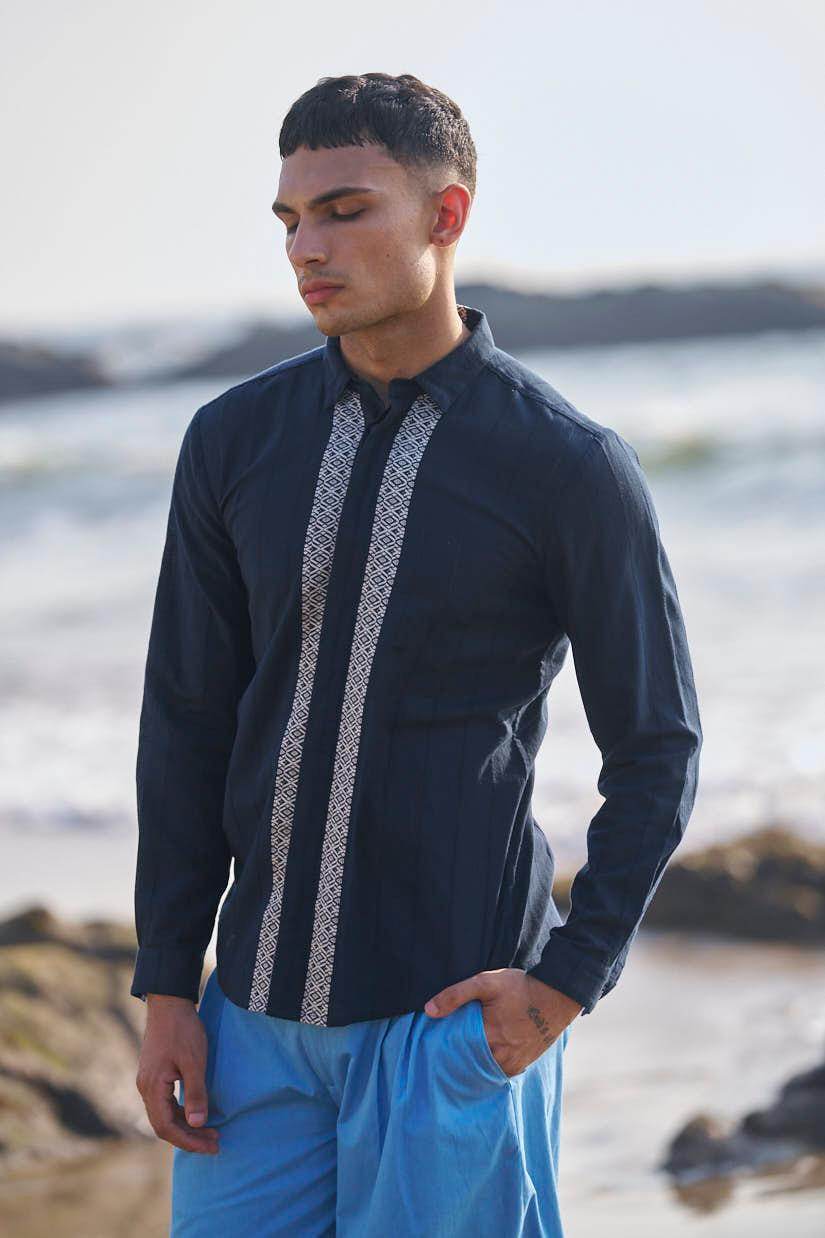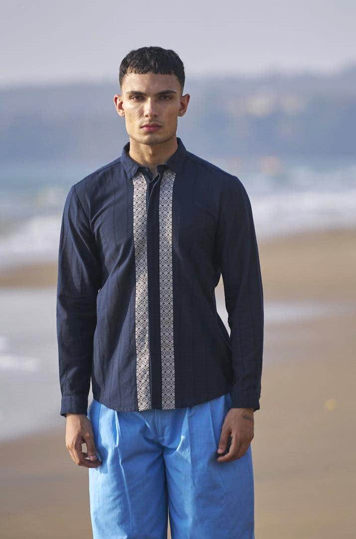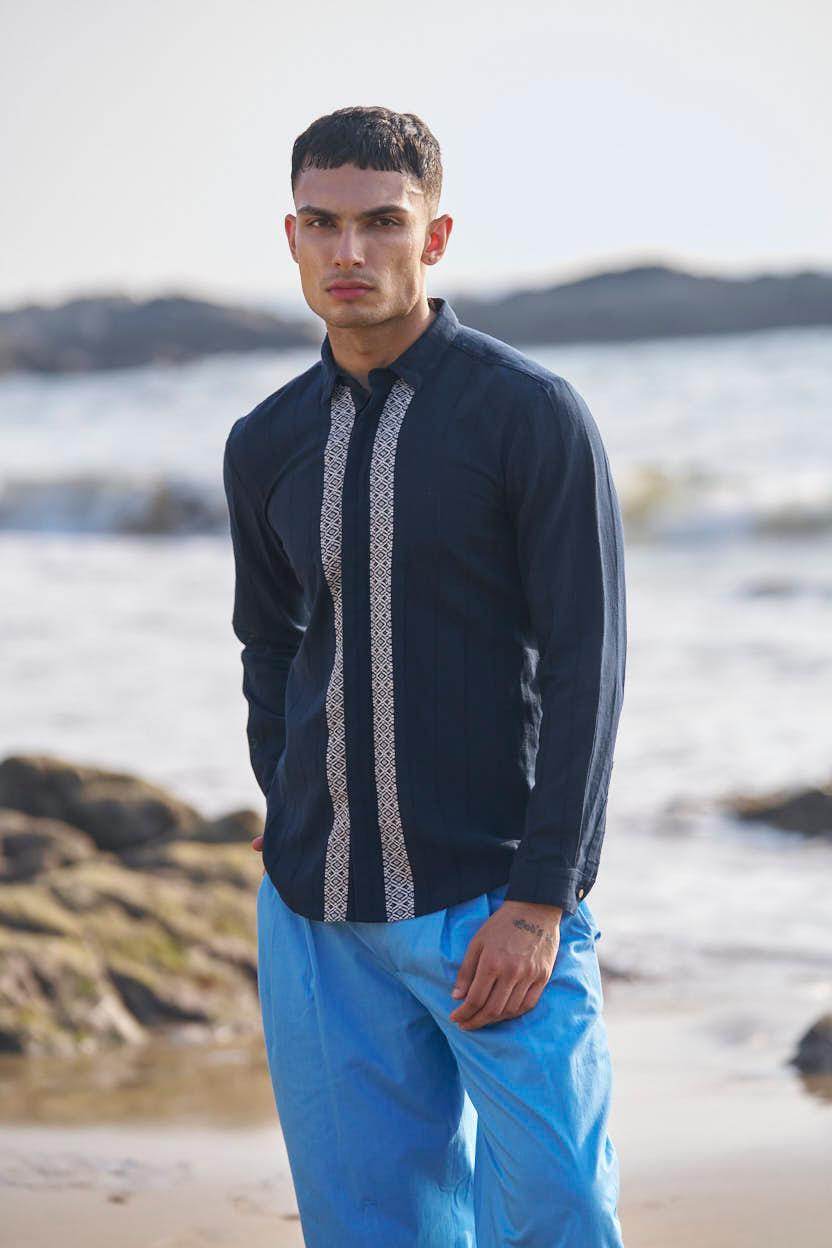 Textured navy cotton full sleeve shirt with contrast white patterned borders woven in the center front and back. Concealed button down placket.
