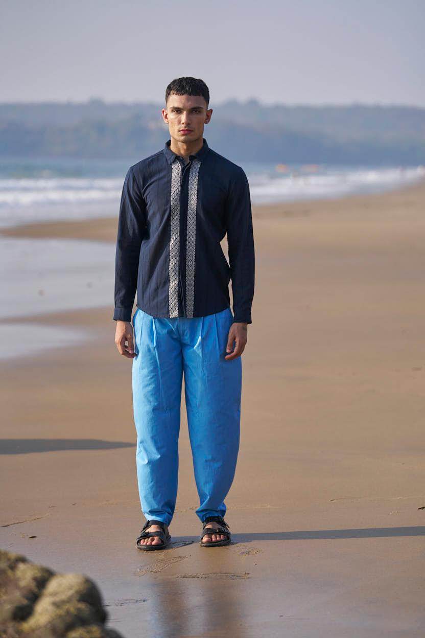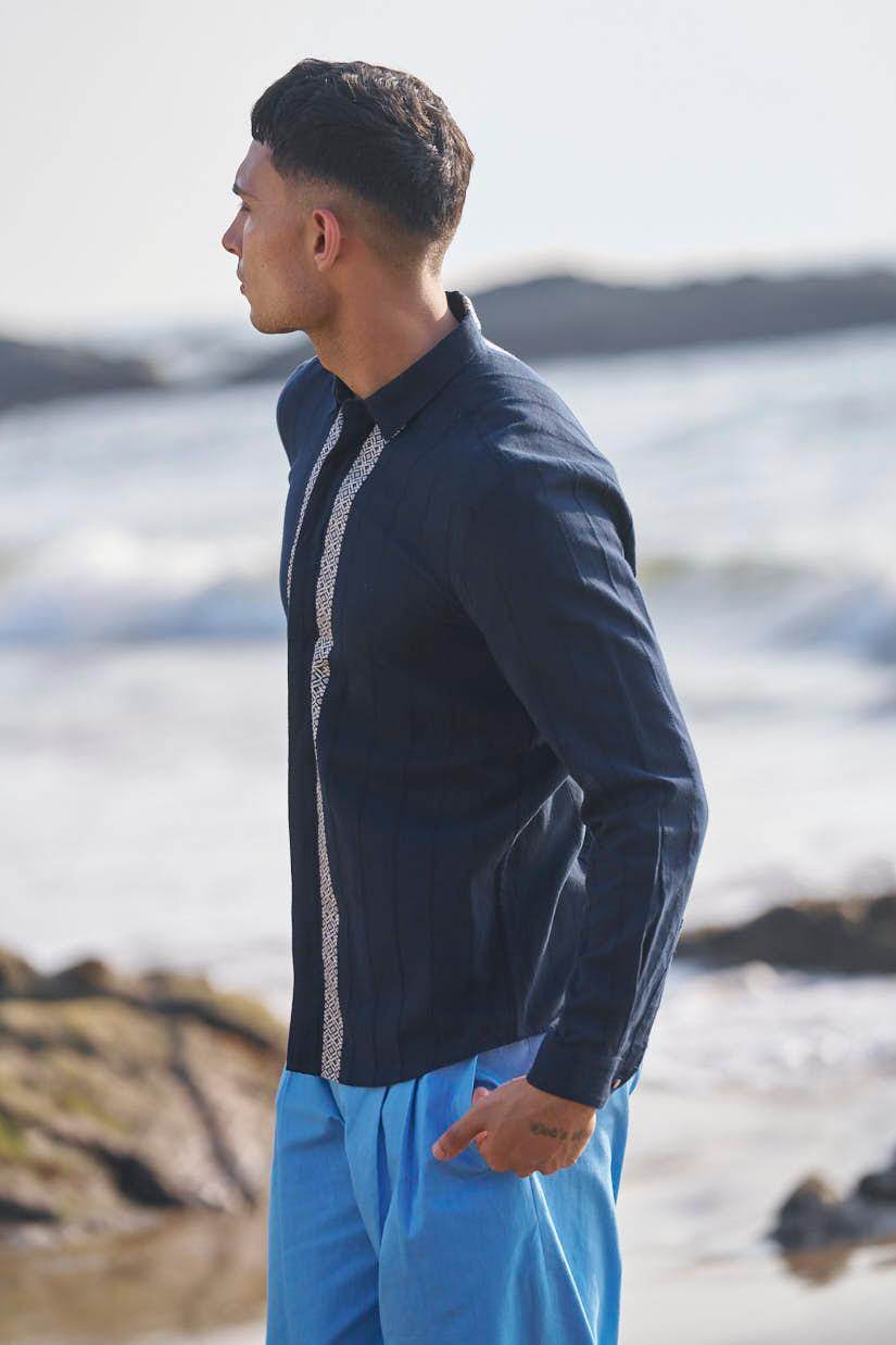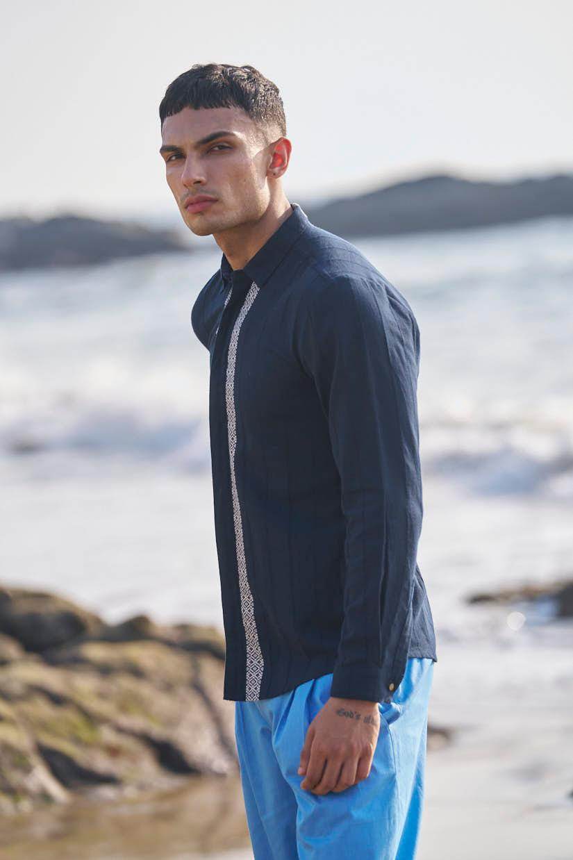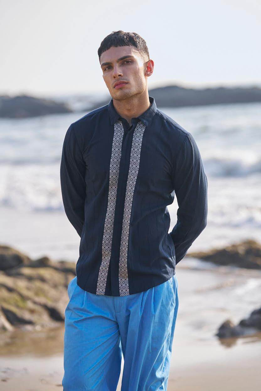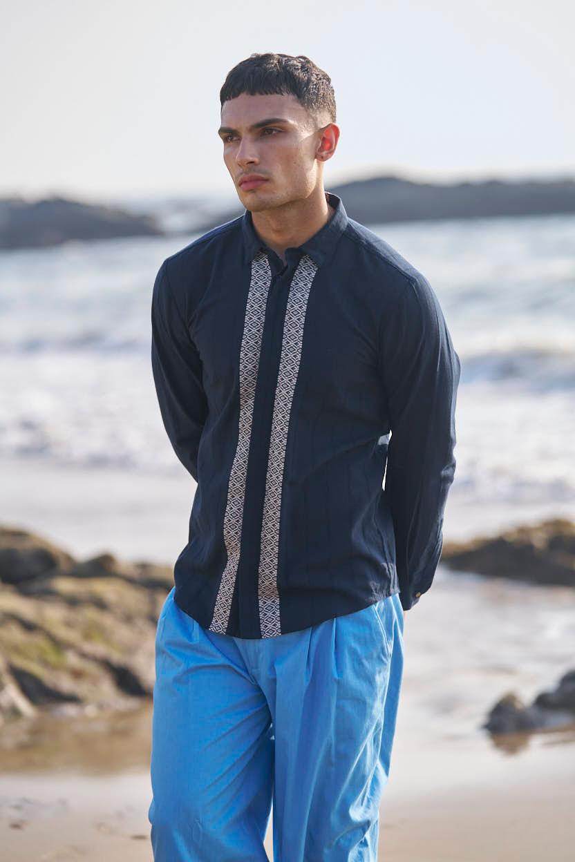 Textured navy cotton full sleeve shirt with contrast white patterned borders woven in the center front and back. Concealed button down placket.