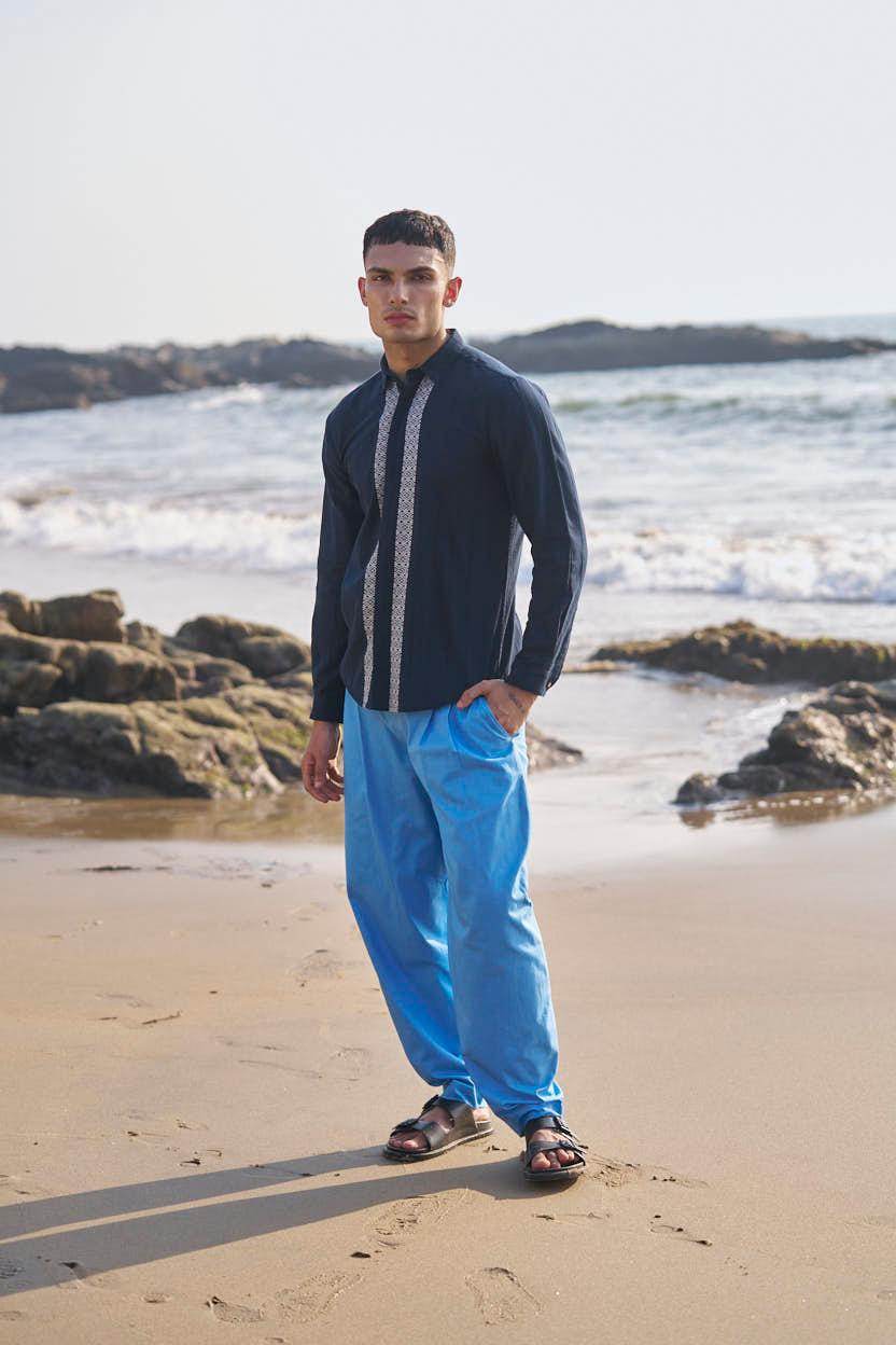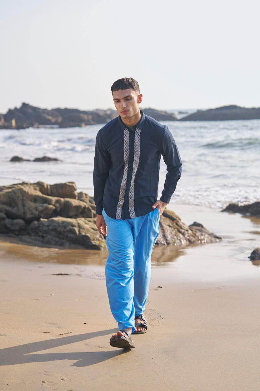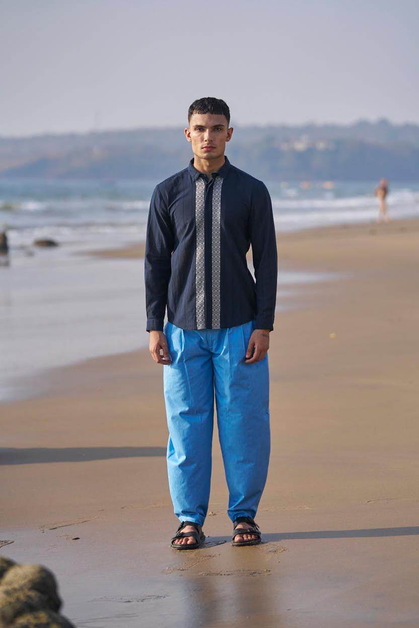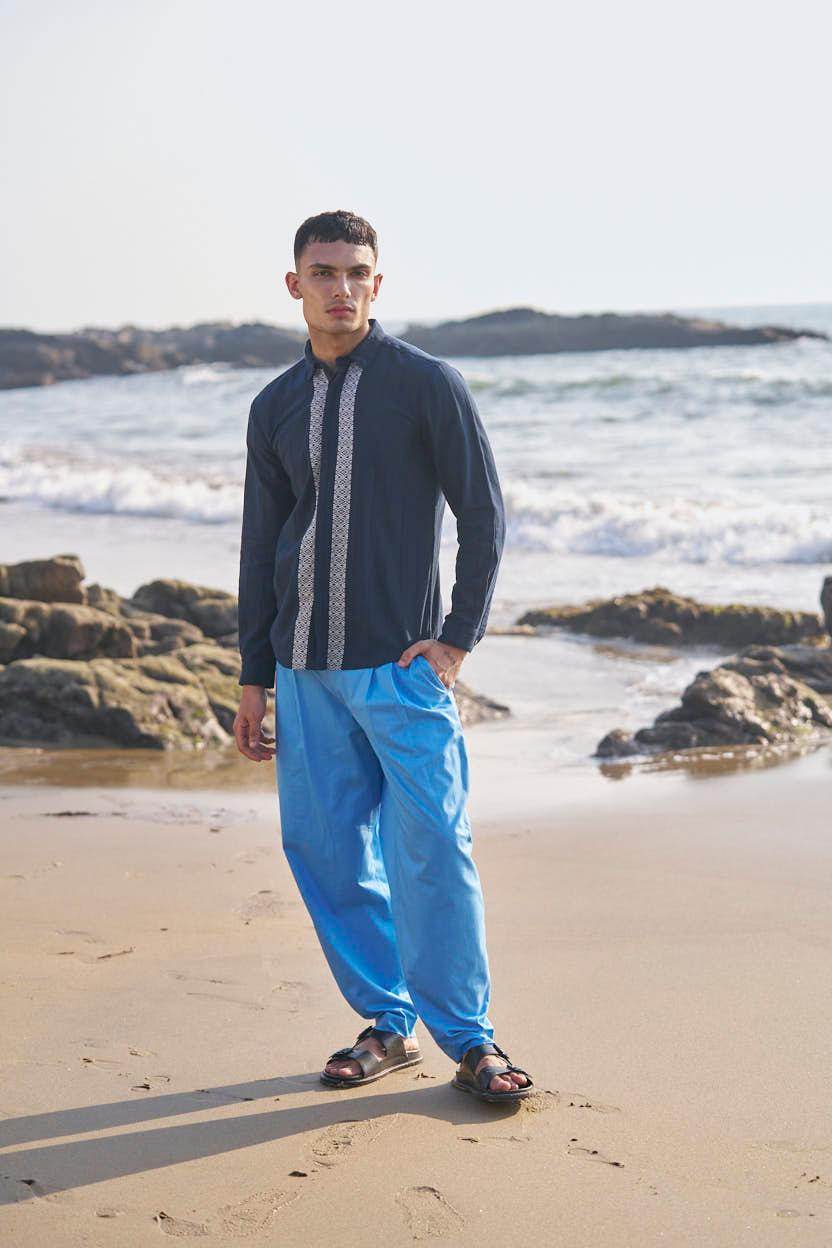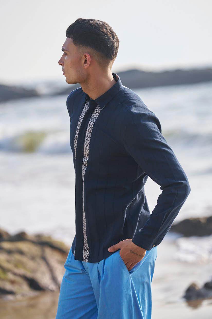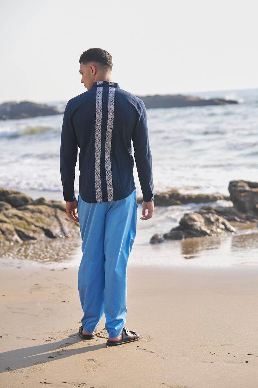 Textured navy cotton full sleeve shirt with contrast white patterned borders woven in the center front and back. Concealed button down placket.