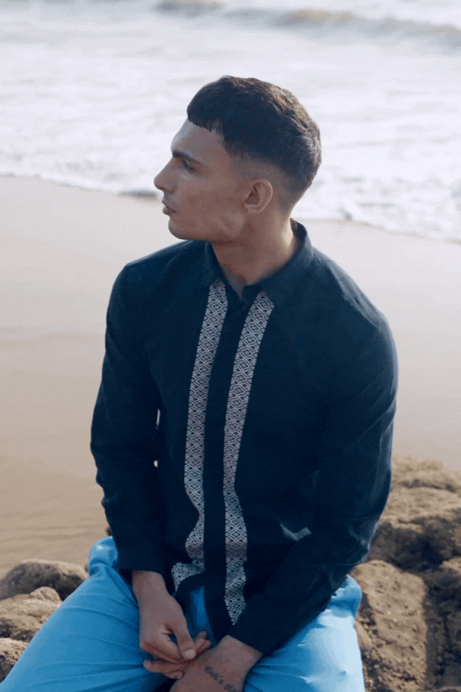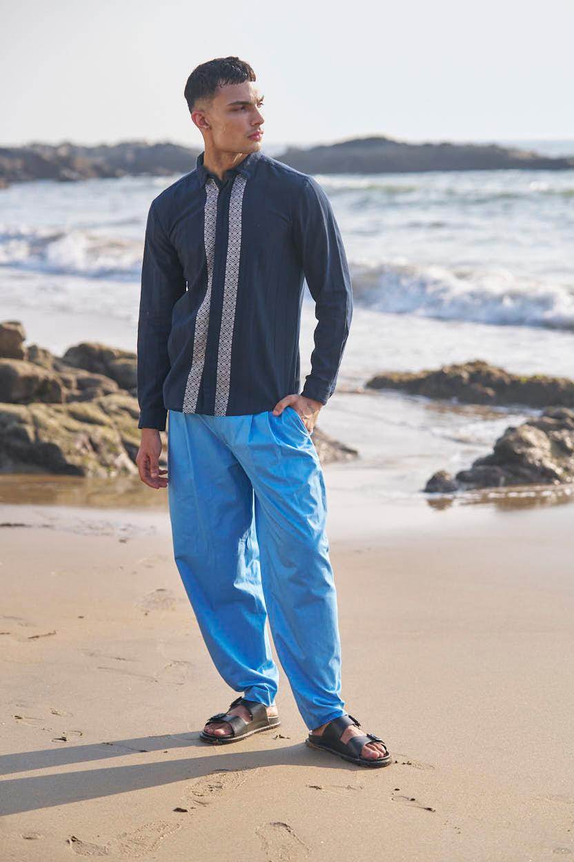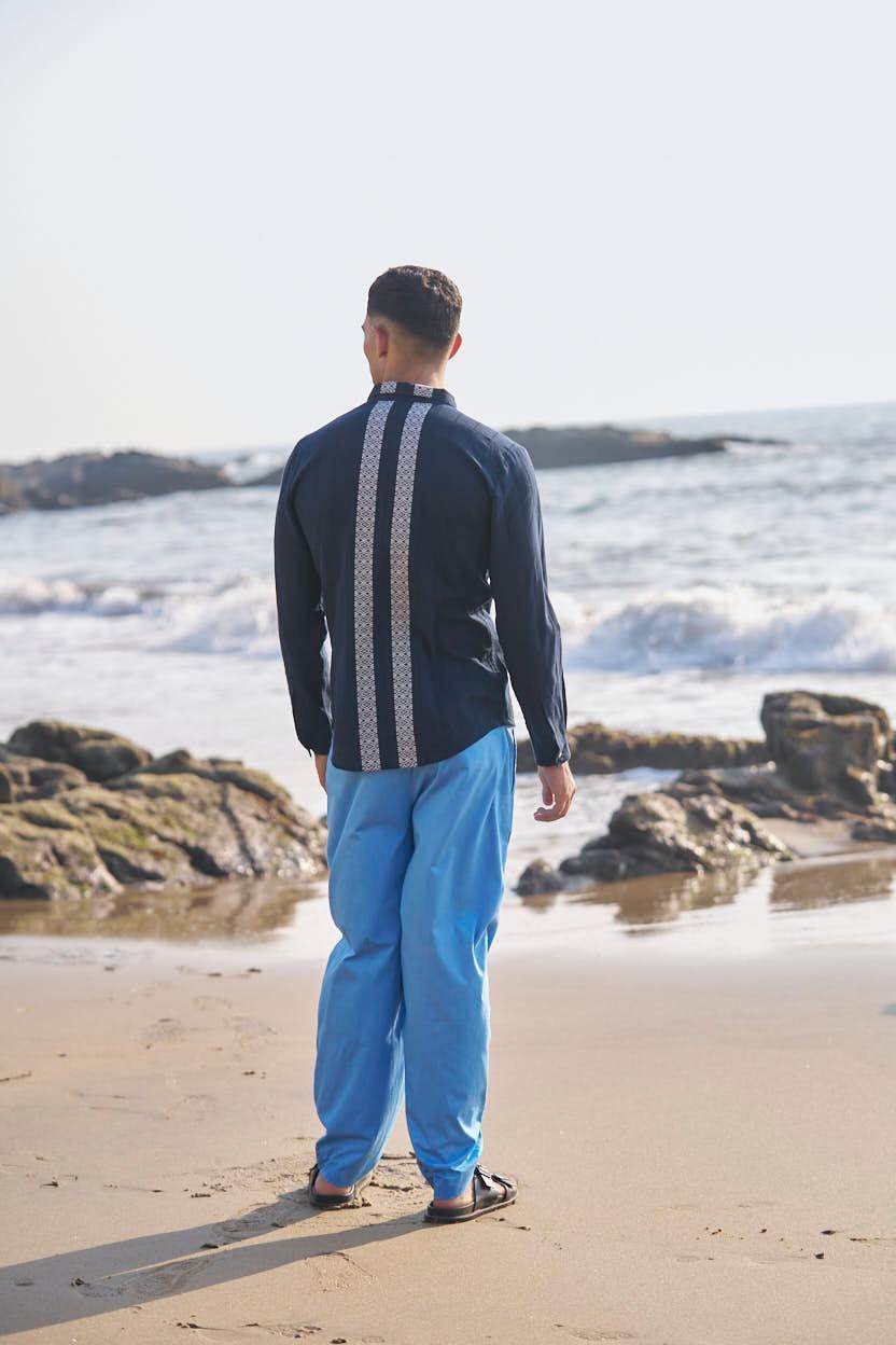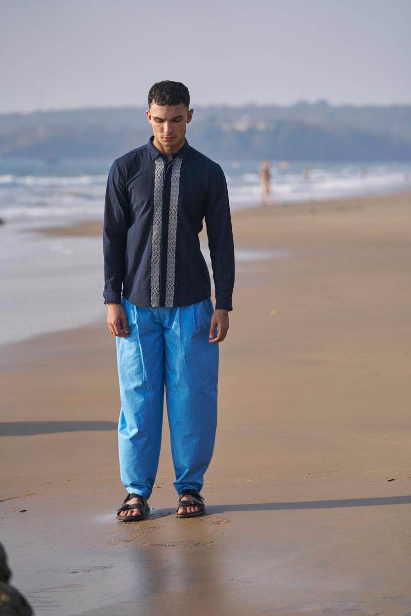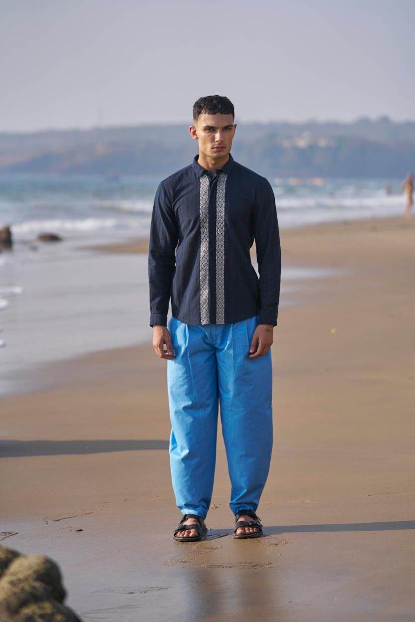 Textured navy cotton full sleeve shirt with contrast white patterned borders woven in the center front and back. Concealed button down placket.