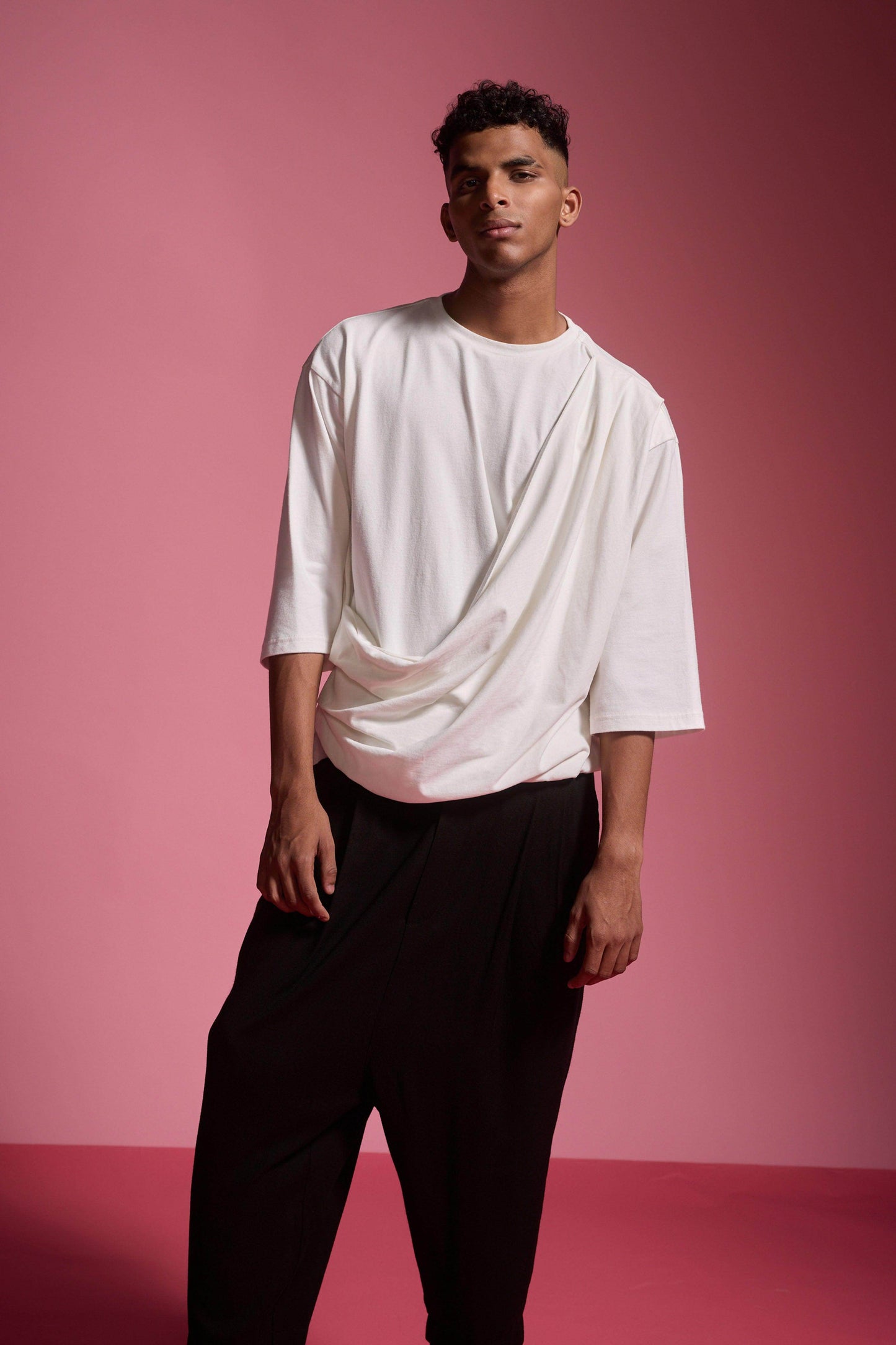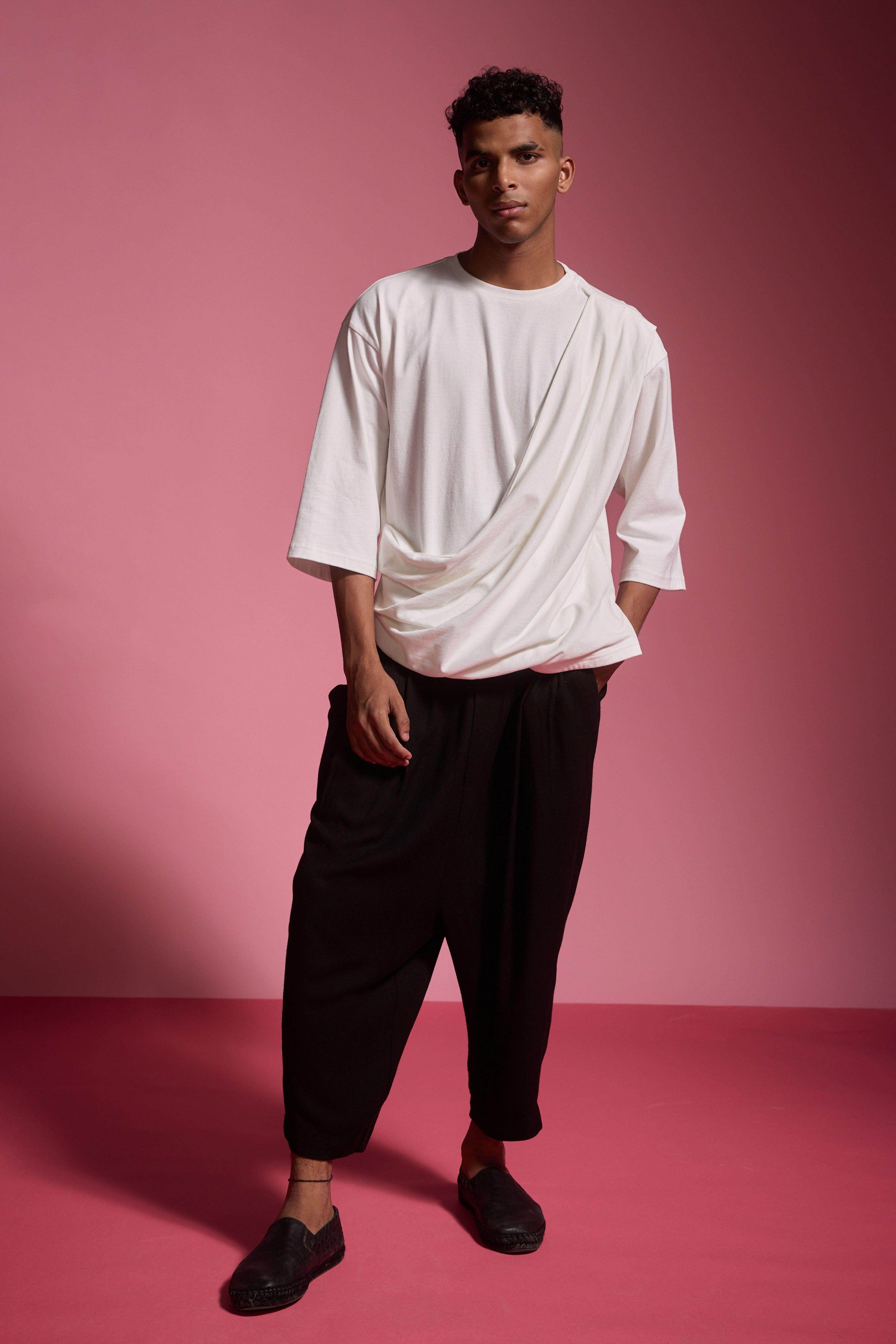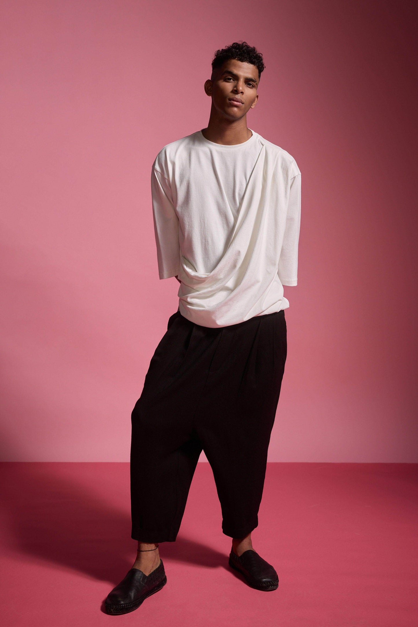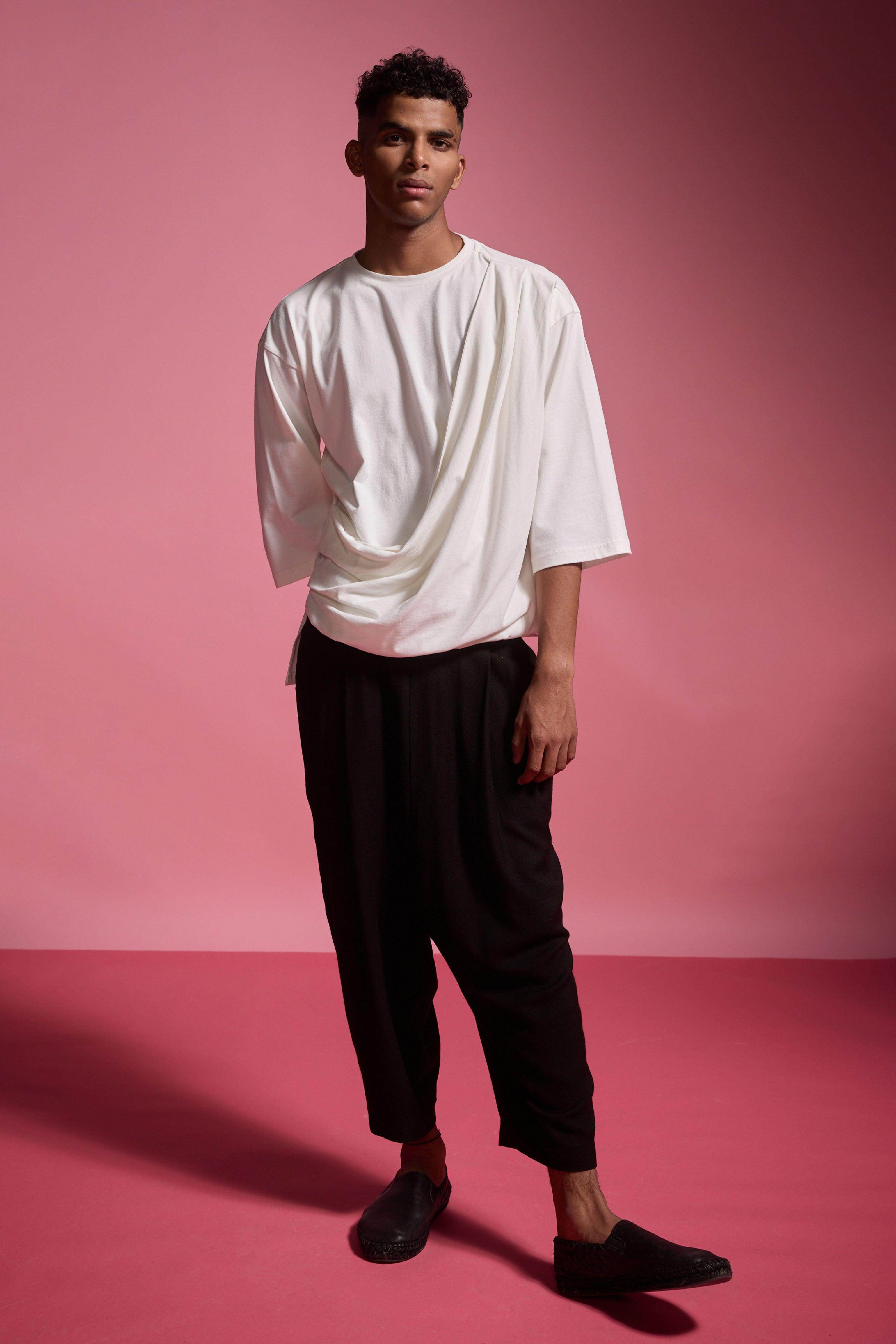 Black architectural pants in textured, natural, breathable organic viscose. Features hand-sewn pleats in the front, elasticated waistband with drawstrings, and belt loops. Side and back pockets. Cropped length.