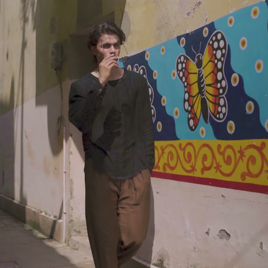 Black popover shirt in slub textured fabric. Raw hem detailing at the neckline, sleeve cuffs, and front and back hem of the shirt. Full sleeves with button closure at the cuffs. Long on the front and back with a shorter side panel. aired with complementing brown jogger pants in textured slub fabric. Pockets on the side and back. Elasticated at the waist and cuff.