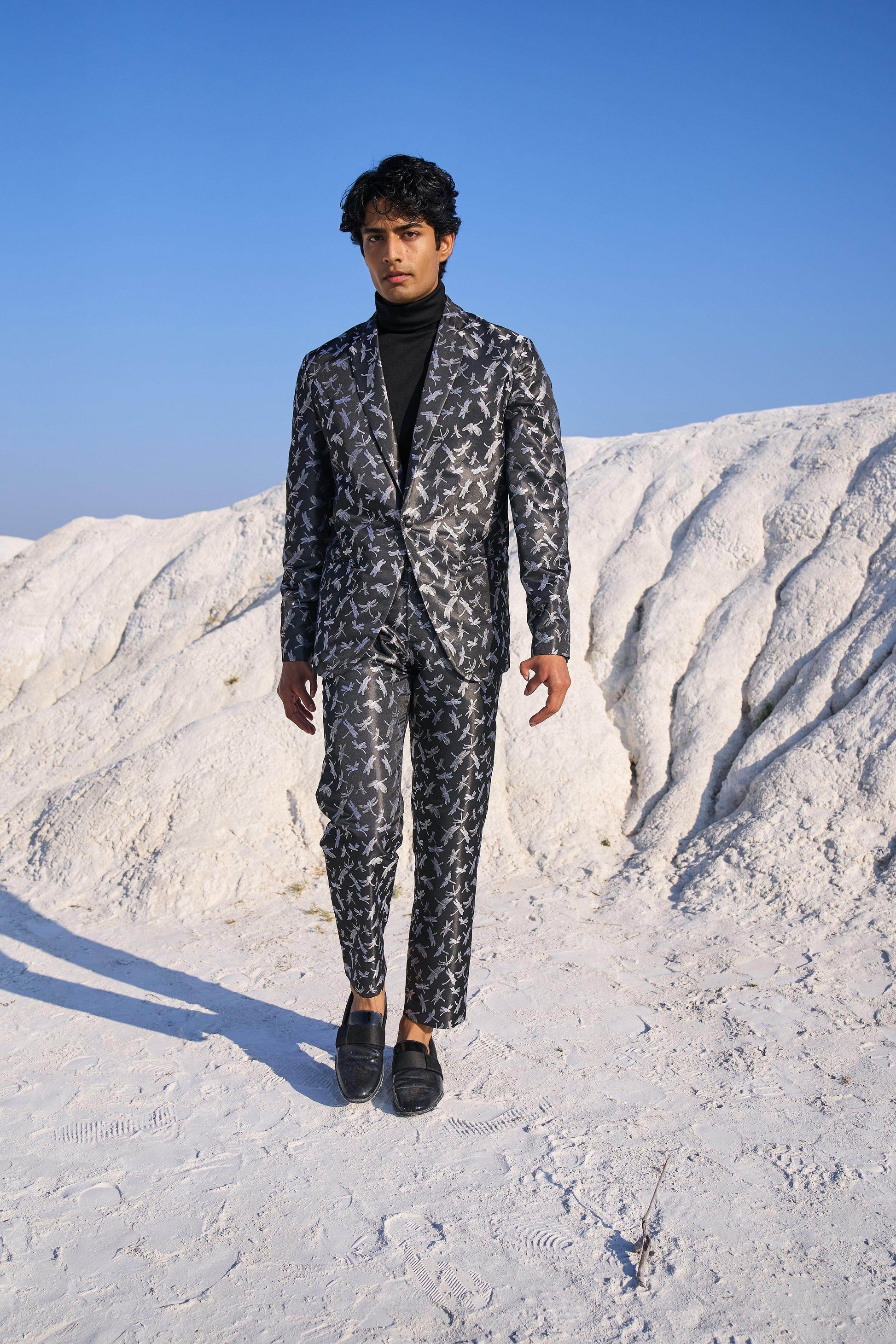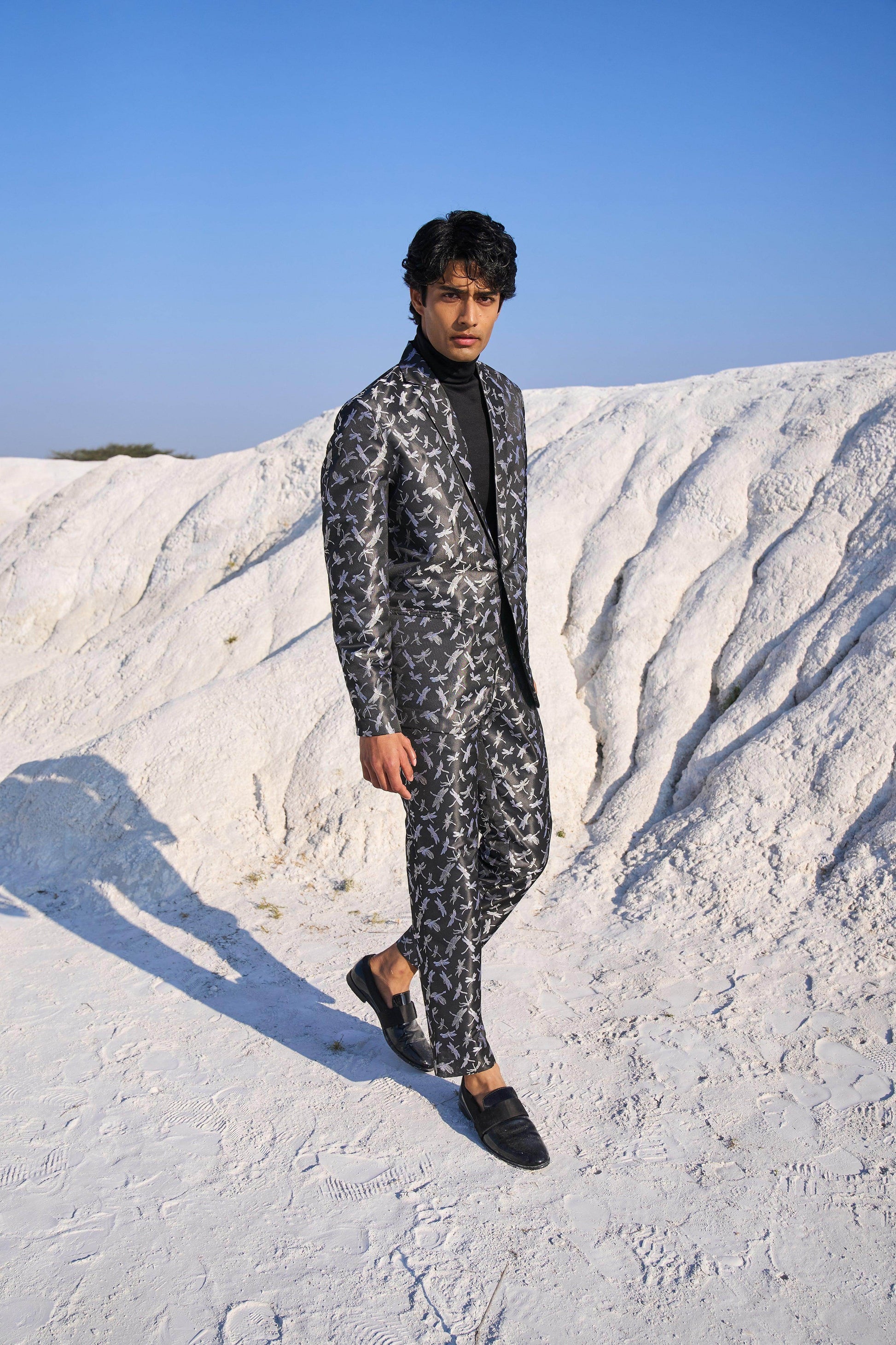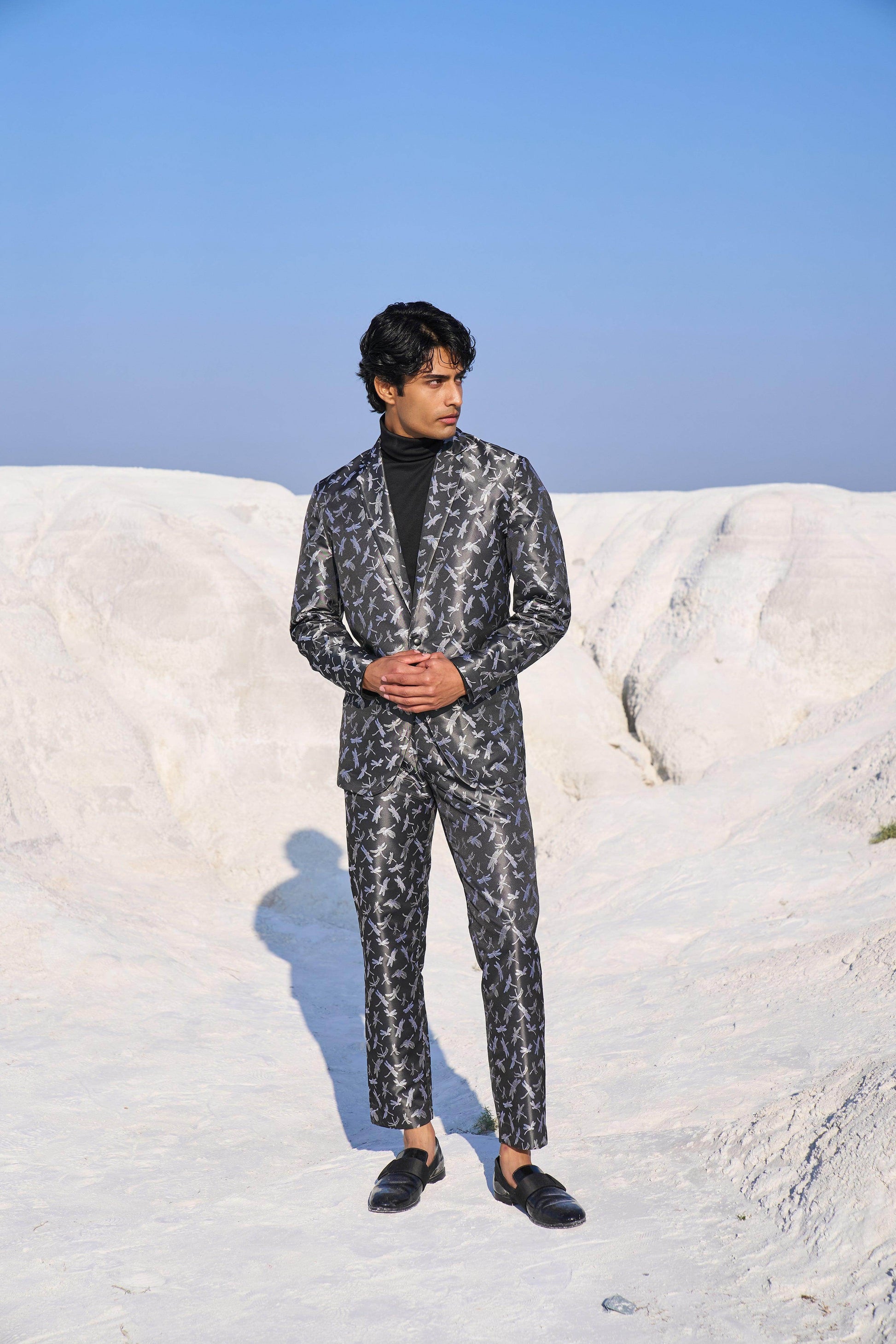 Dragon fly patterned black blazer set jacket in soft brocade style jacquard. Blazer has single button closure and pockets at the front. Paired with matching pants. Zip closure at the front, belt loops. Pockets on the side and back.