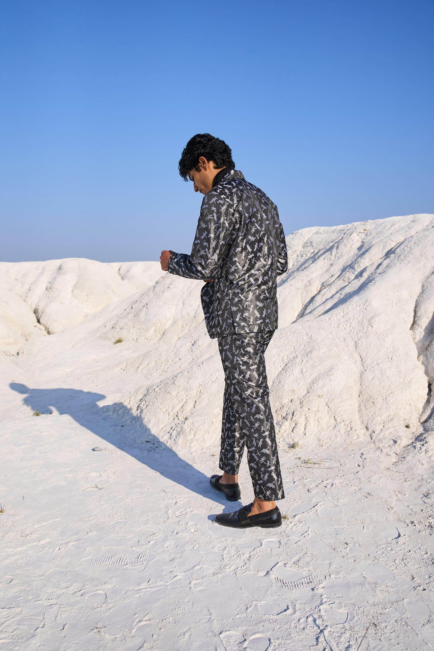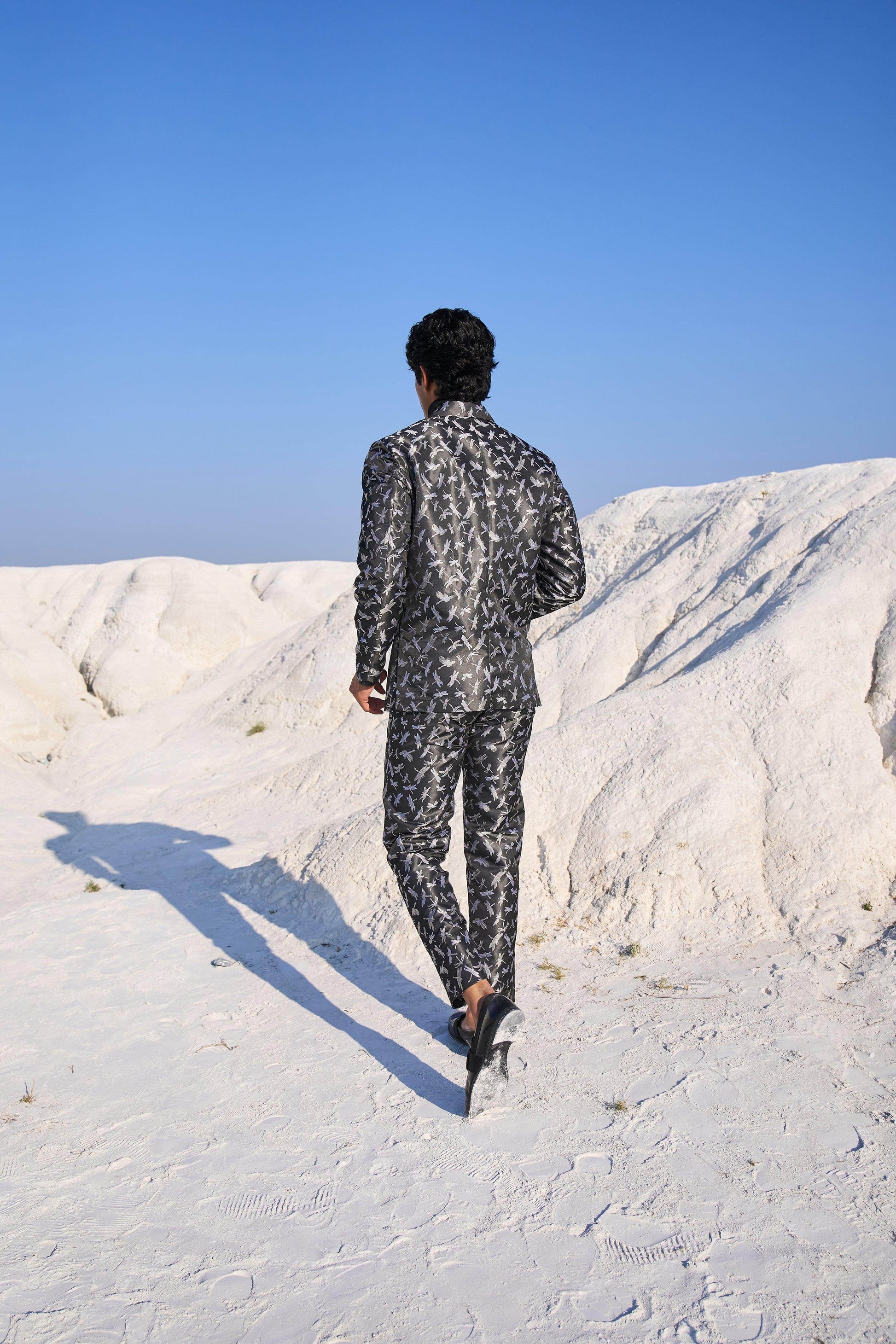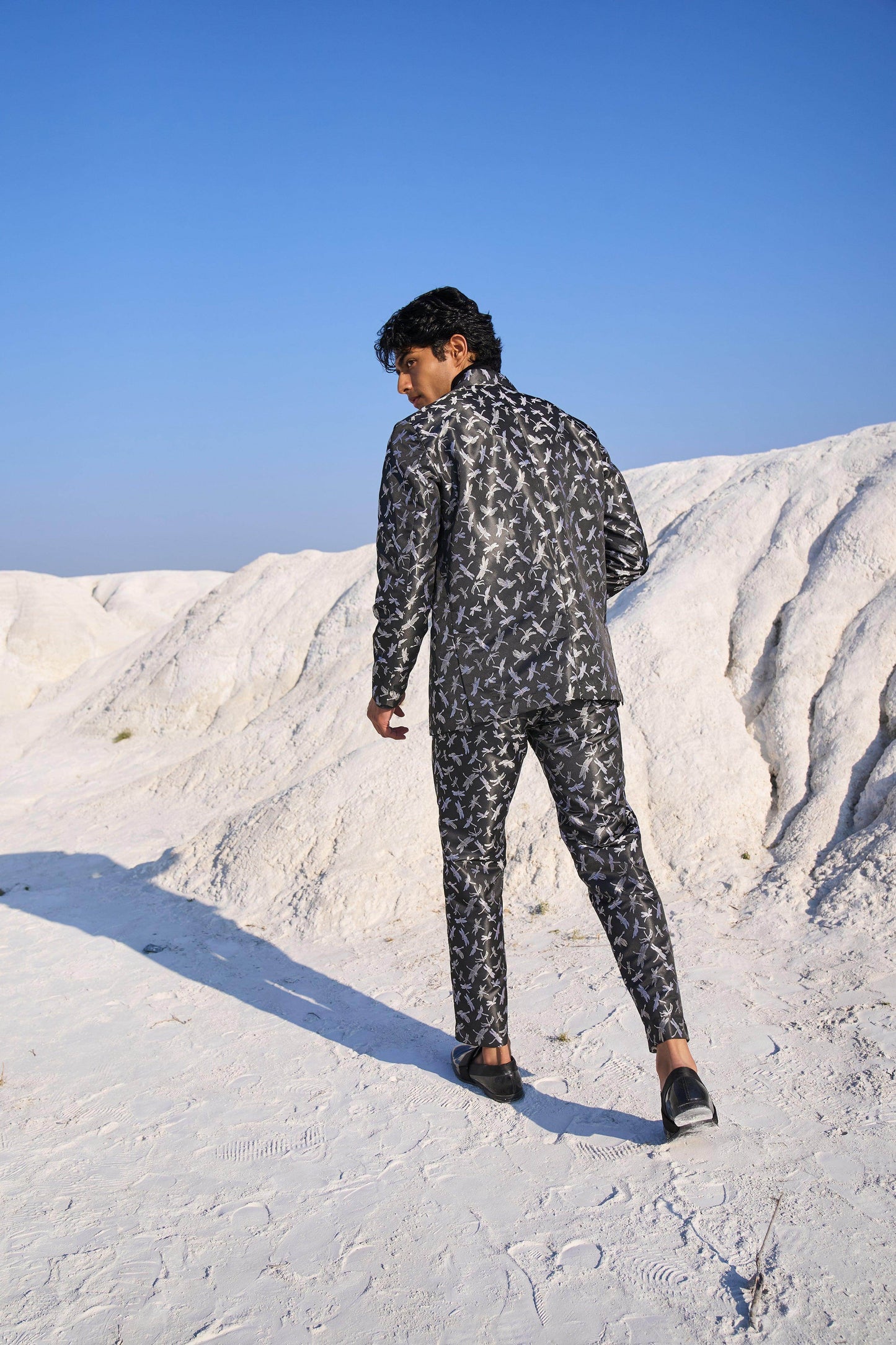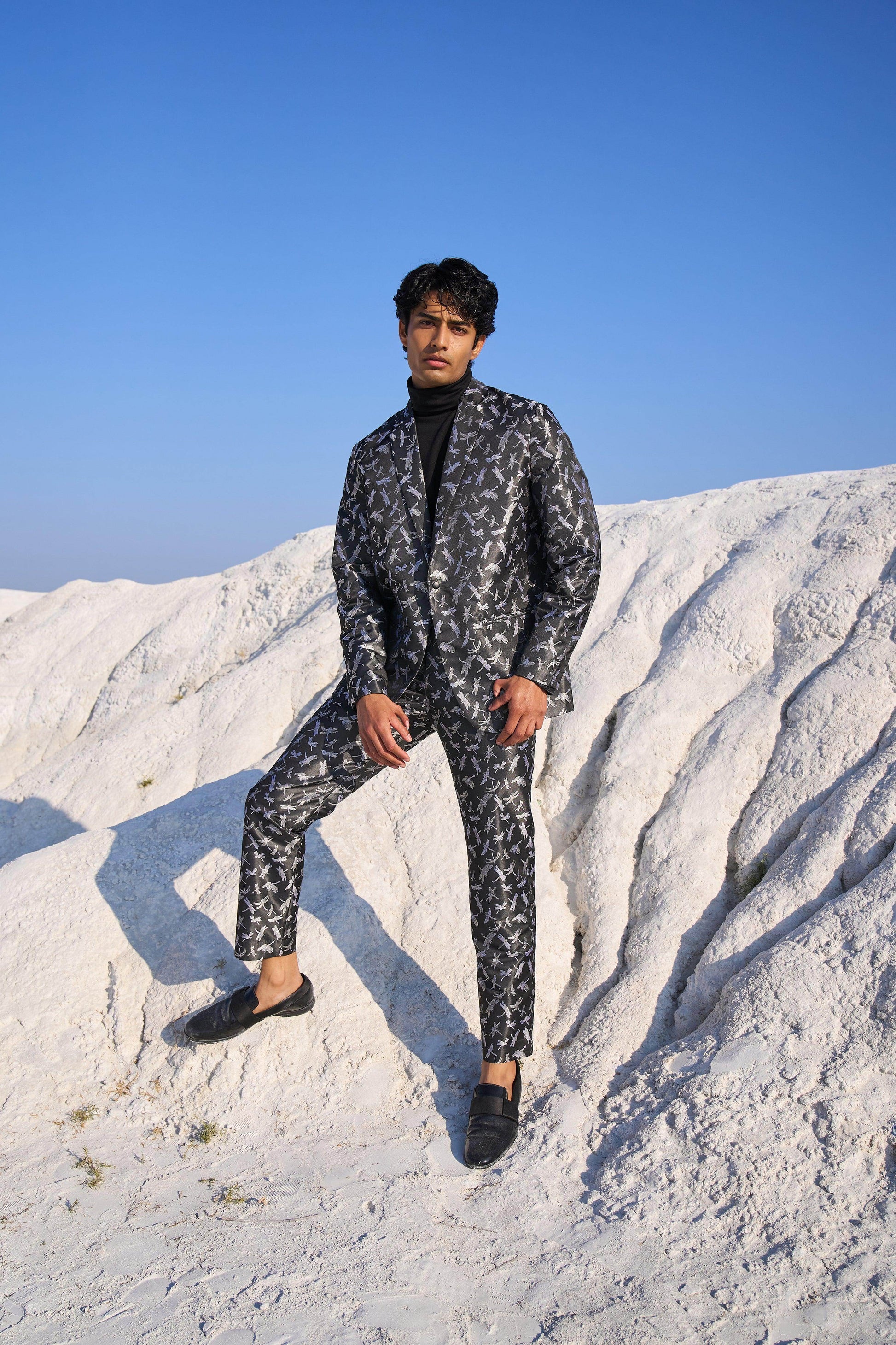 Dragon fly patterned black blazer set jacket in soft brocade style jacquard. Blazer has single button closure and pockets at the front. Paired with matching pants. Zip closure at the front, belt loops. Pockets on the side and back.
