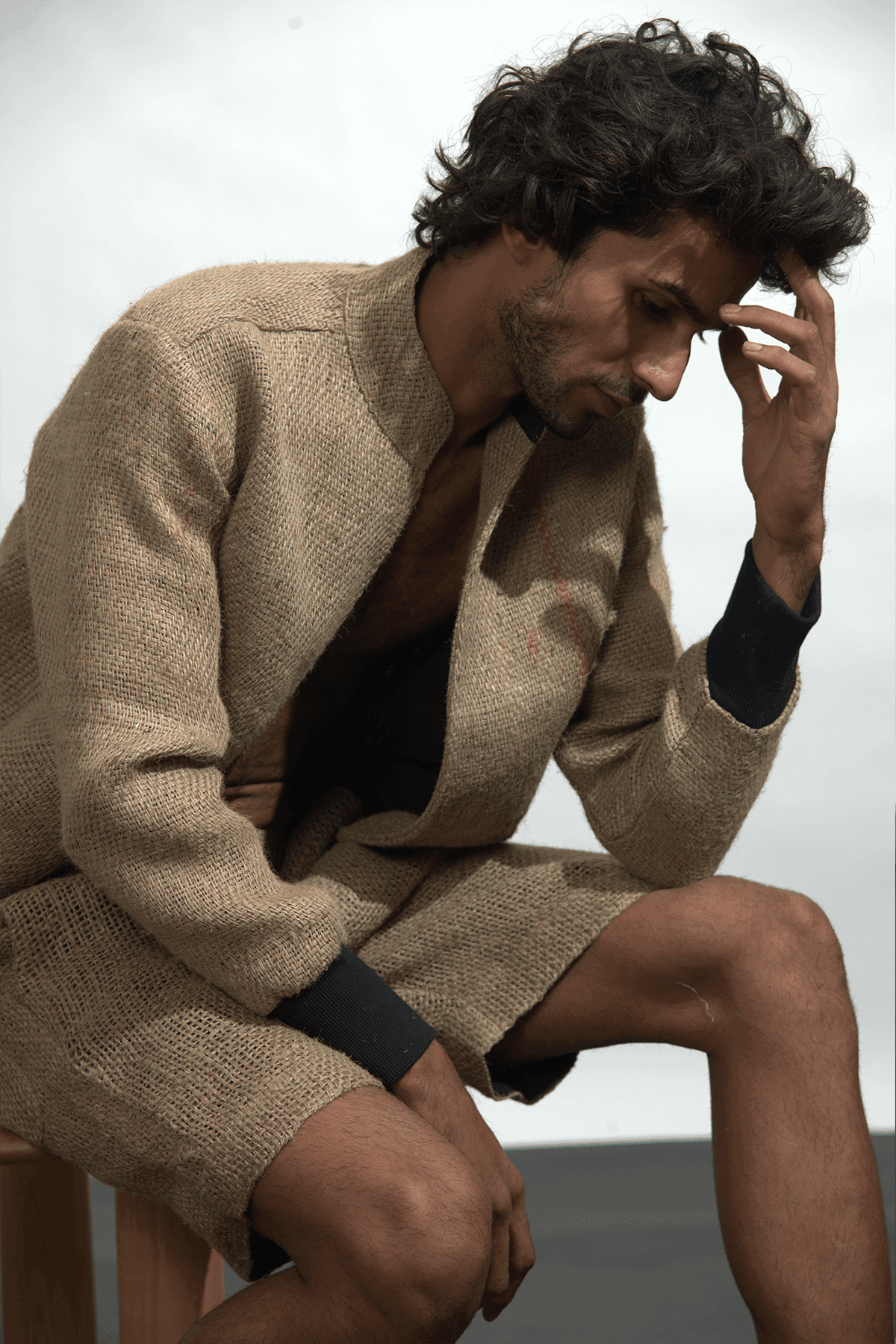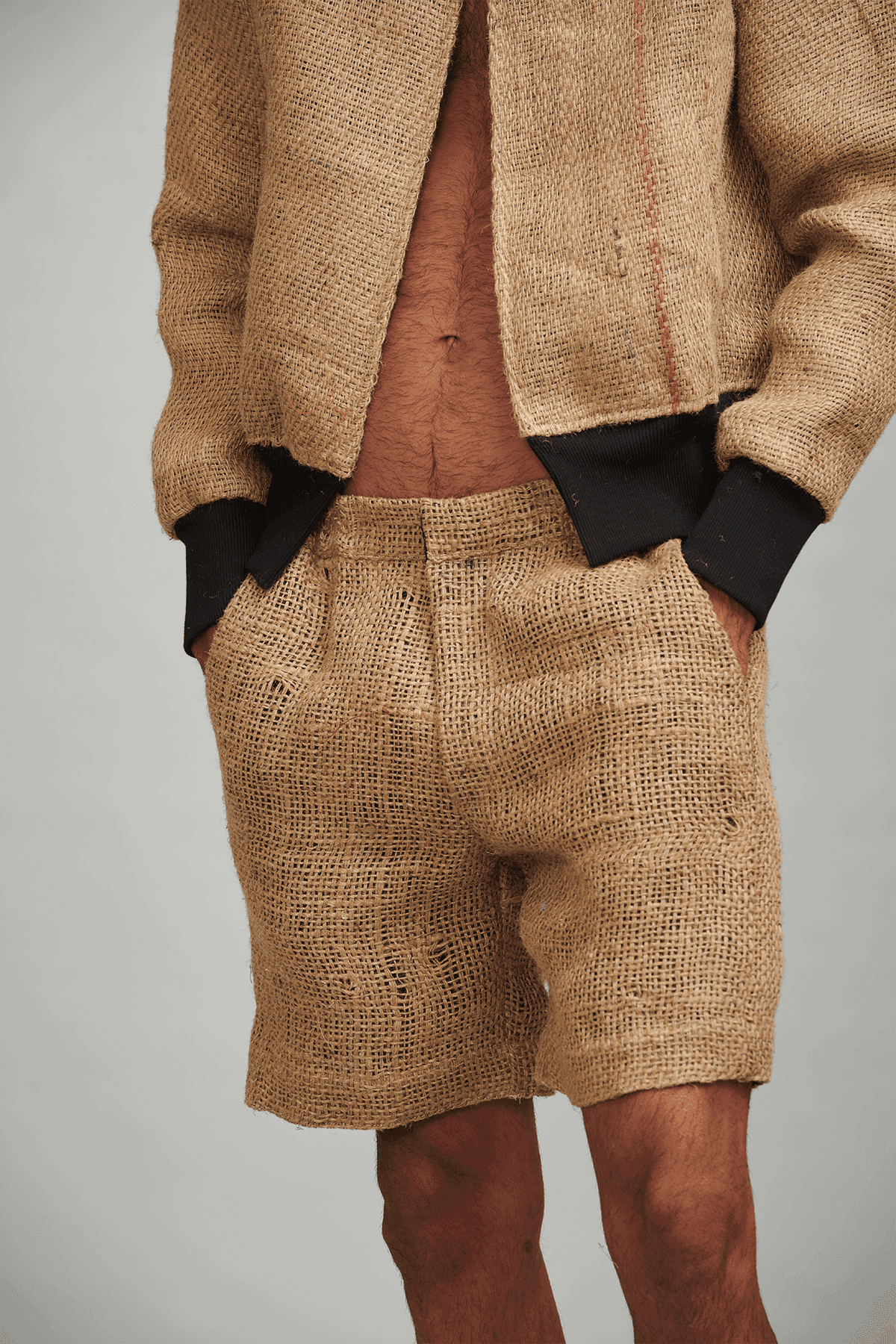 Jute gunny bags have been upcycled into shorts with pockets in the side and back. The garment is fully lined in cotton. Our conversational piece on sustainability.