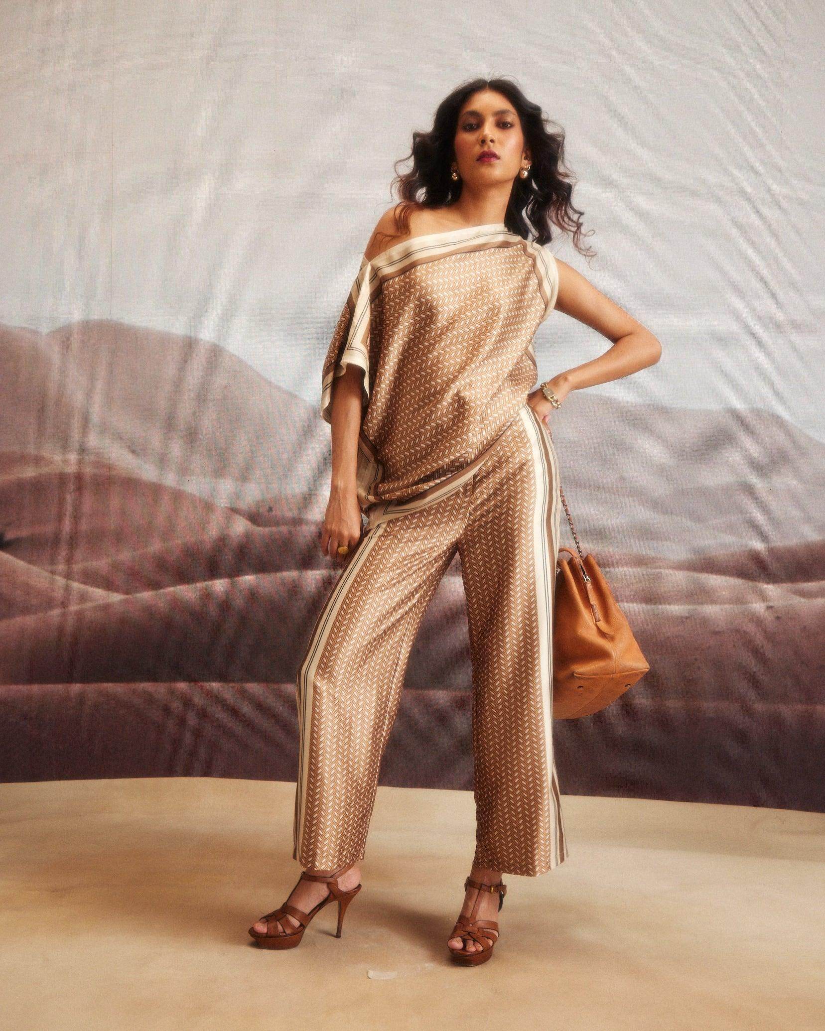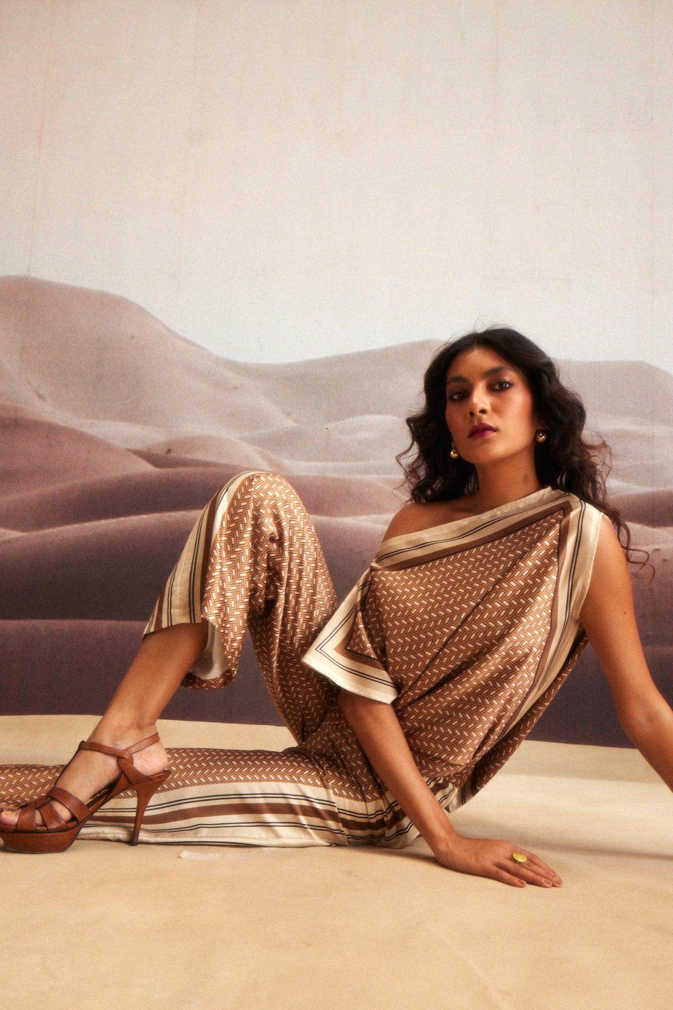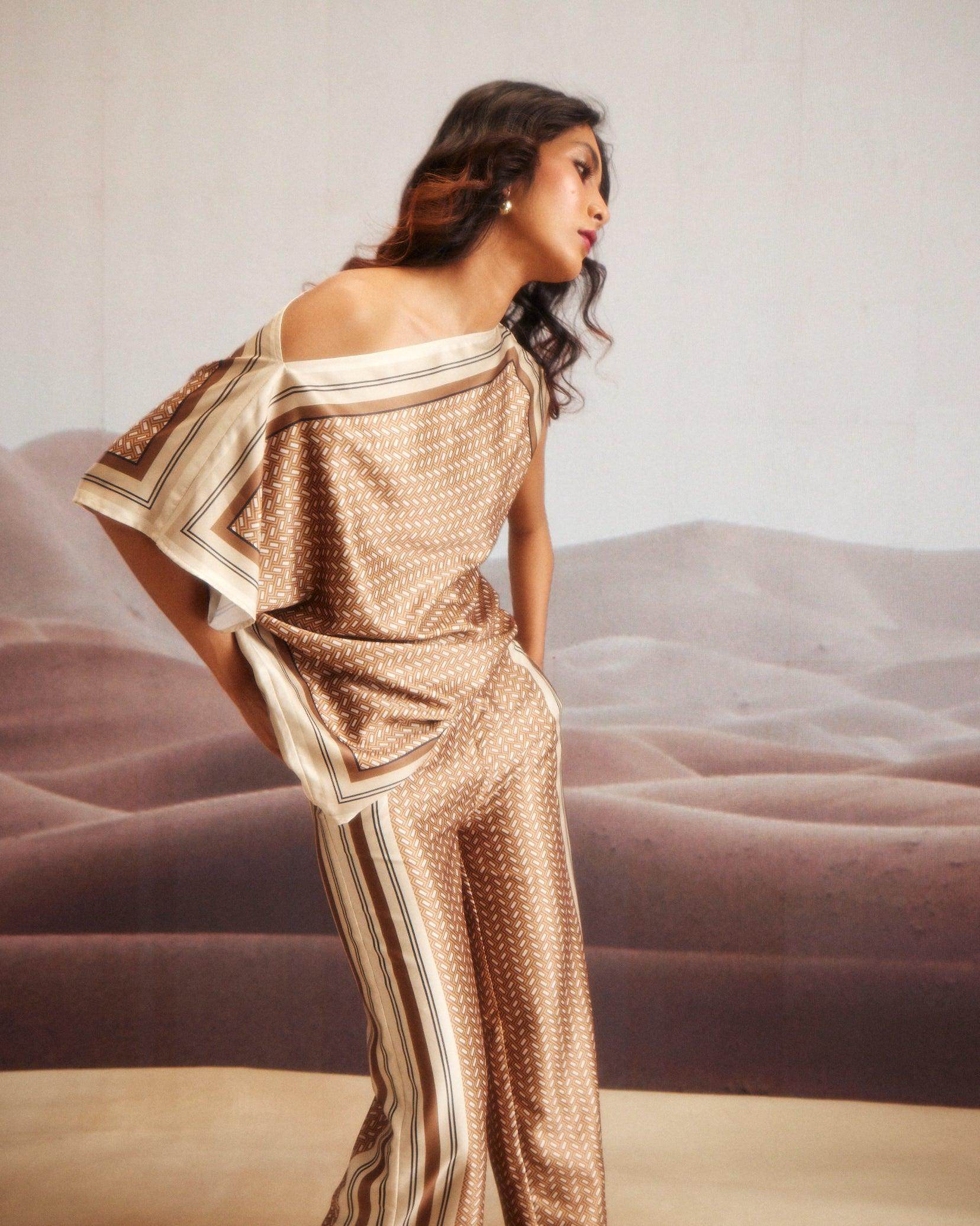 Geometric printed top in shades of beige and khaki with contrasting placed borders outlining the top. Kaftan style details and be worn two ways - as one shoulder scarf top or off shoulder. Paired with matching straight pants. Semi-elasticated at the waist, pockets on the side. Hook and zip closure at the front.