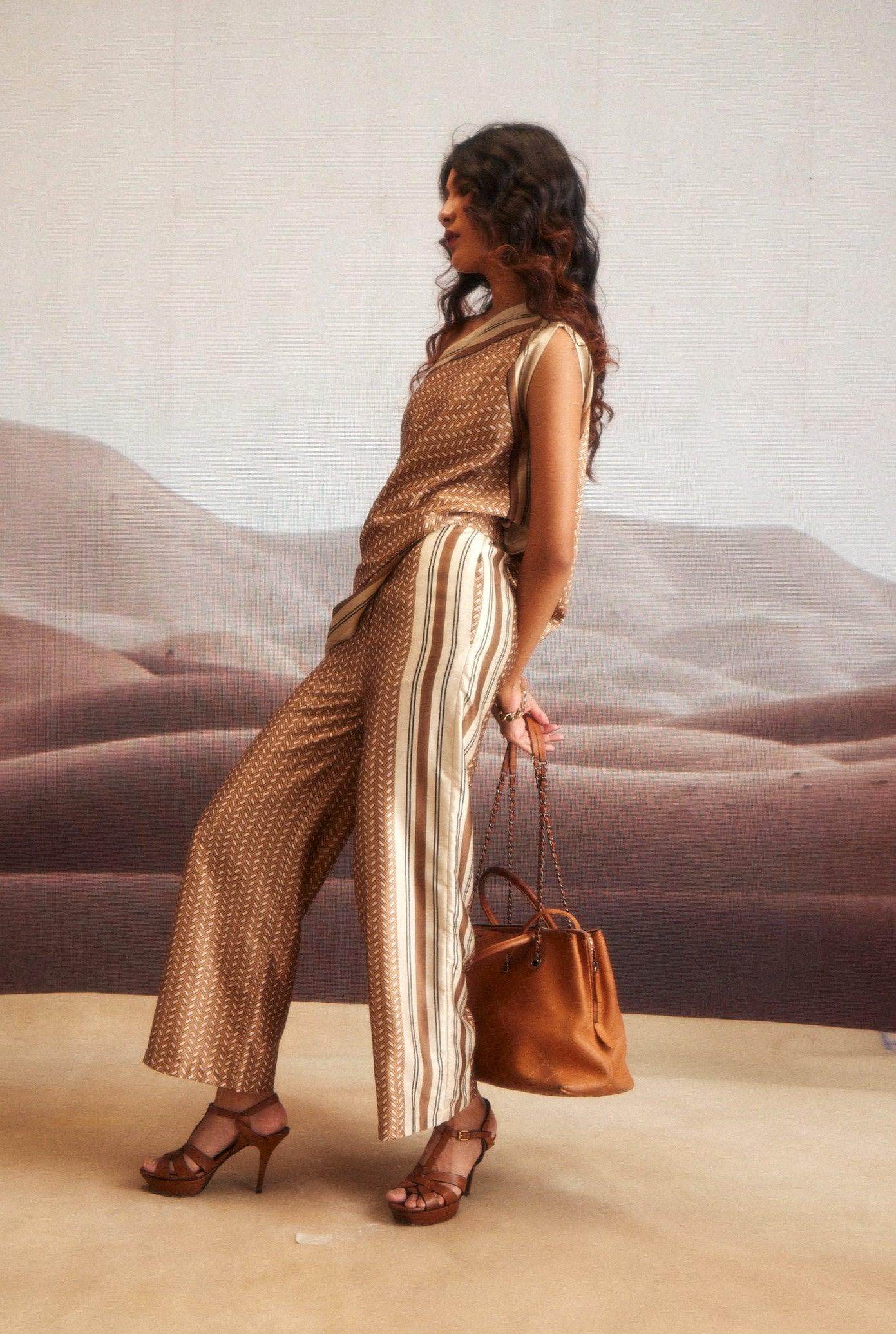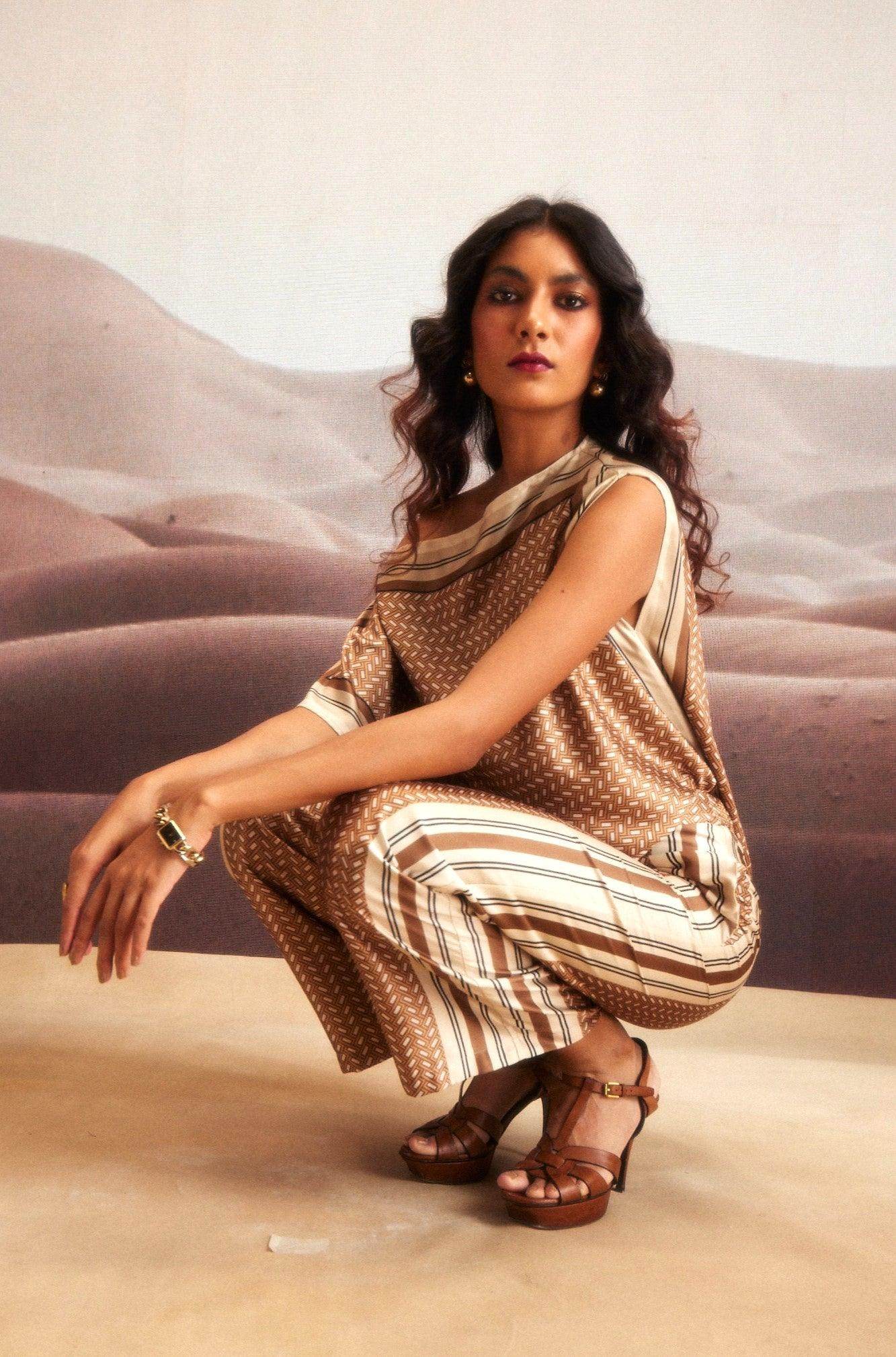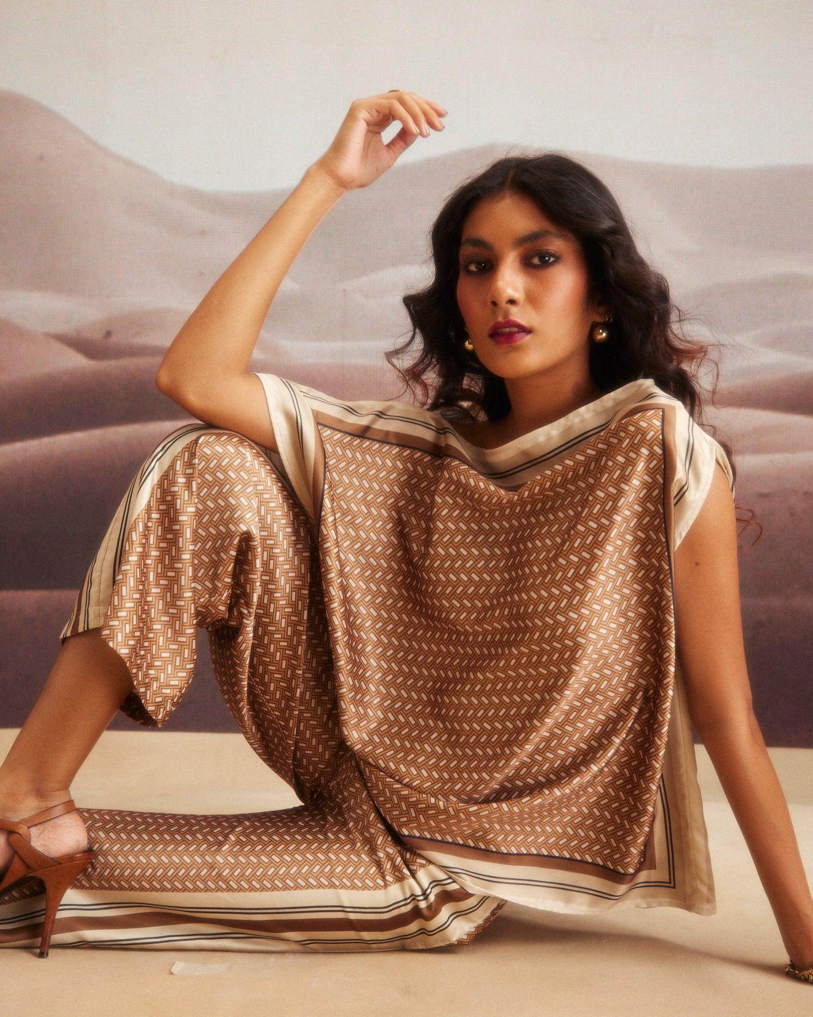 Geometric printed top in shades of beige and khaki with contrasting placed borders outlining the top. Kaftan style details and be worn two ways - as one shoulder scarf top or off shoulder. Paired with matching straight pants. Semi-elasticated at the waist, pockets on the side. Hook and zip closure at the front.