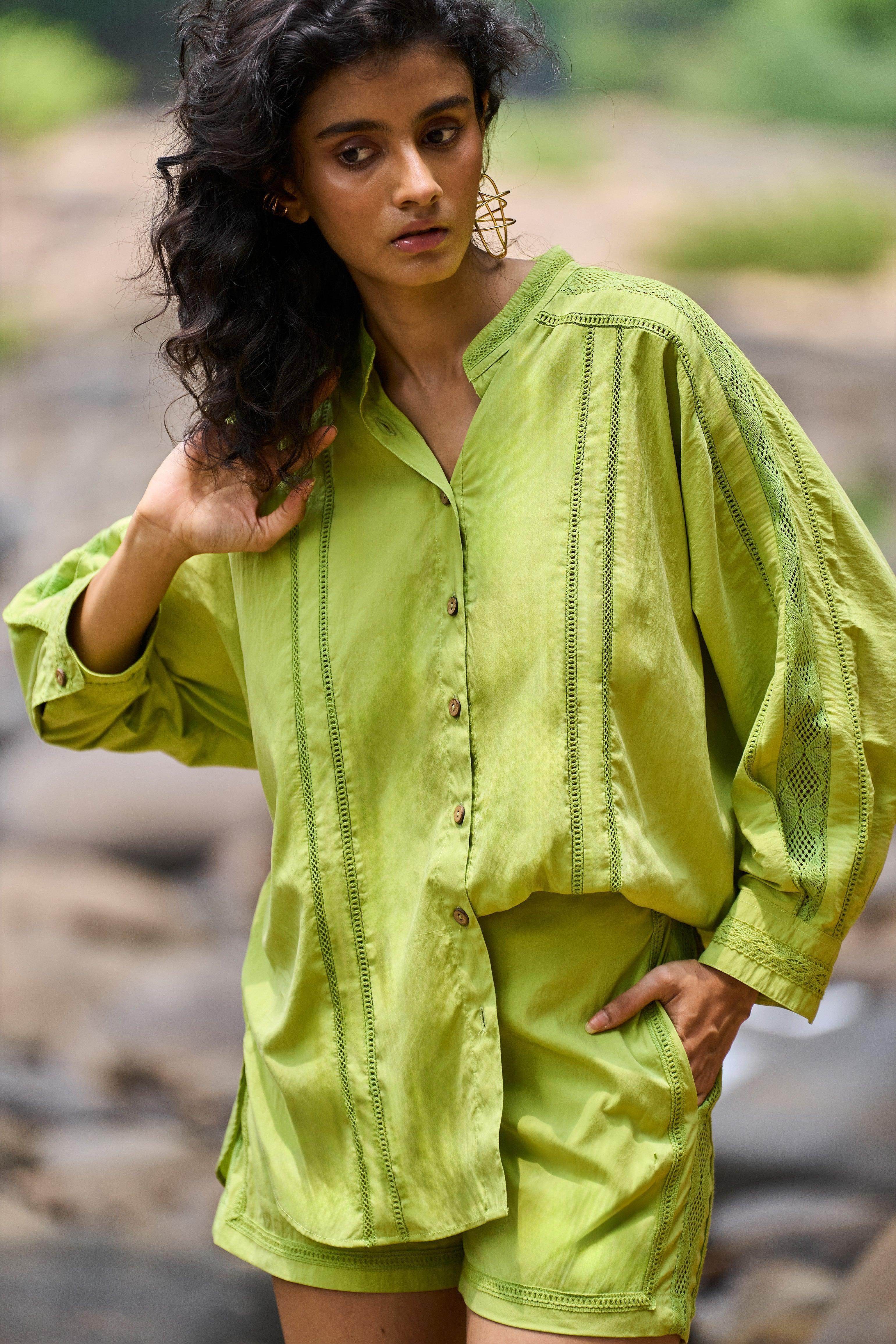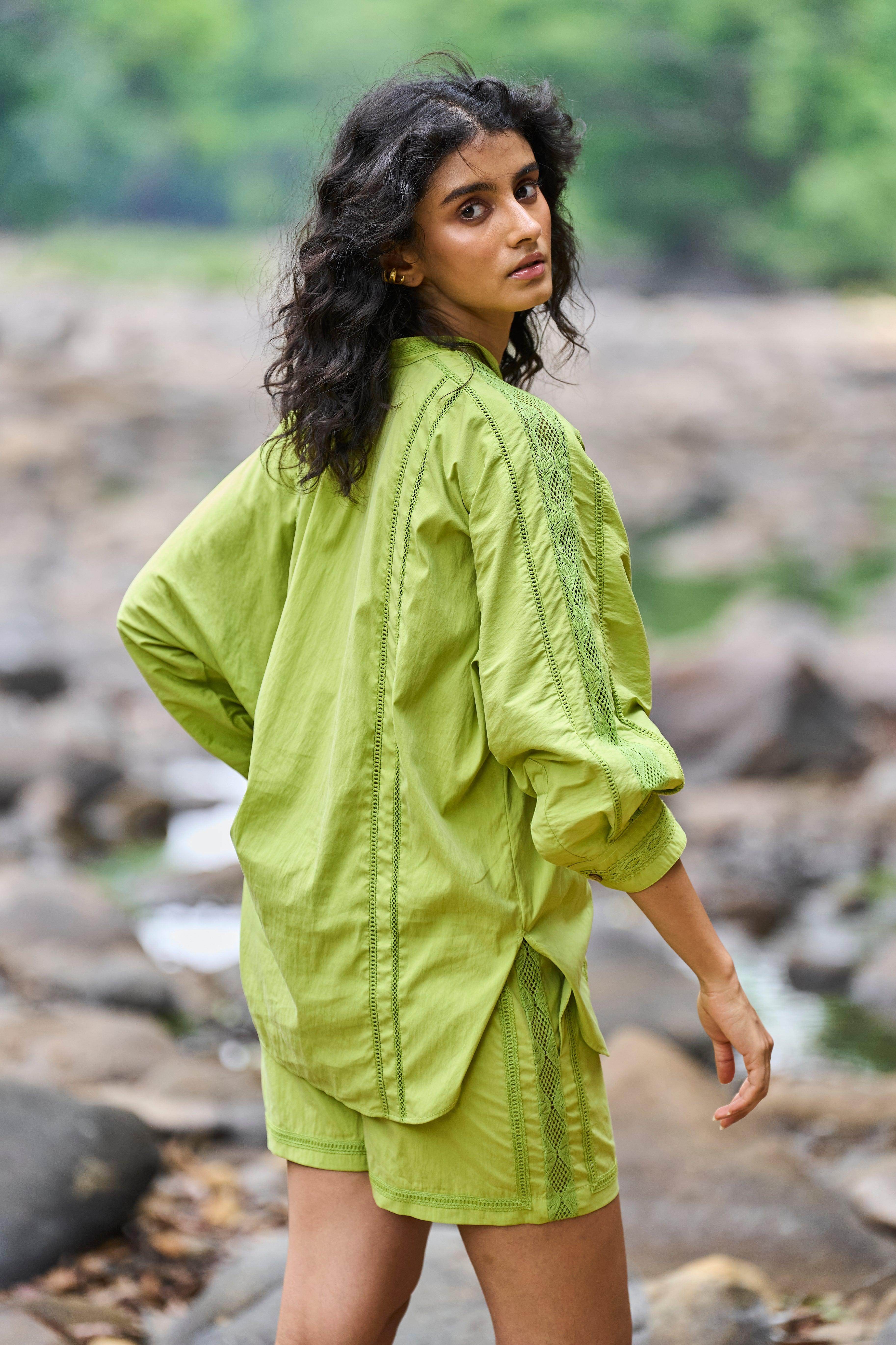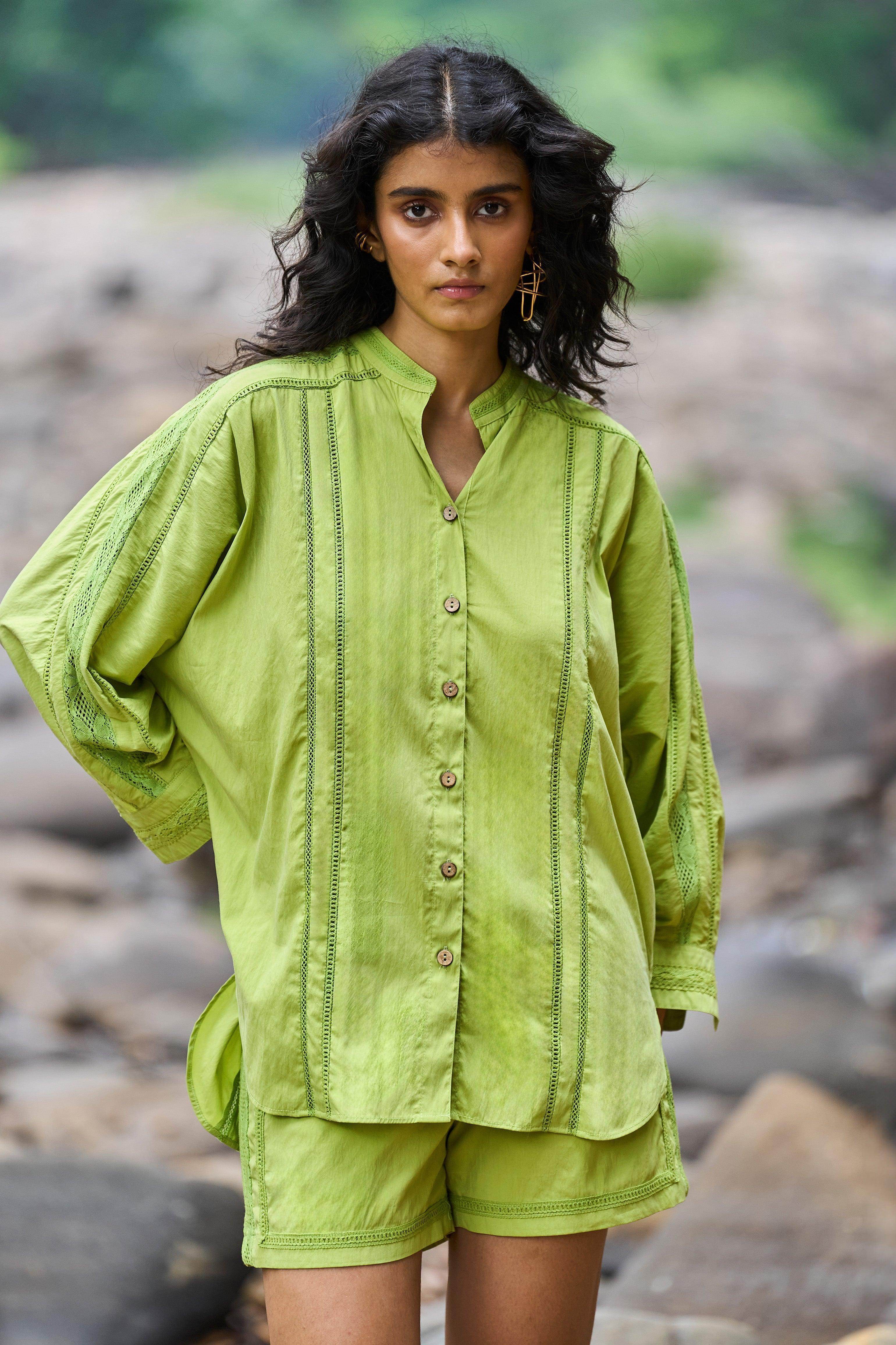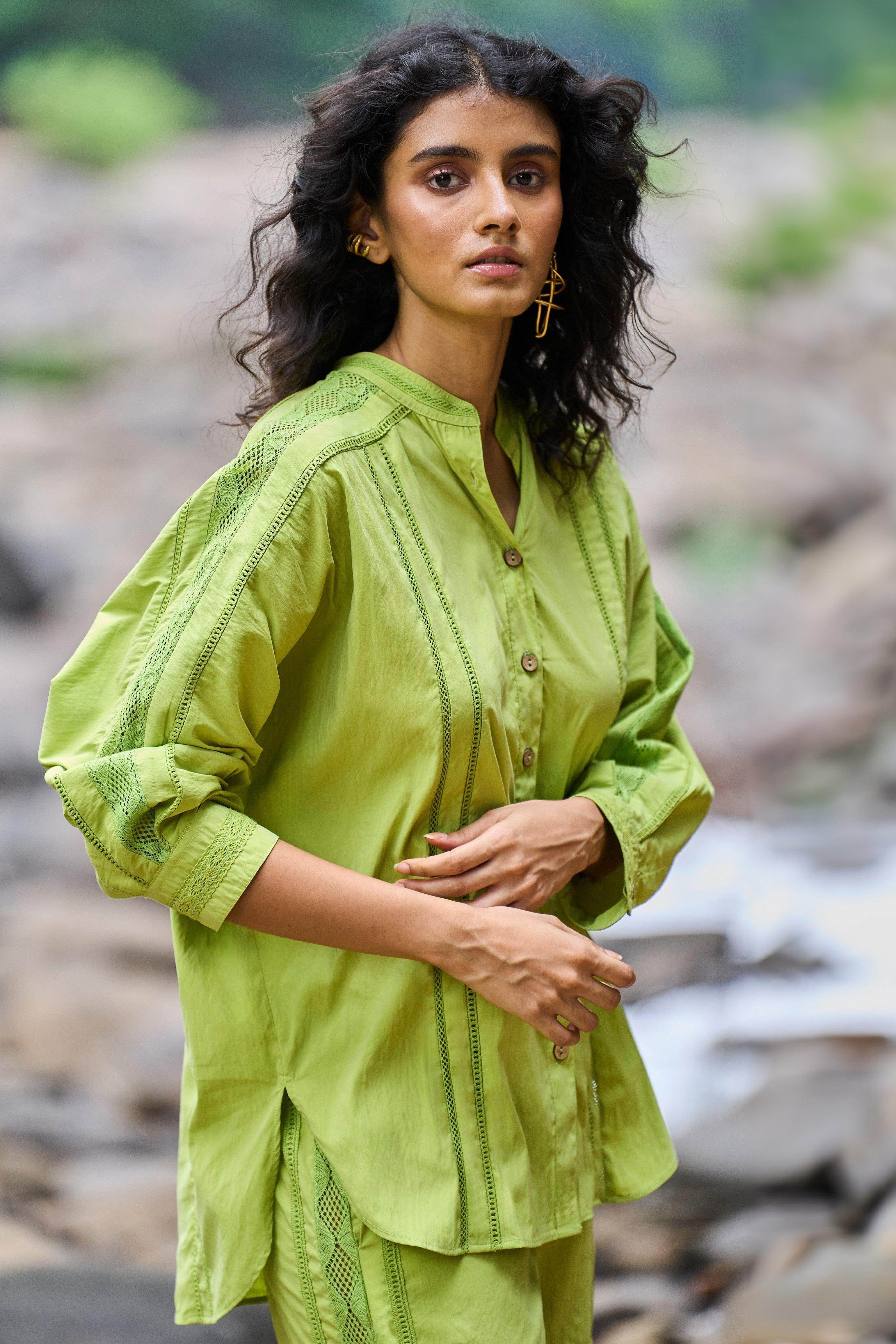 Chartreuse green button-down shirt in poplin with lace inserts down the front and sleeves. Full sleeve shirt with a wooden button down front. Lace accented band collar. High-low hem, and drop-shoulder full sleeves. Relaxed fit.
