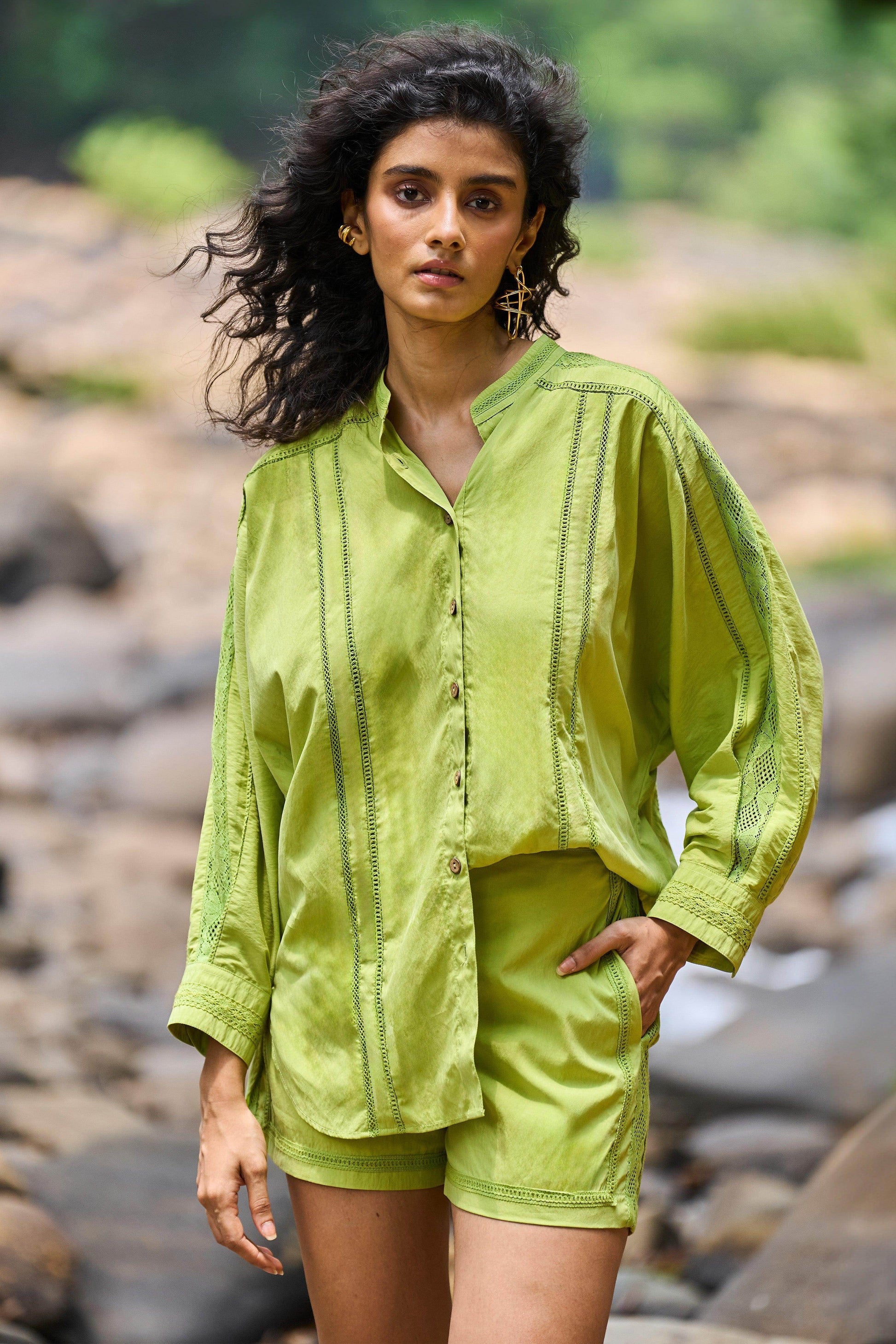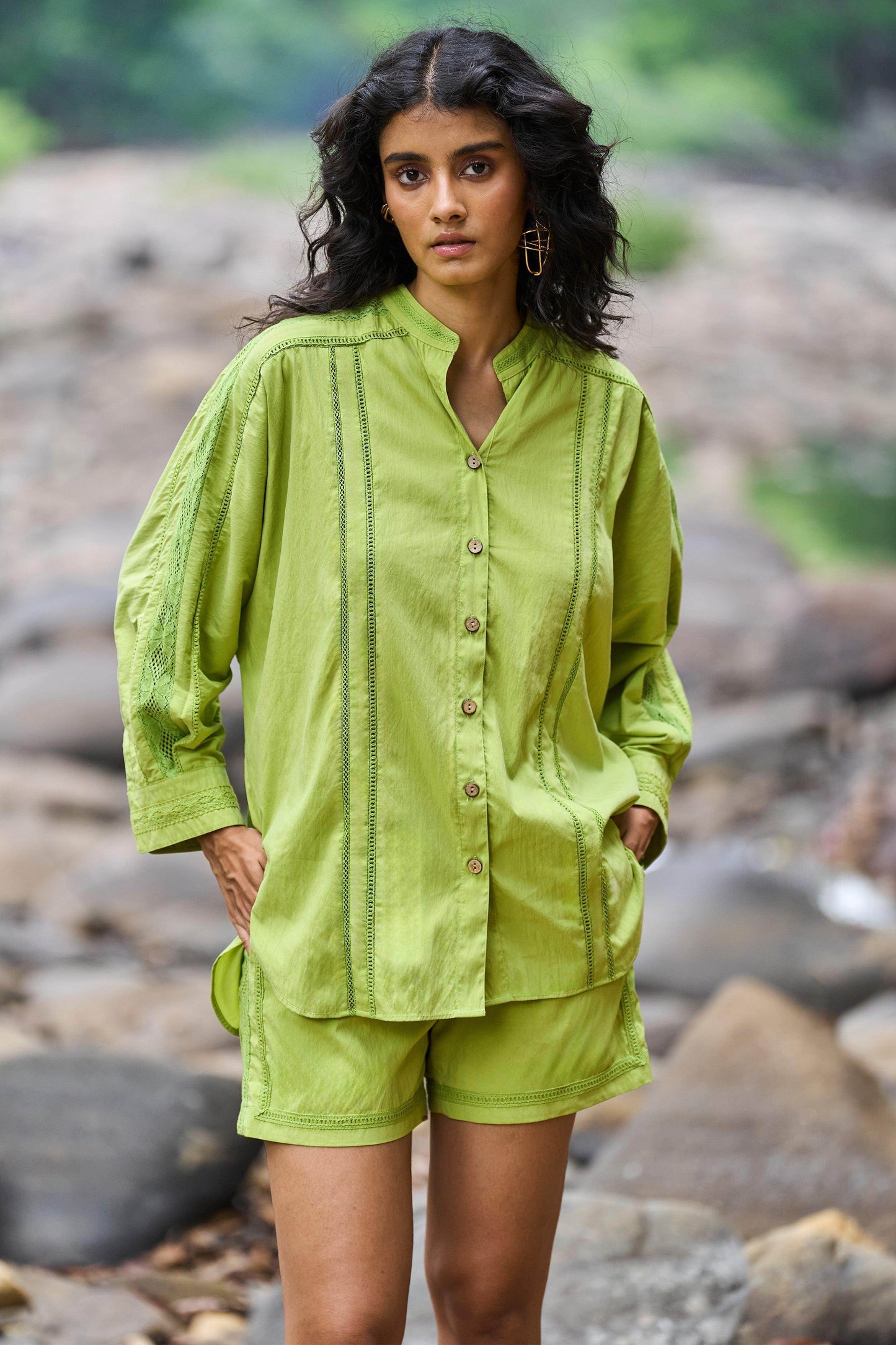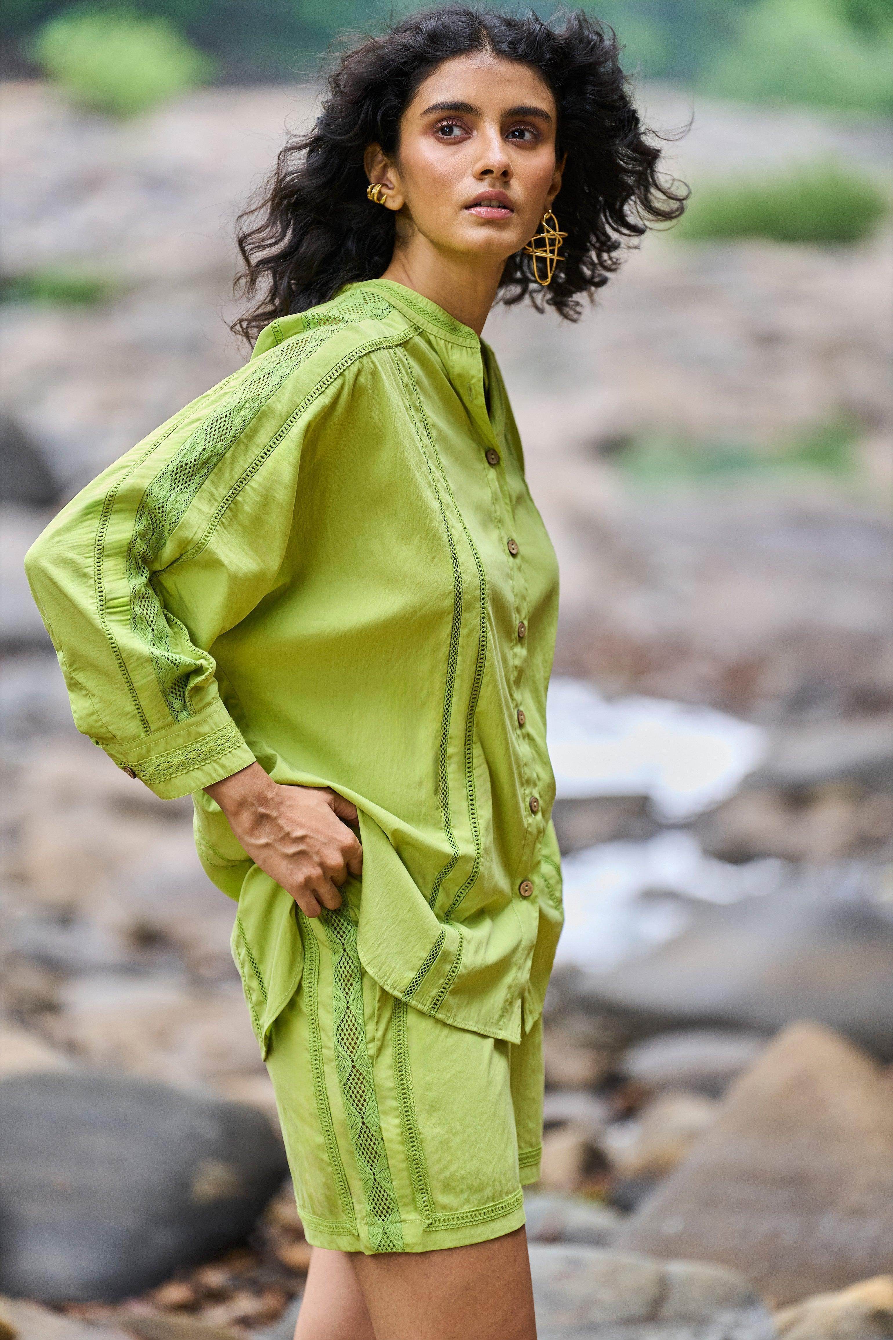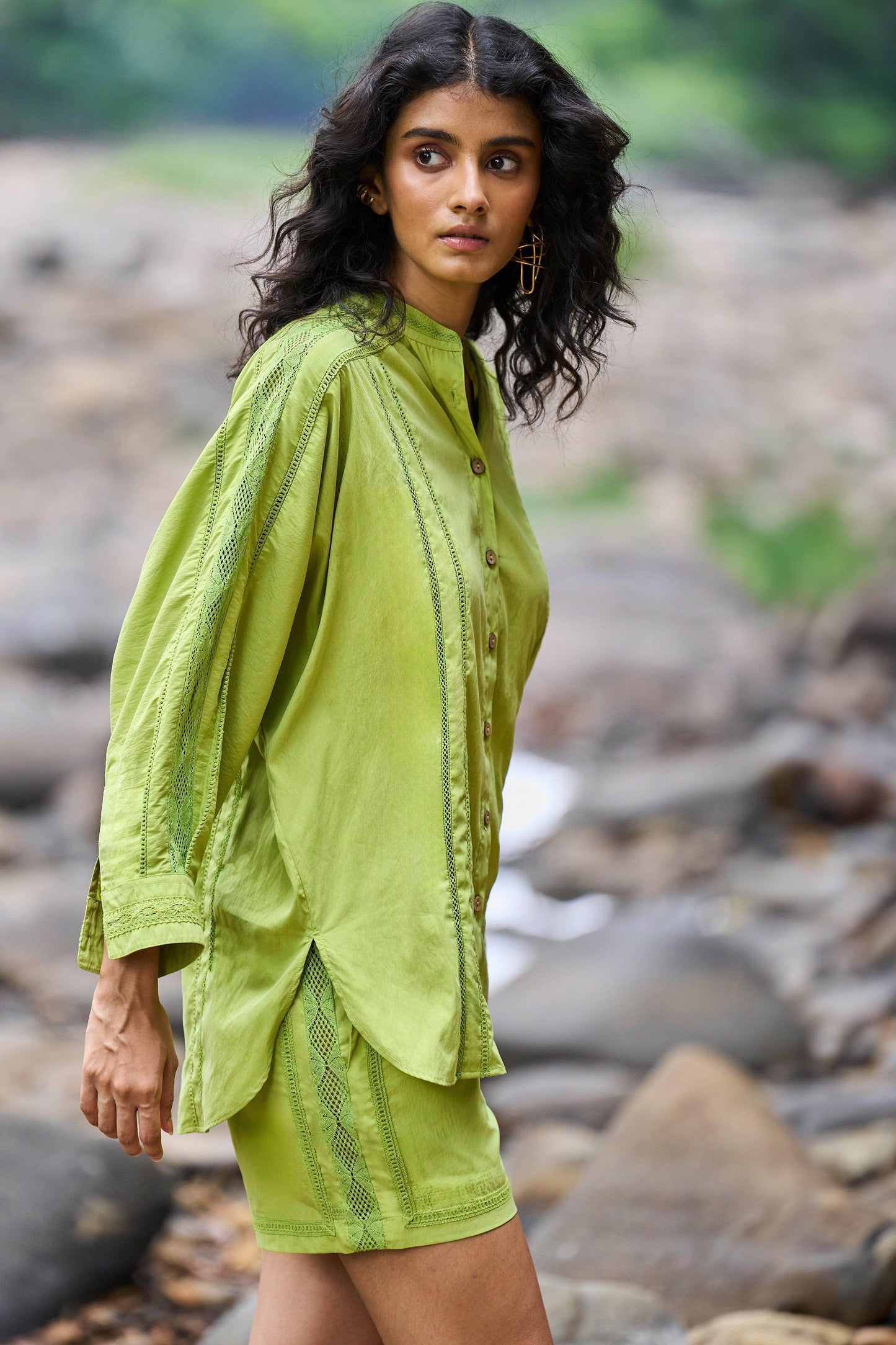 Chartreuse green button-down shirt in poplin with lace inserts down the front and sleeves. Full sleeve shirt with a wooden button down front. Lace accented band collar. High-low hem, and drop-shoulder full sleeves. Relaxed fit.