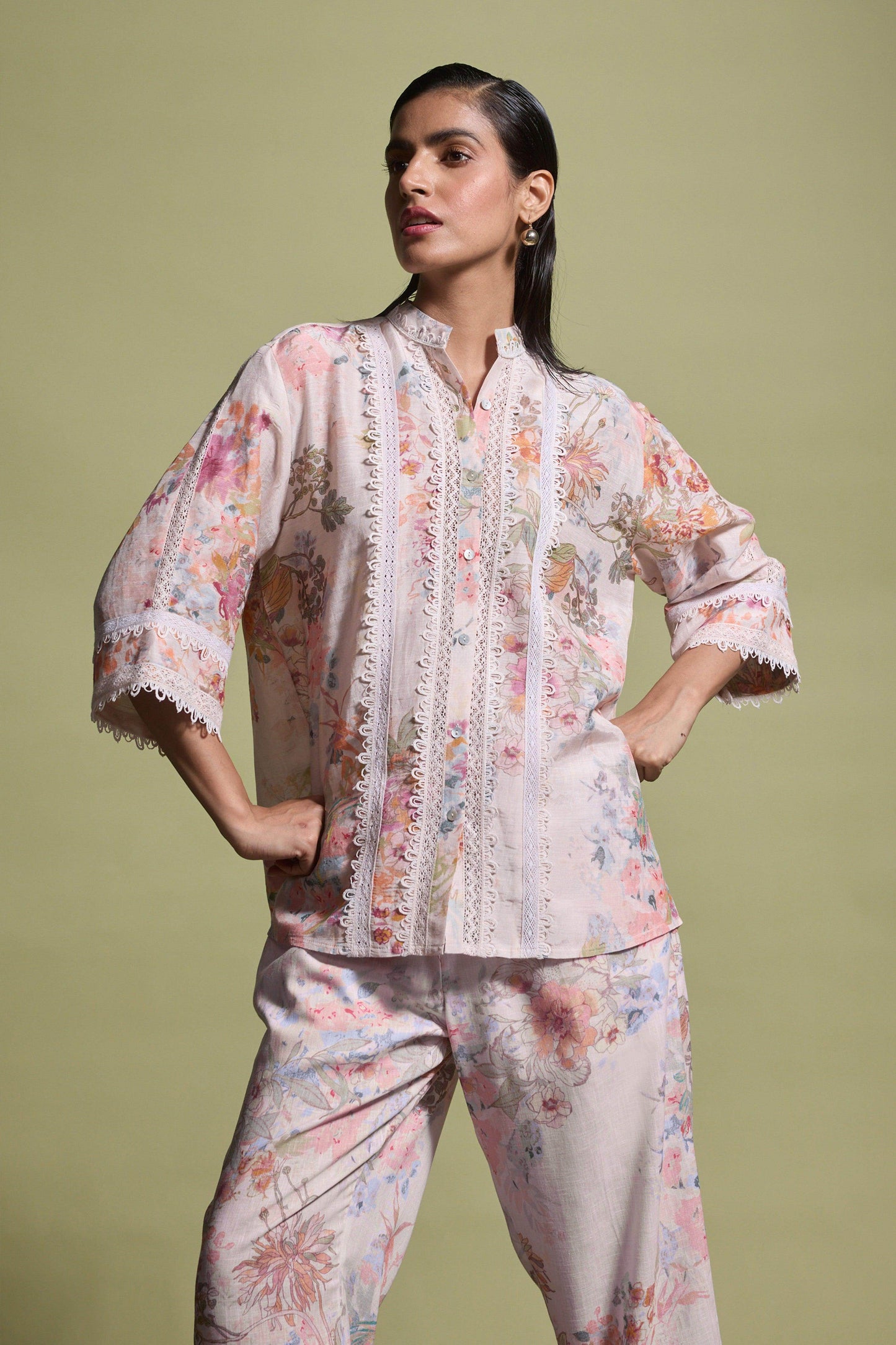 Pastel multi-floral print on a breathable natural linen blend base. Features natural contrast laces on the band collar, front, back, and sleeves. Button-down placket in the front with soft gathers in the back. Relaxed fit.