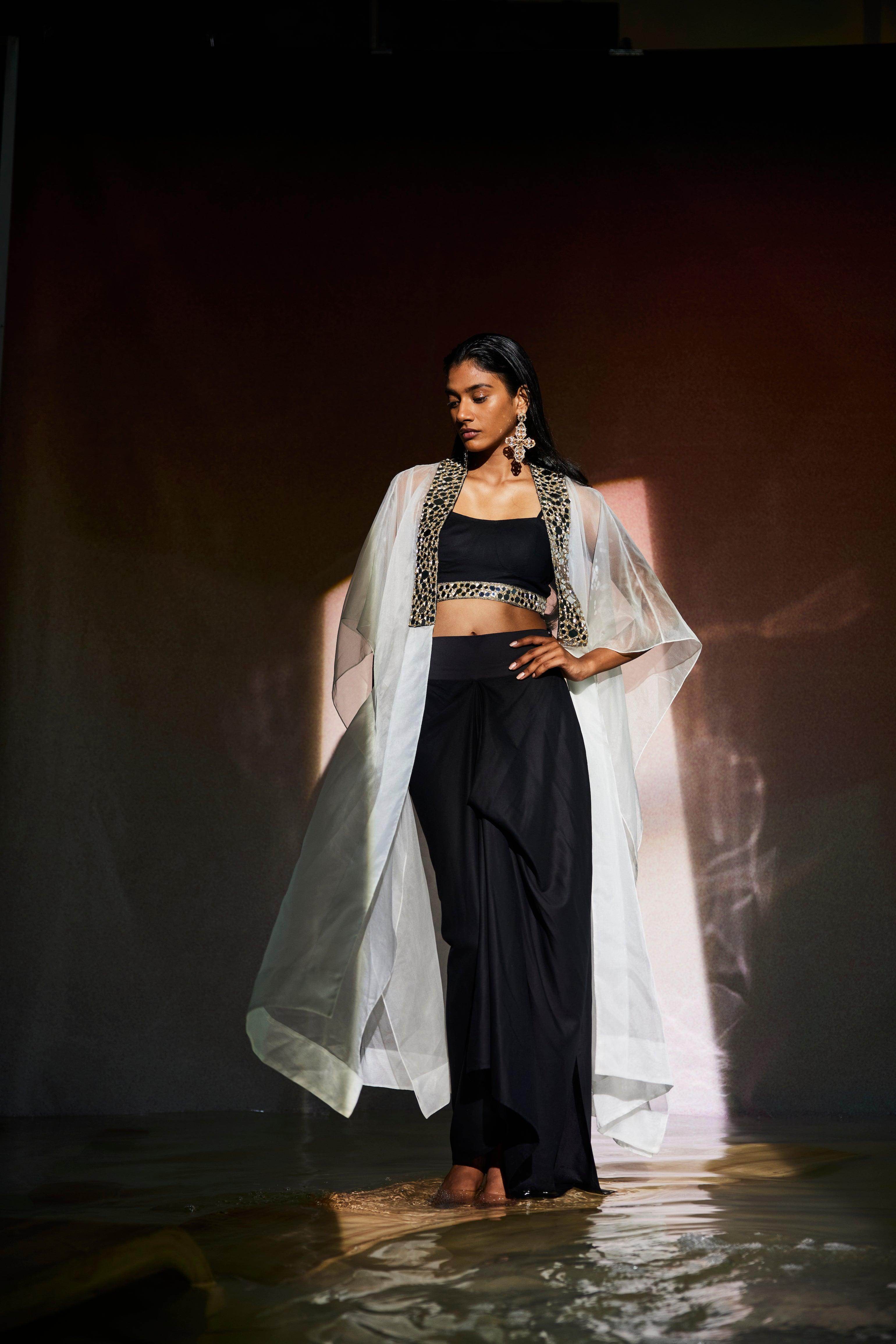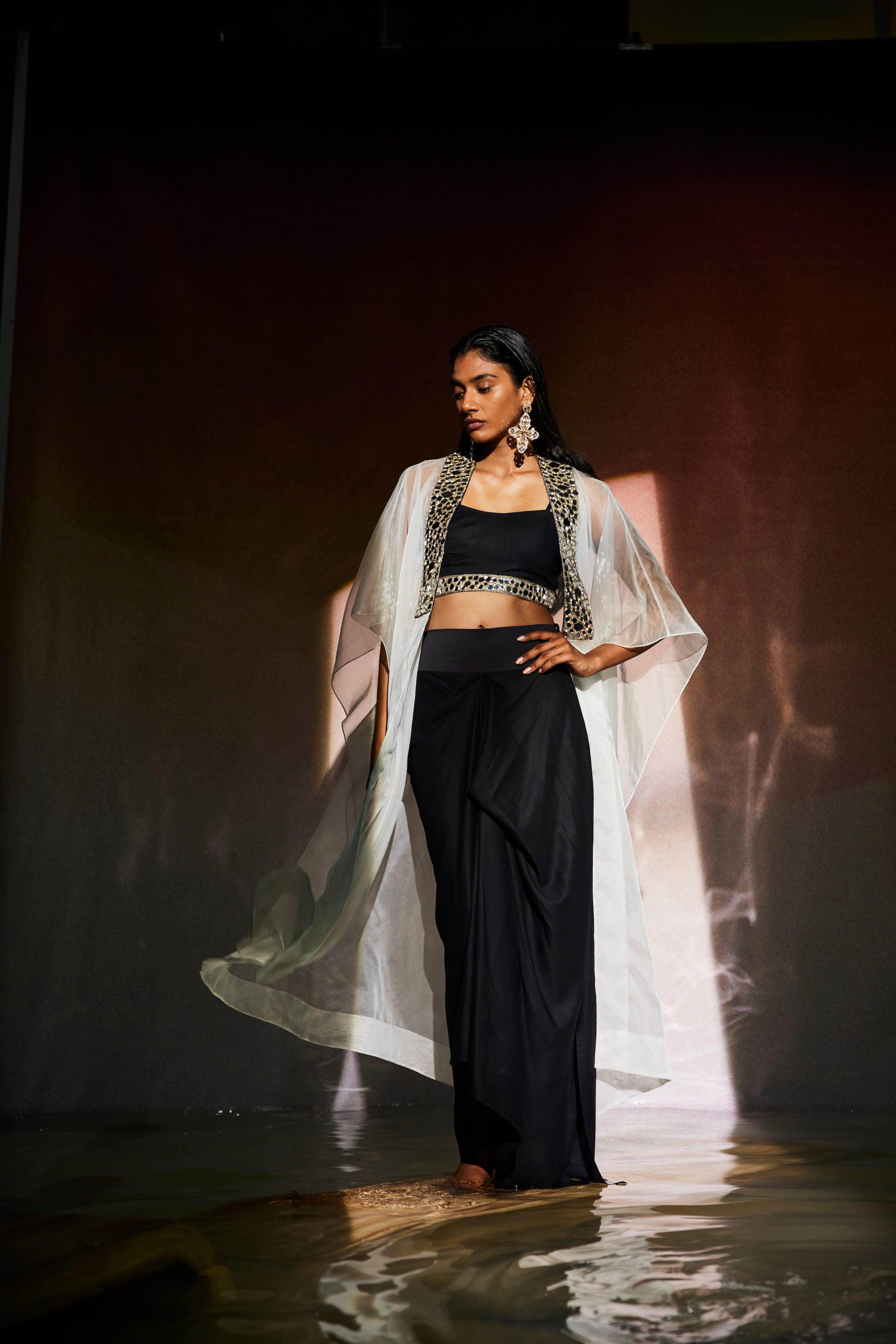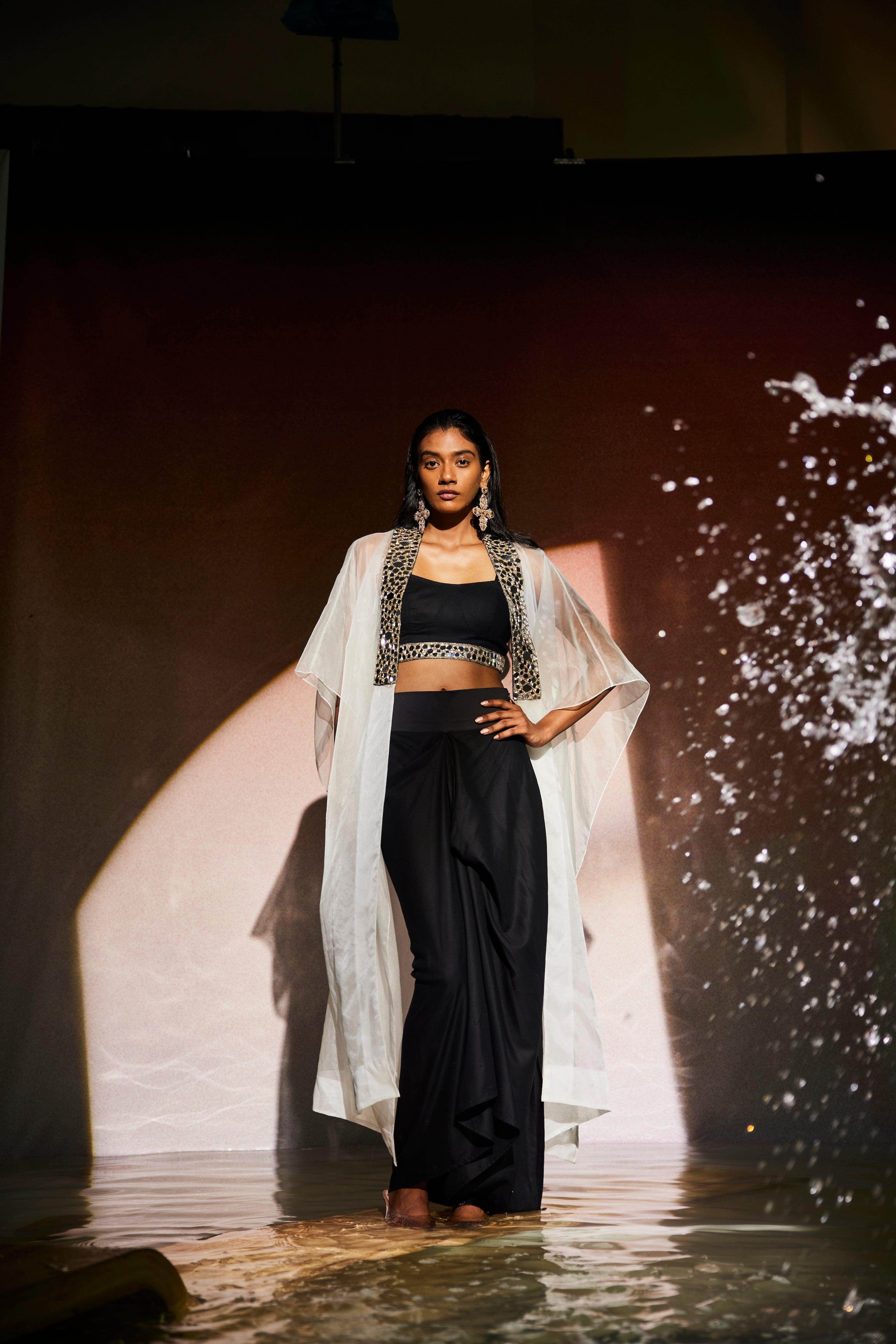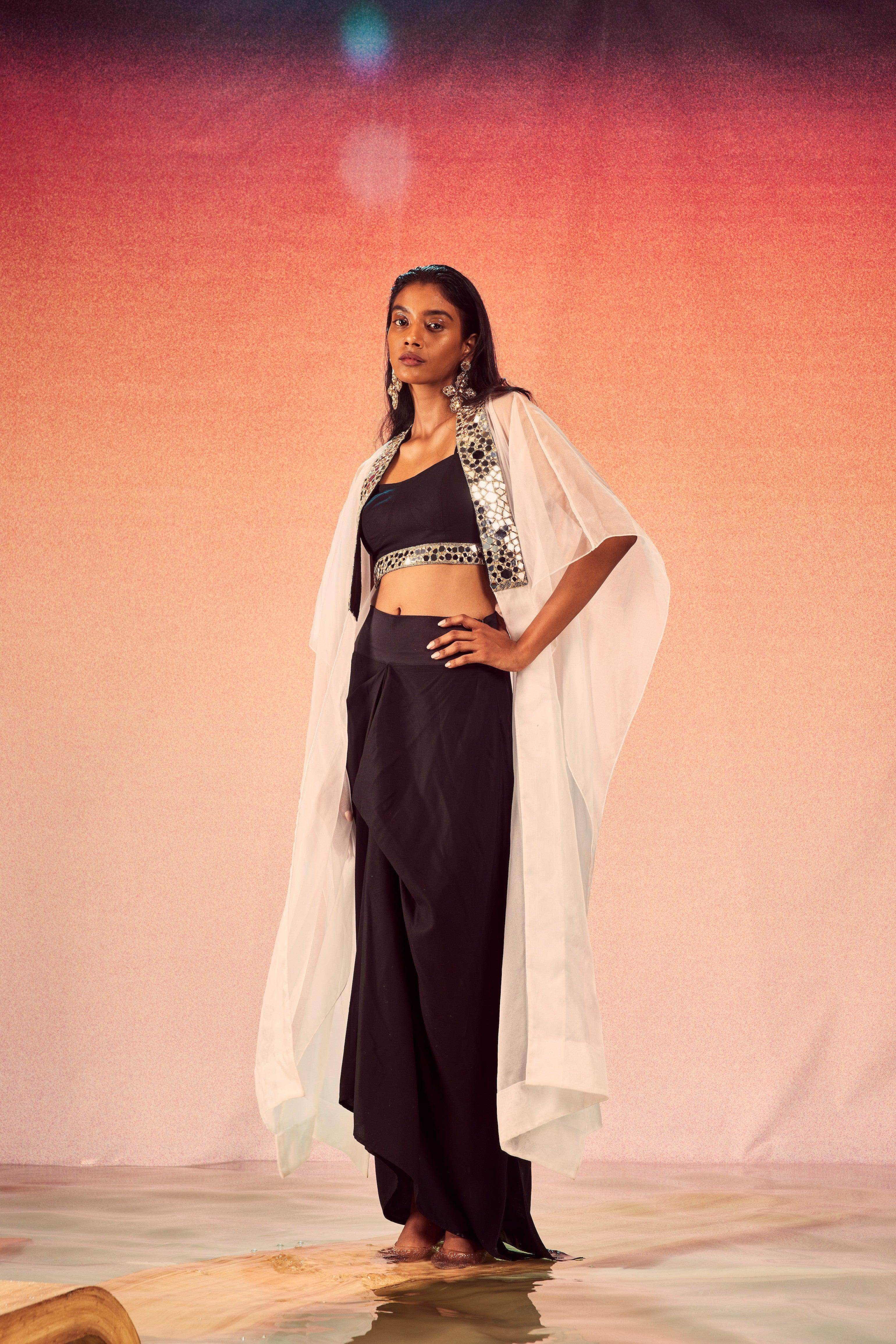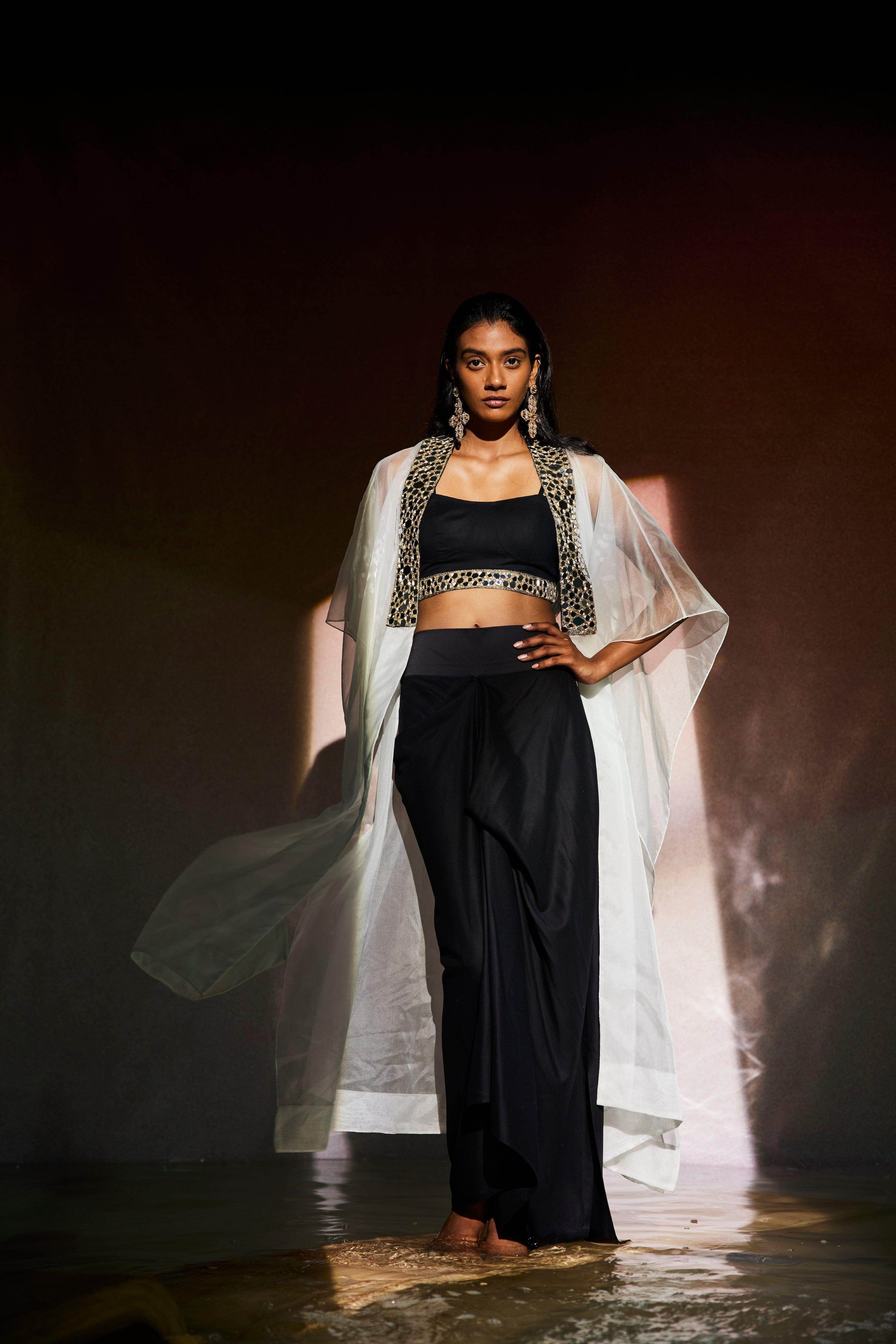 Black bralette with removable pad pocket inserts. Smocking at the back, hook and eye closure at the side. Mirror work stripe on the border. Paired with asymmetric drape skirt in a black flowy fabric. Hook and concealed zipper on the side.