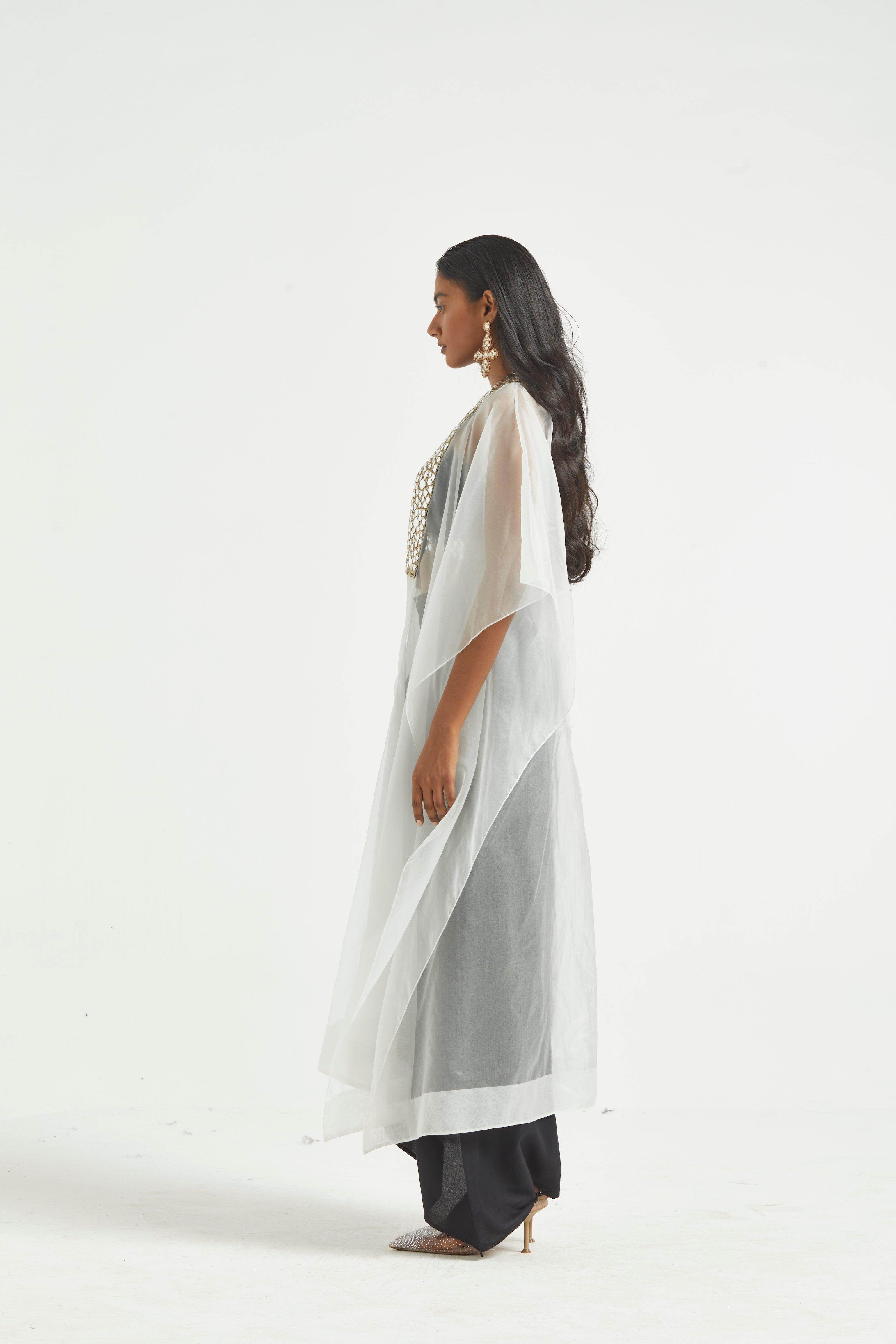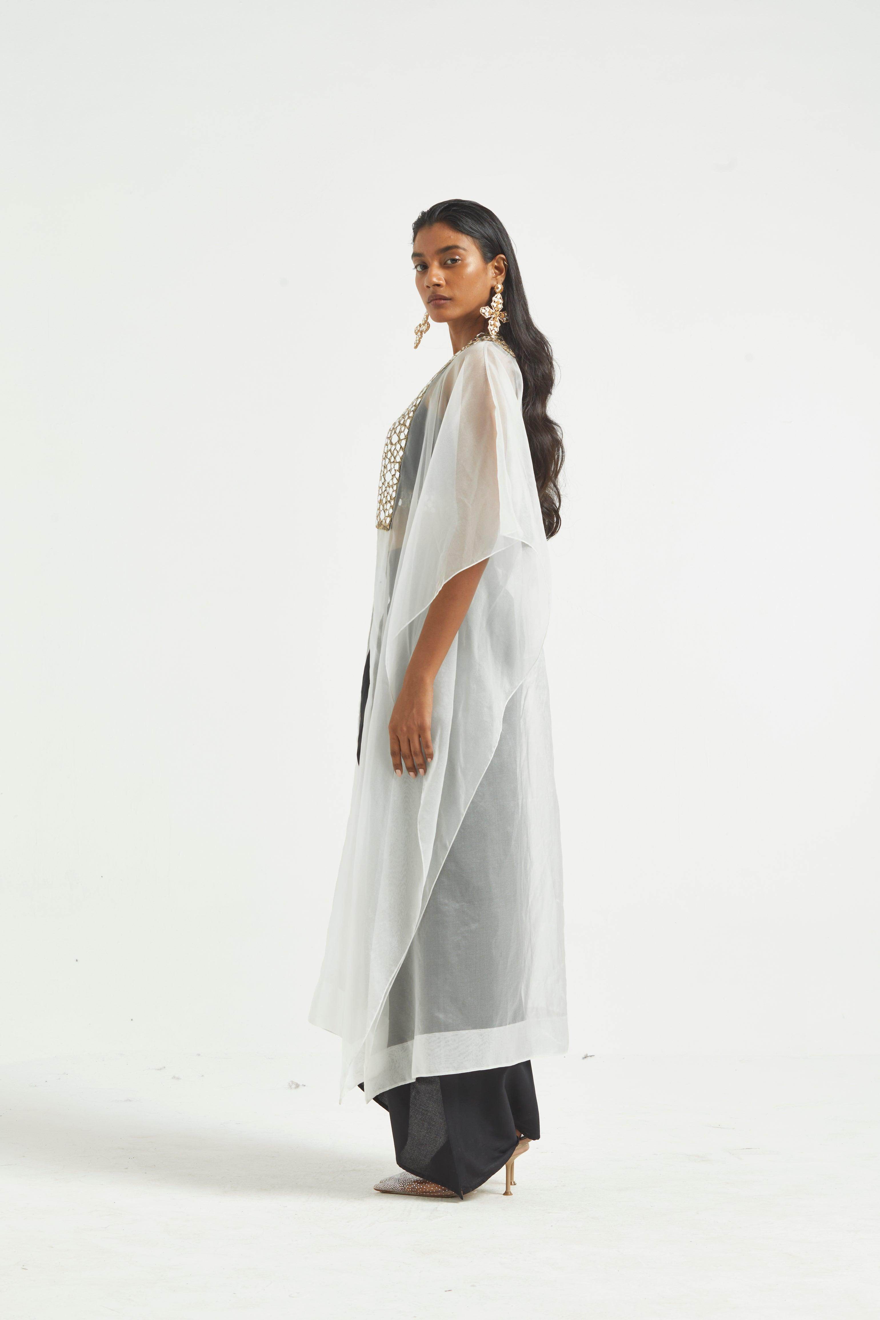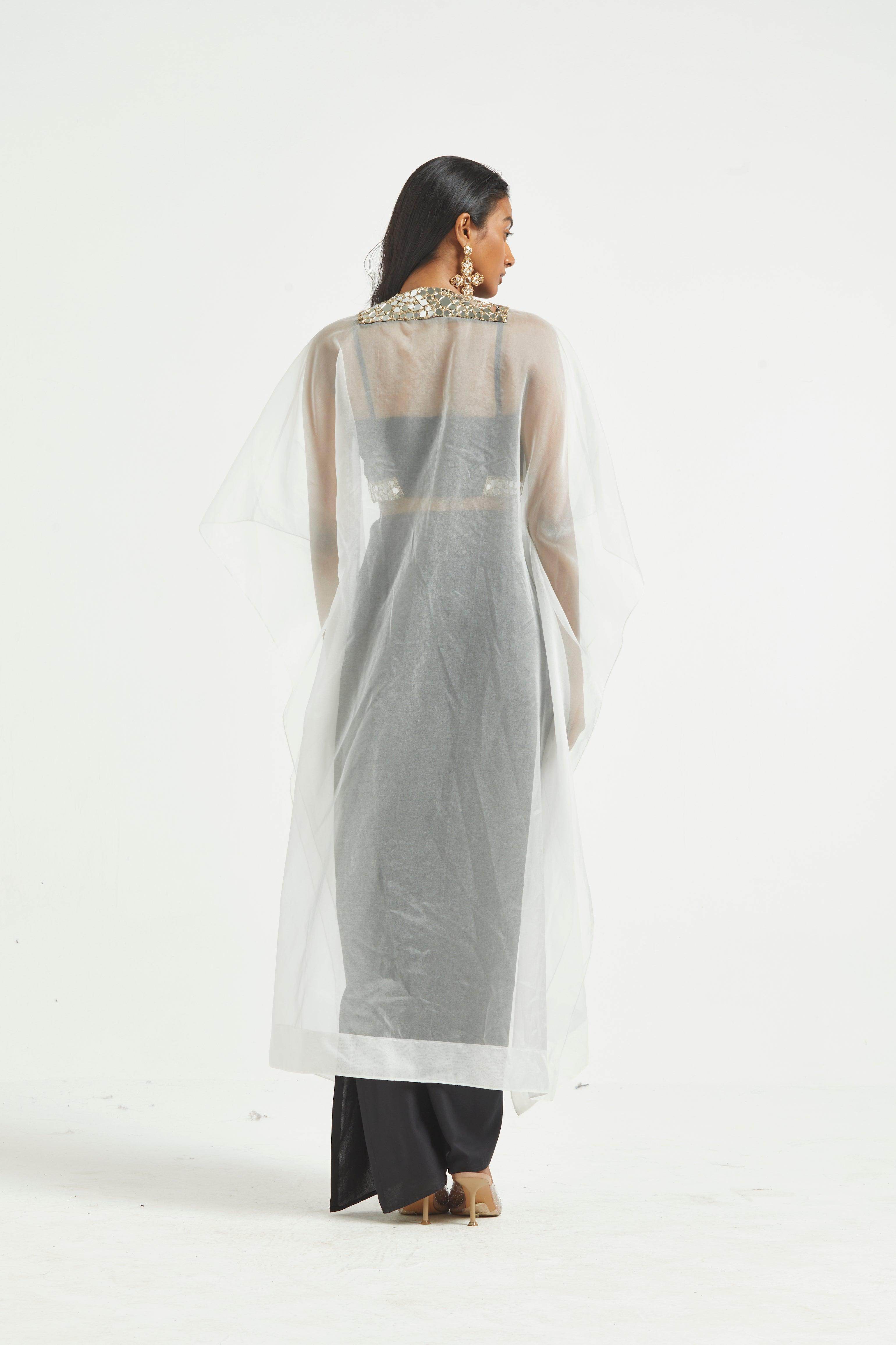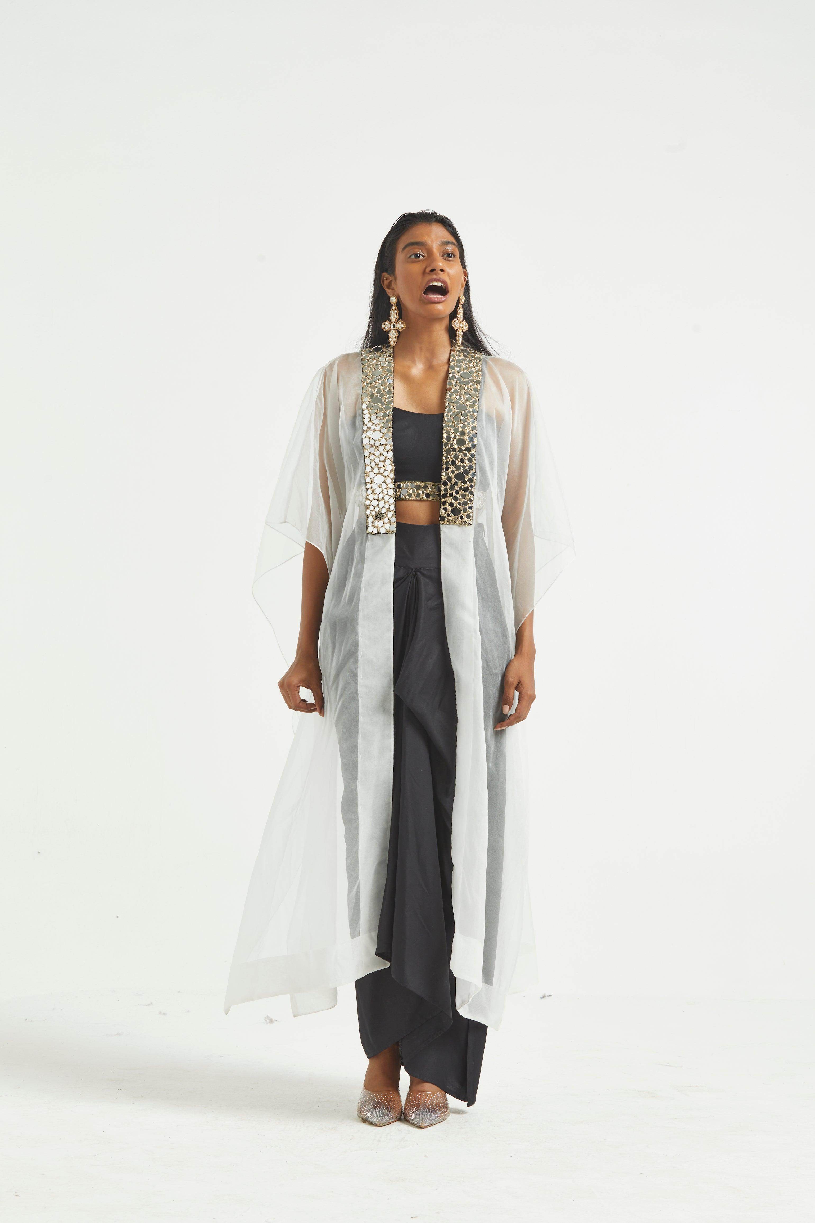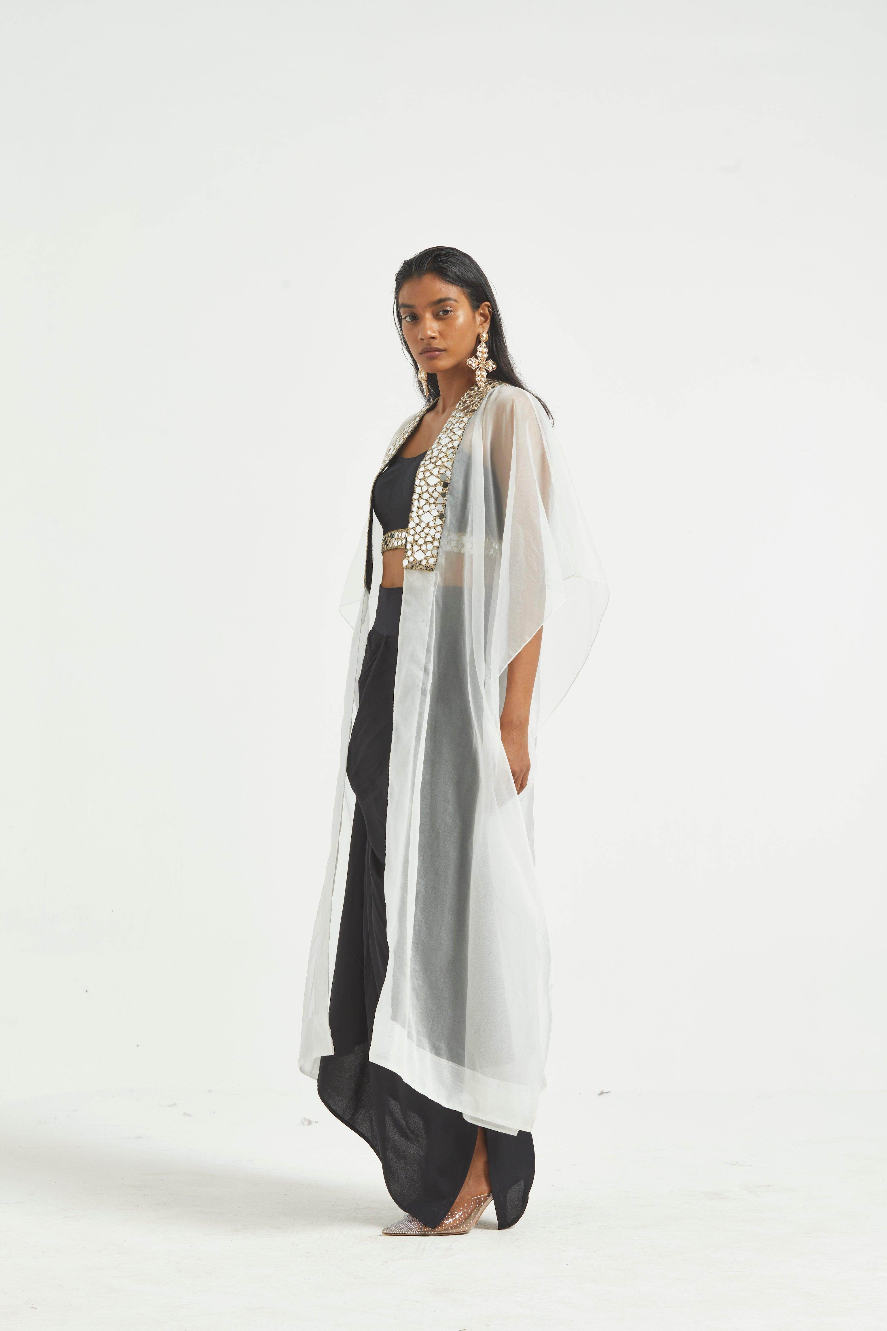 Black bralette with removable pad pocket inserts. Smocking at the back, hook and eye closure at the side. Mirror work stripe on the border. Paired with asymmetric drape skirt in a black flowy fabric. Hook and concealed zipper on the side.