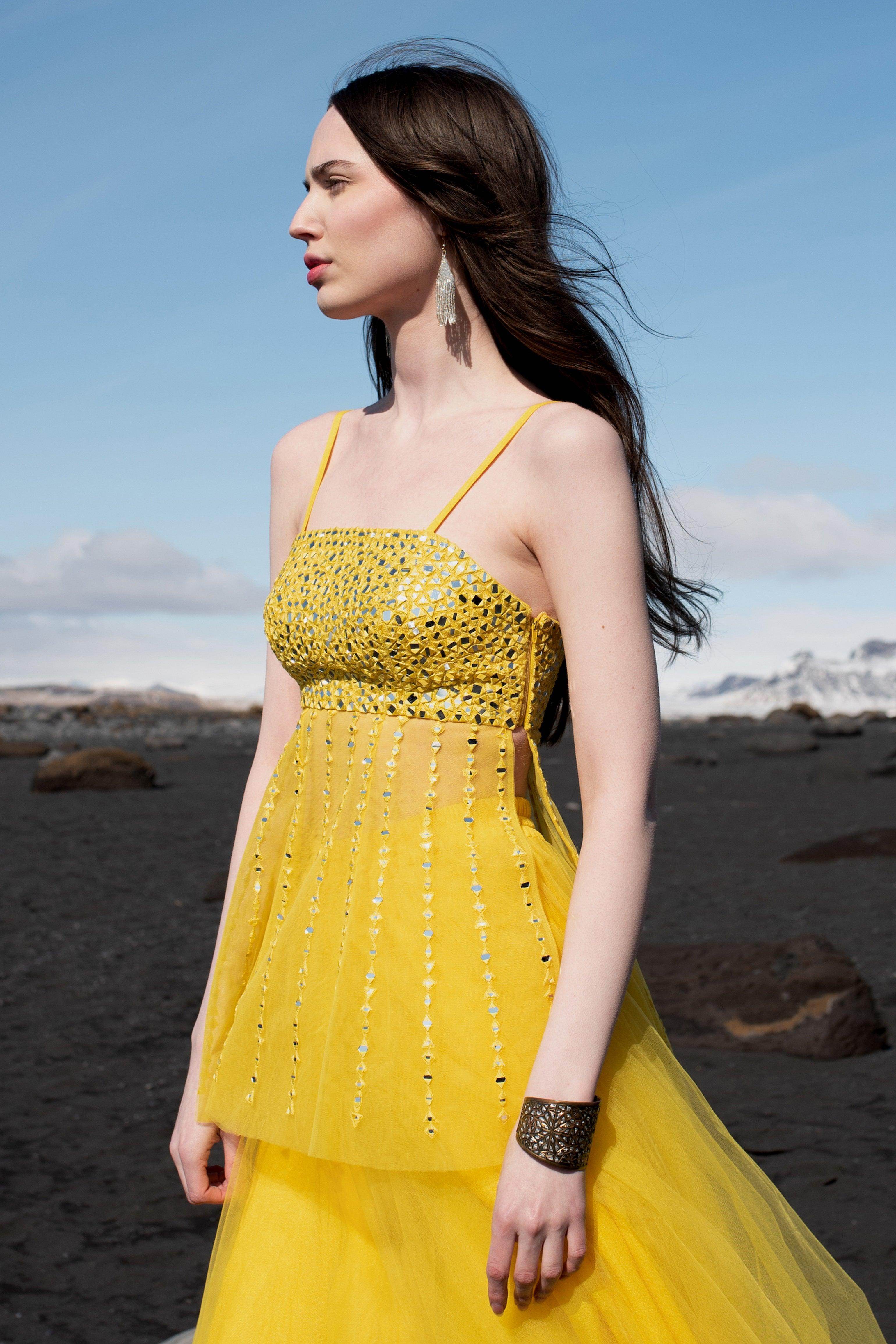 Sunflower yellow peplum-style top in ethereal tulle fabric. Adorned with intricate hand and machine-embroidered mirrors in various shapes and sizes at the bandeau. Mirror-embroidered lines flowing from the bandeau top to the peplum hem, inspired by rays of the sun. Zip closure on the bandeau on the wearer's left, complemented by alluring high slits on the peplum sides. Adjustable shoulder straps for a customized fit. The bandeau of the top is fully lined. Hand-cut raw hems.