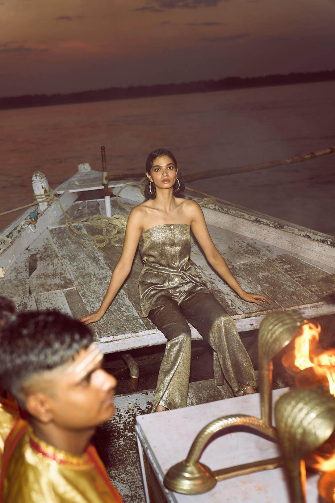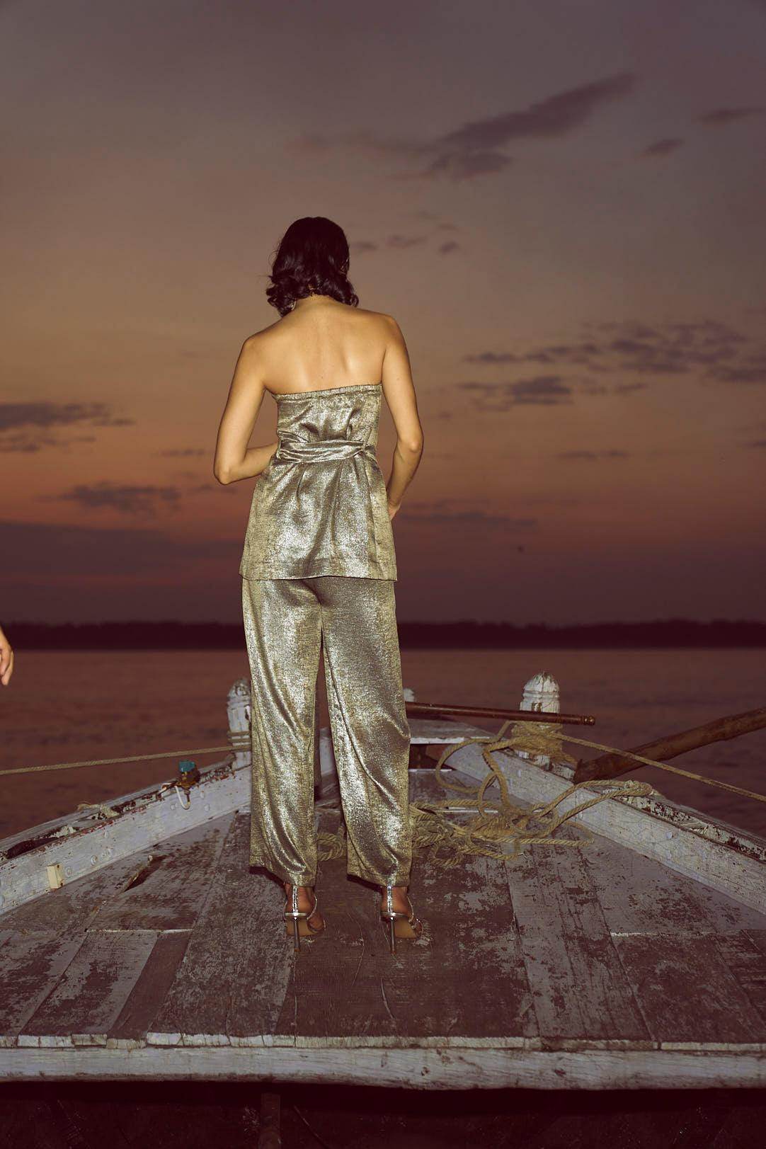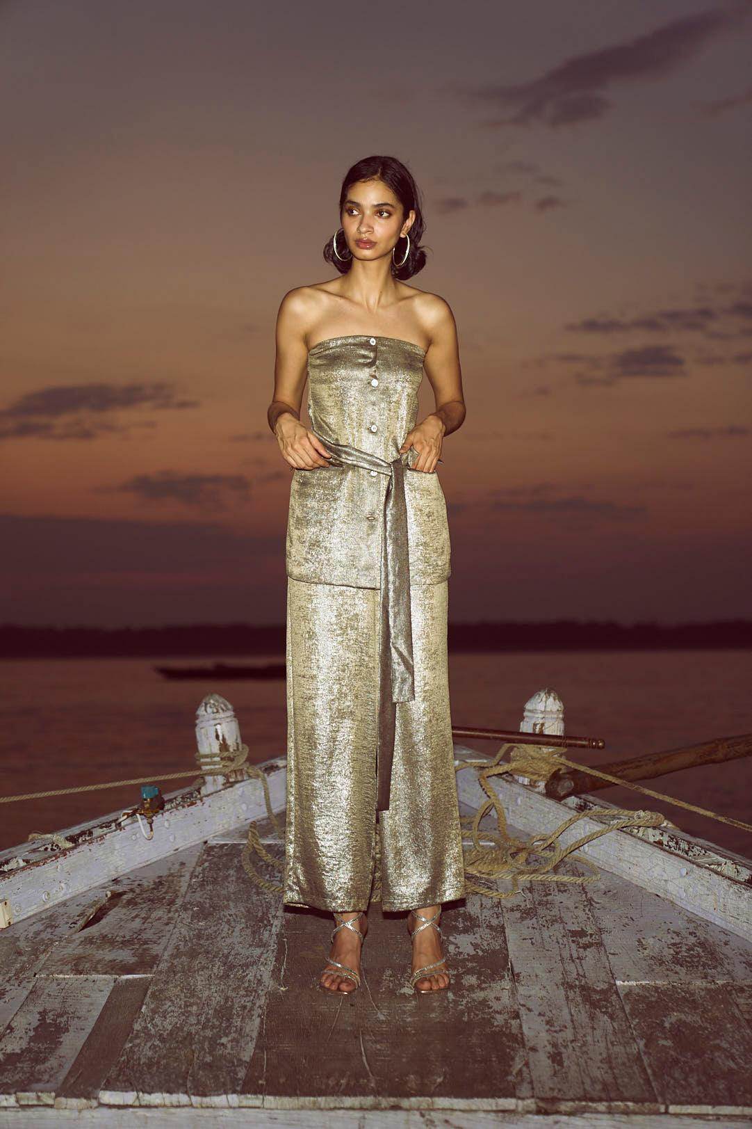 Fuchsia boxy longline shirt with placed tonal and red floral embroidery across the shoulders and sleeves. Shirt collar. Concealed button placket. Paired with pants with a similar embroidery detailing down the sides. Pockets on the side. Hook and zip closure at the front.