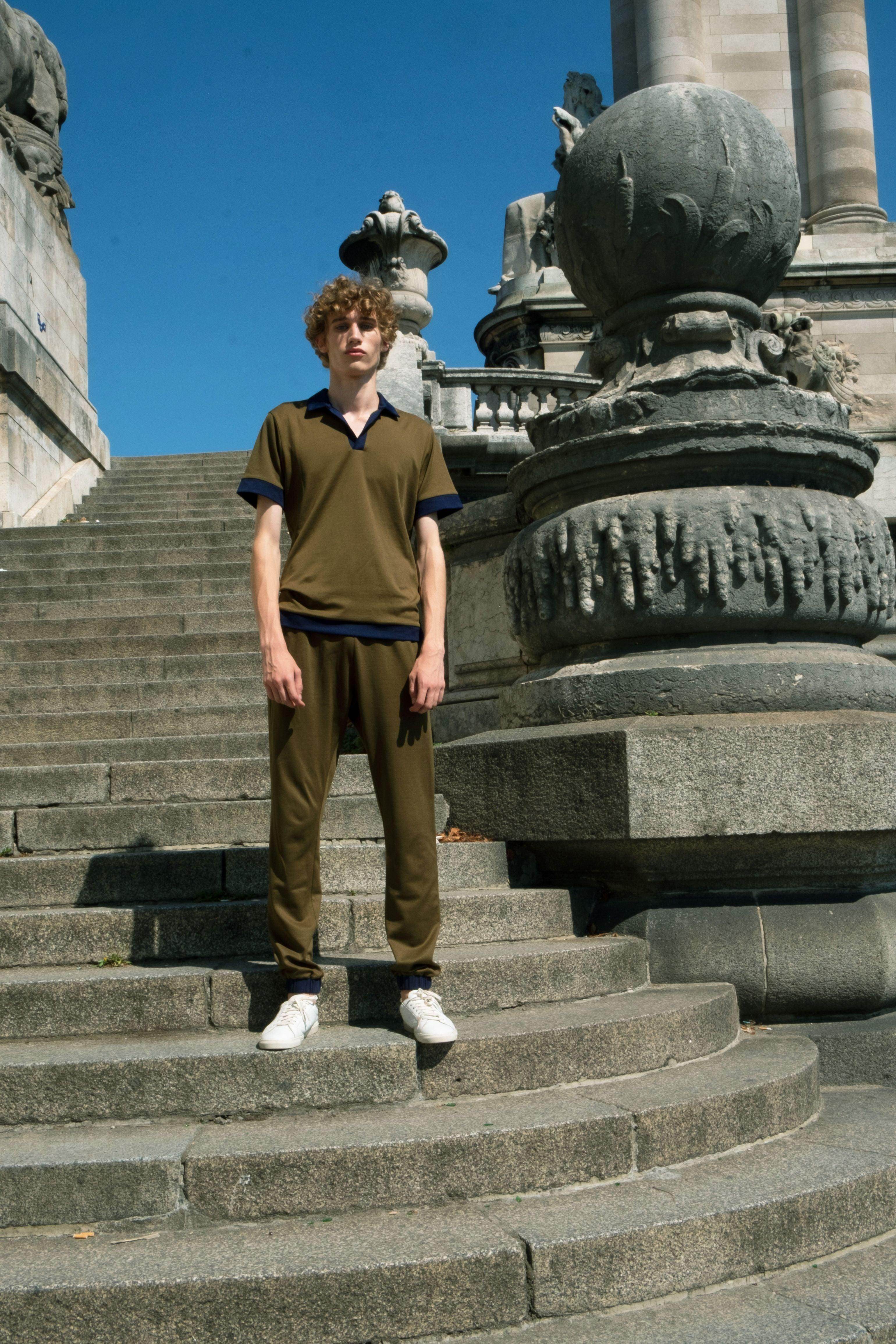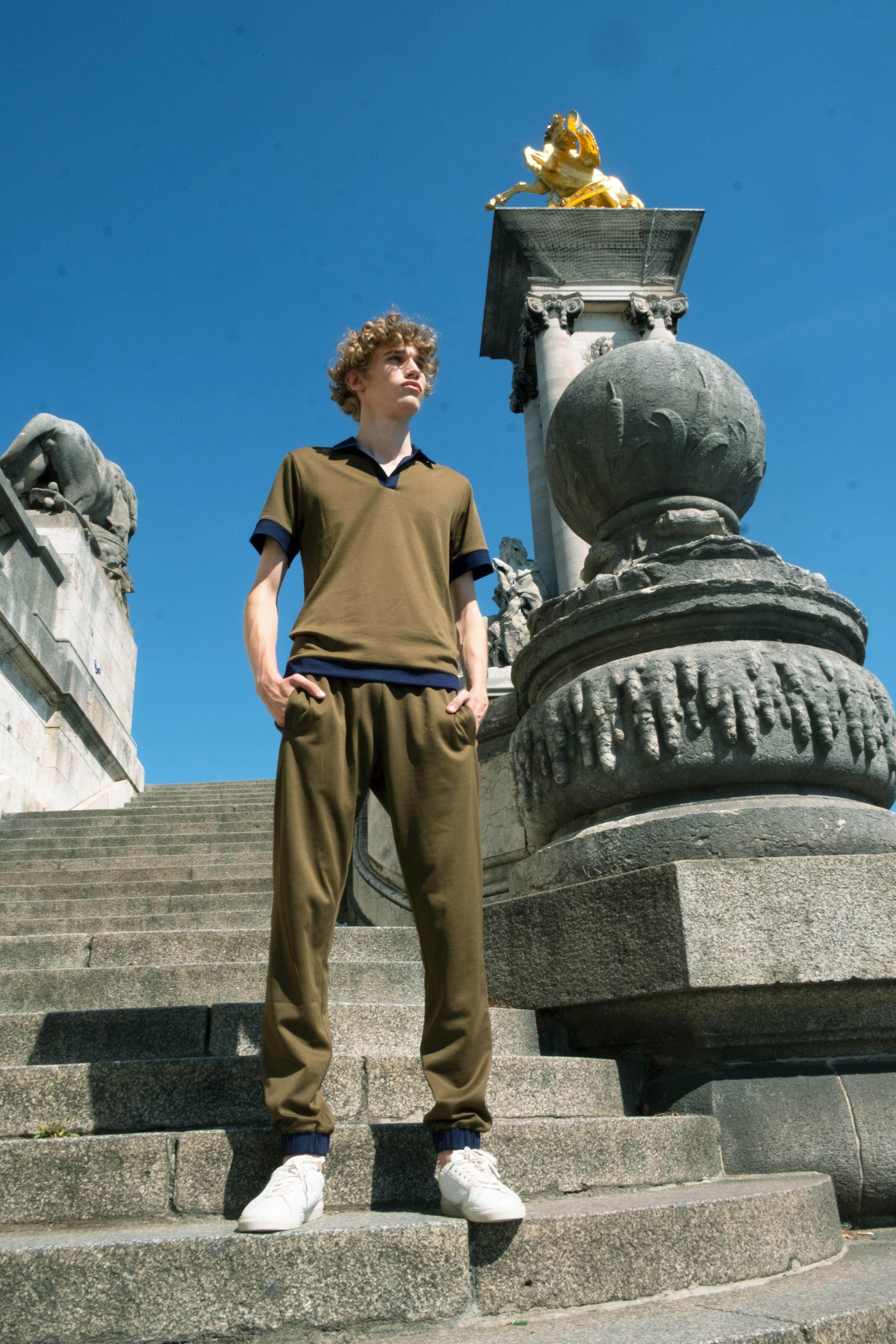 Olive V-neck polo with contrasting navy panels at collar, placket, sleeve cuff and bottom hem. Sustainably sourced recycled polyester and Pima cotton blend.