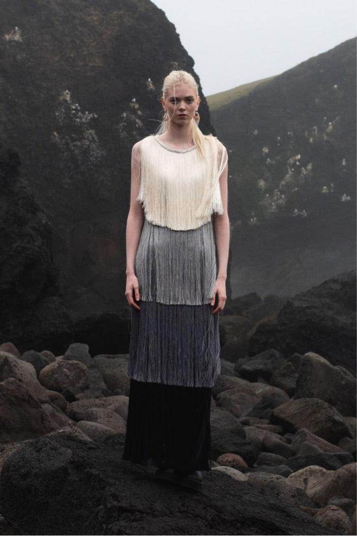 Cascading layered fringe-maxi dress with boat neck detail. Lined with a bodycon mini dress made of stretch Ponte. Light to dark (ombré effect) and Long to short. Zipper on the wearer's left side.
