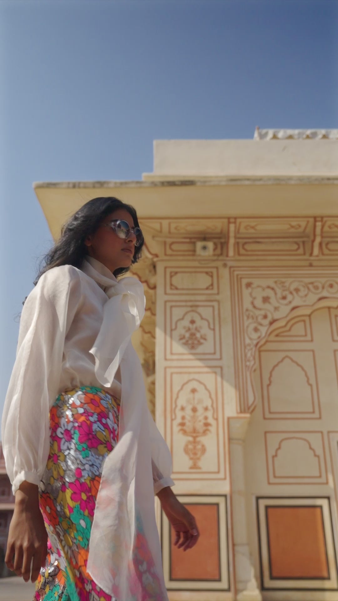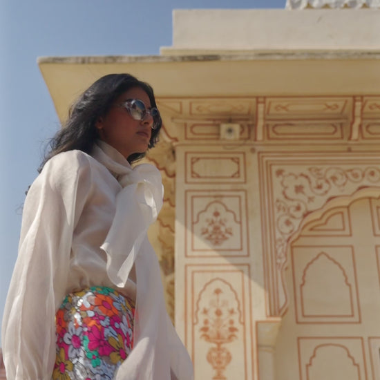 White organza shirt with an exaggerated front tie neck and bishop sleeves. Includes snap button closures on the cuffs and a button-down front. Comes with a slip.