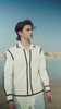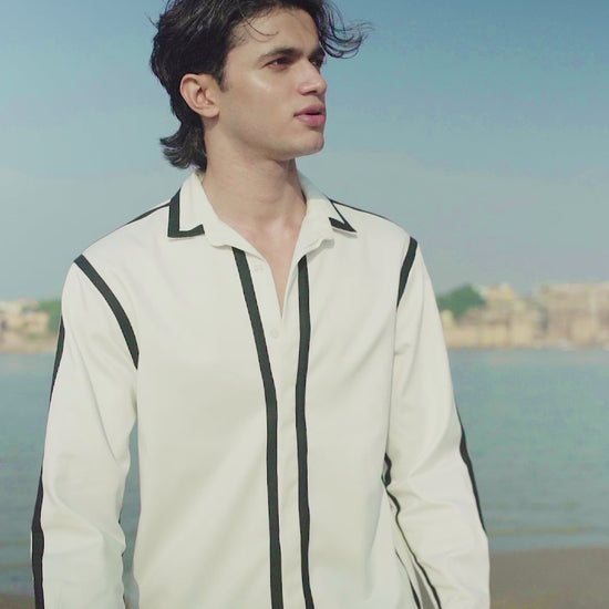 White regular fit pant set in all weather-suting material. Contrast black stripes outlining the front, back, shoulder, sleeves, collar of the shirt, and sides and bottom hem of the pants. The shirt has concealed placket and full sleeves. The pants are straight-fit. Hook and zip closure at the front. Elasticated at the back. Pockets on the sides and back. Belt loops.