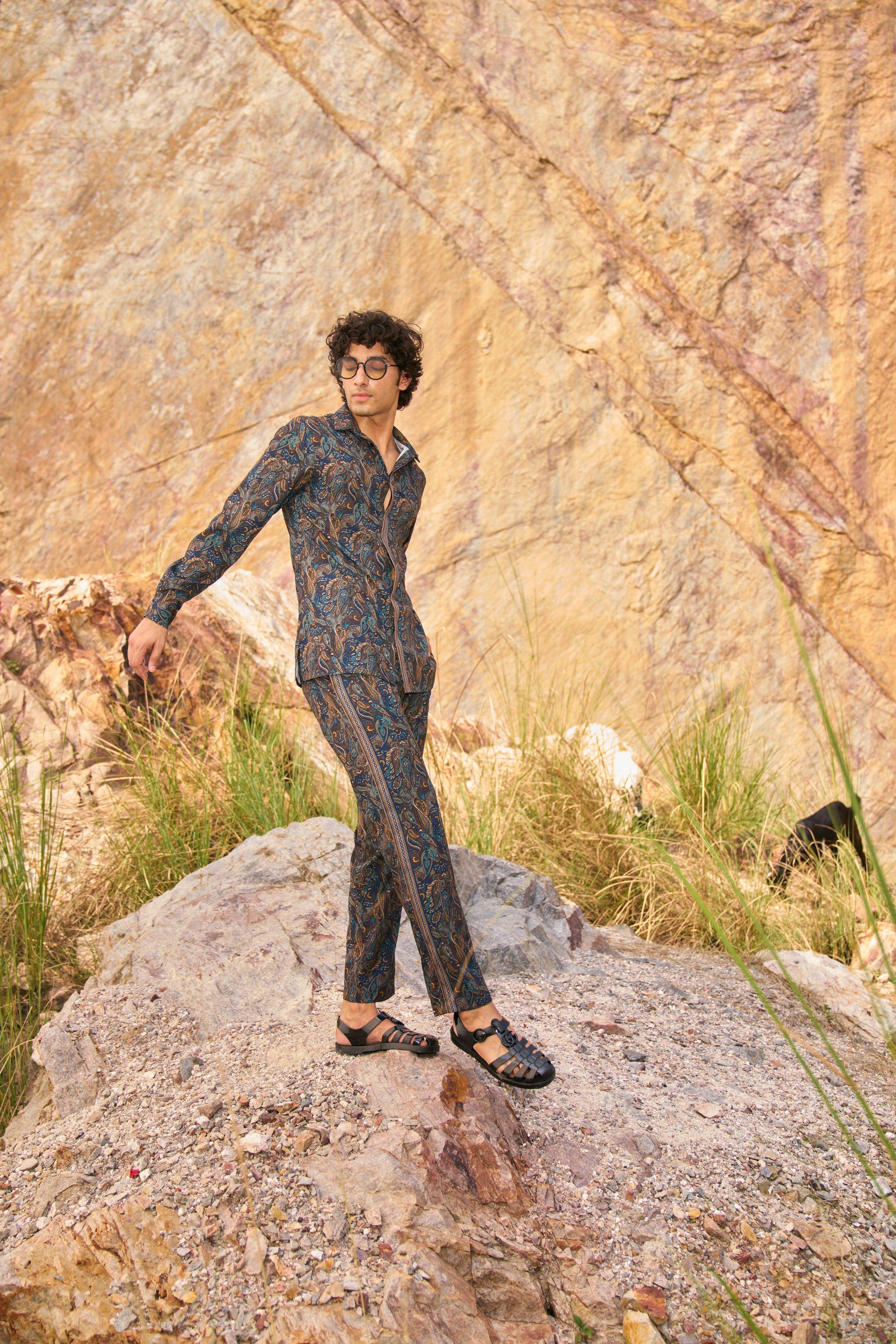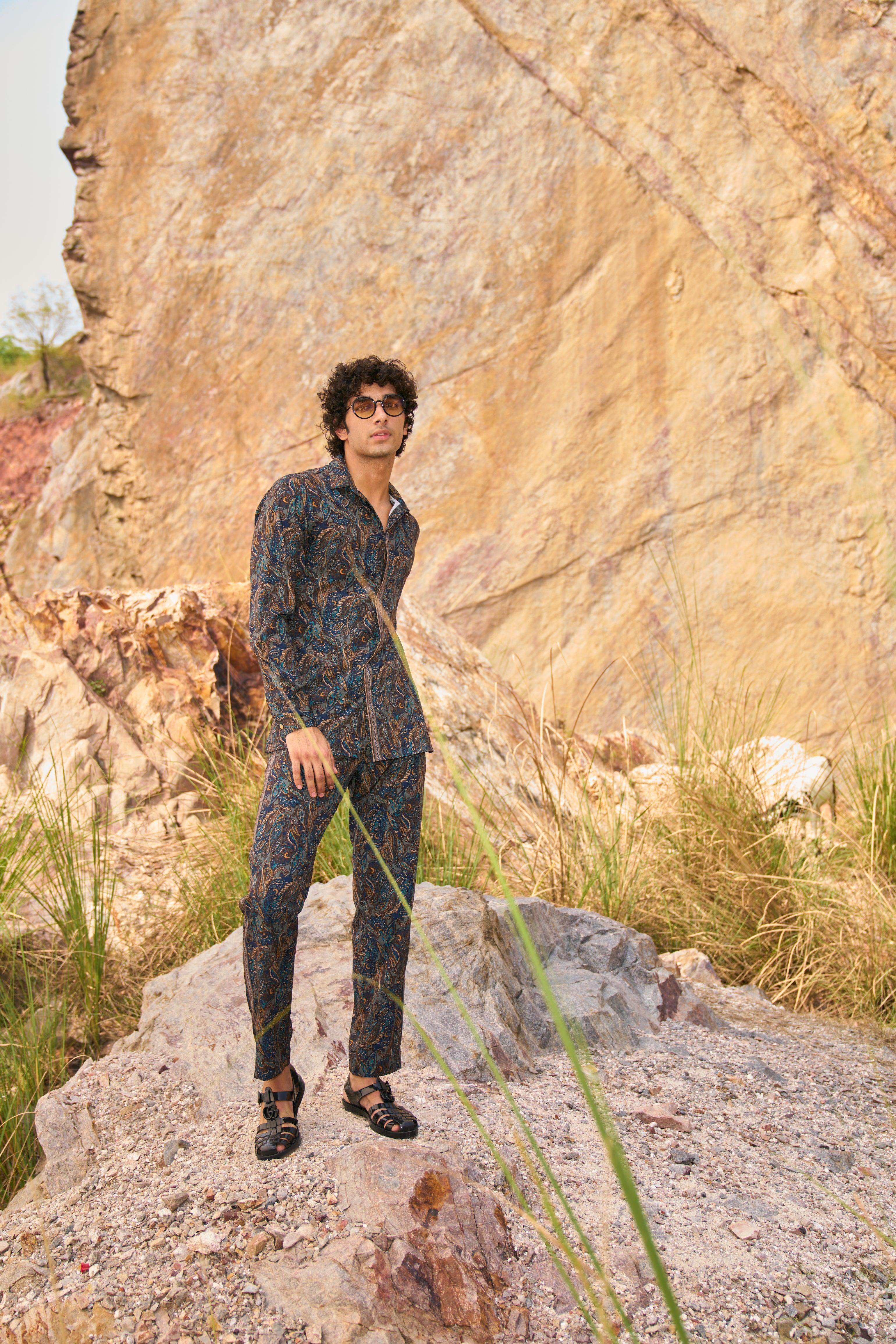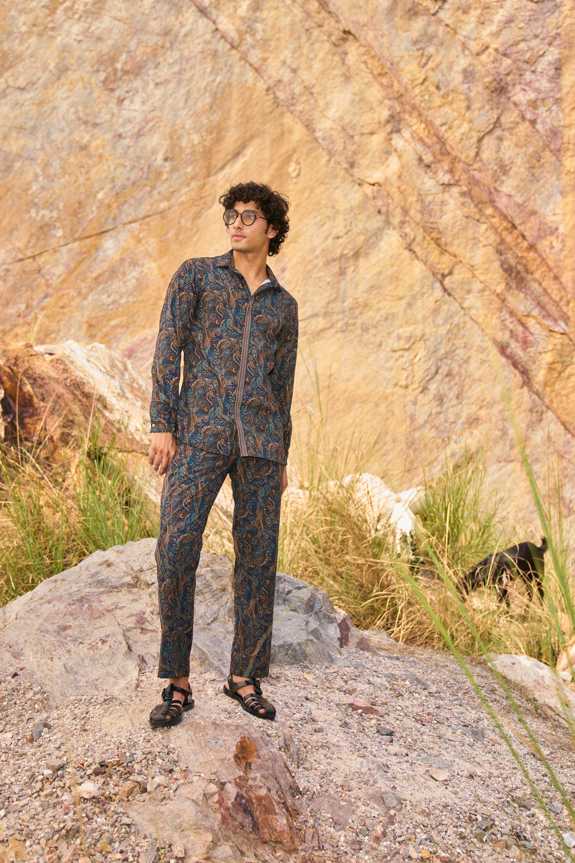 Allover paisley printed longline full sleeve shirt. Concealed button placket with a border print. Comfort fit.