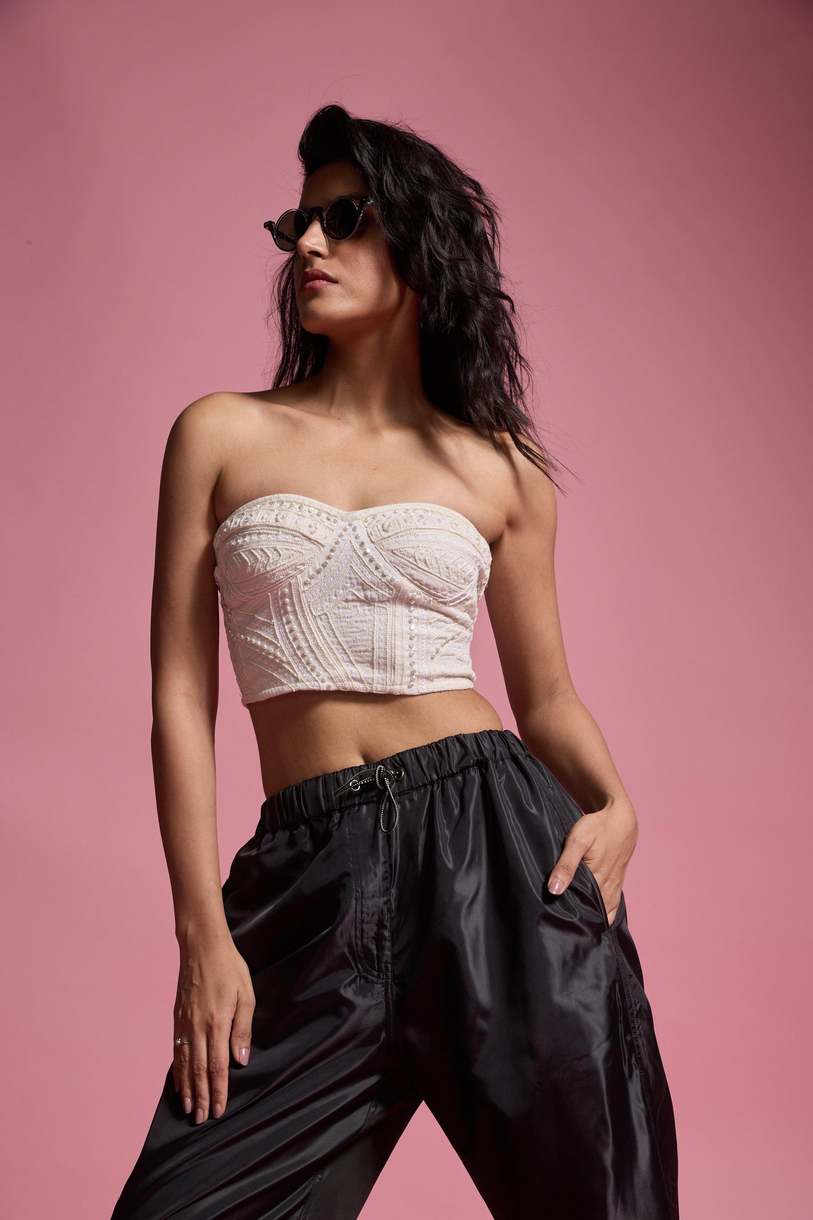Tonal ivory bustier bralette, fully embroidered with thread and hand-applied pearl beads. Corset-inspired shape with smocked back for a comfortable fit. Fully lined. Detachable, adjustable straps included.
