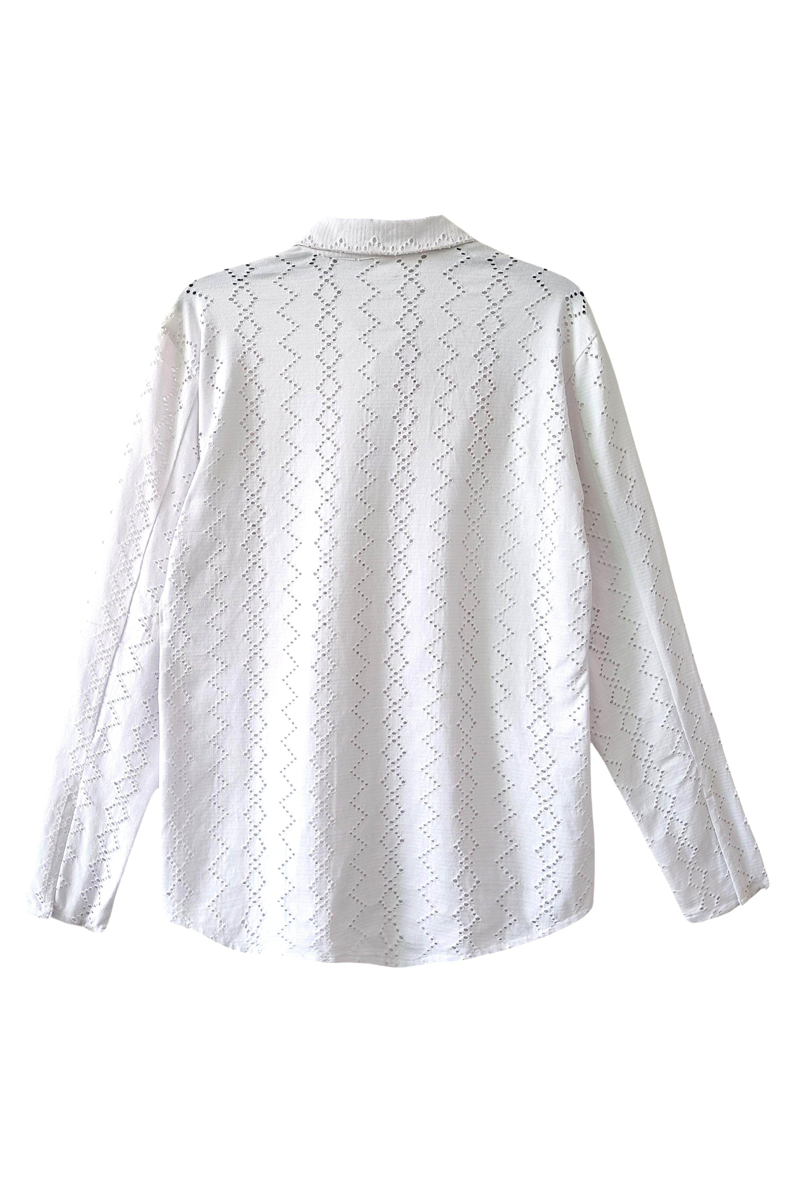 White full-sleeve shirt in geometric patterned pointelle knit fabric. Concealed button placket at the front, snap button closure at the cuffs. Regular fit.