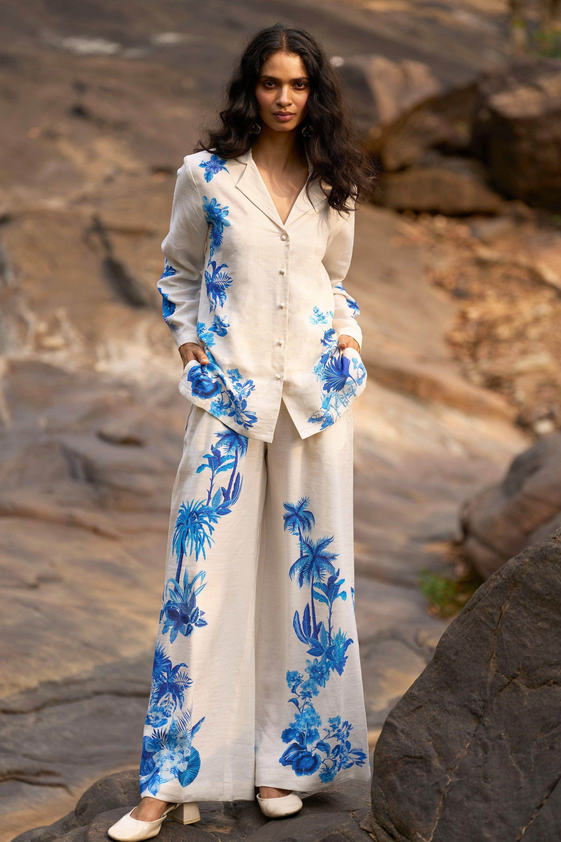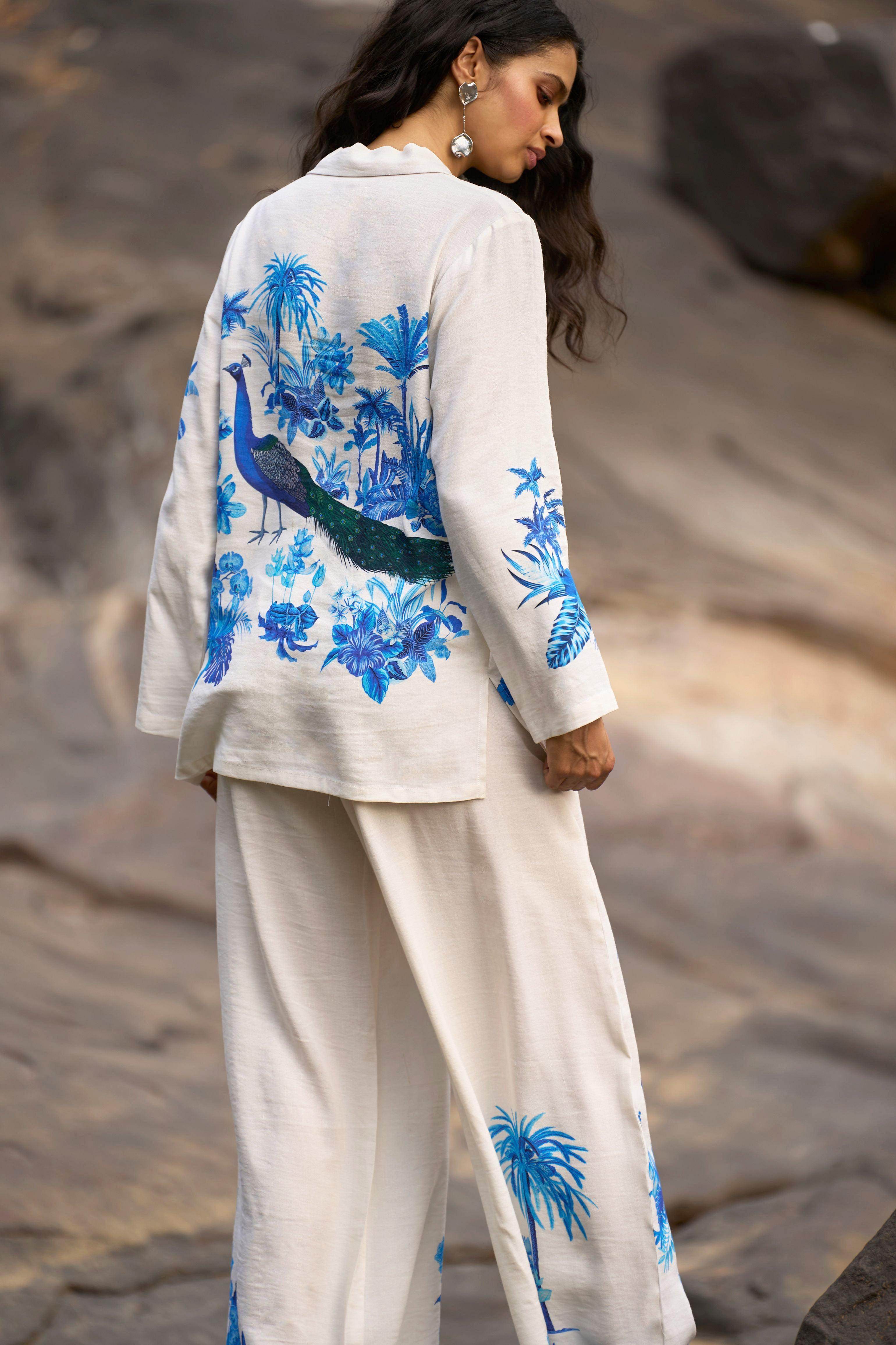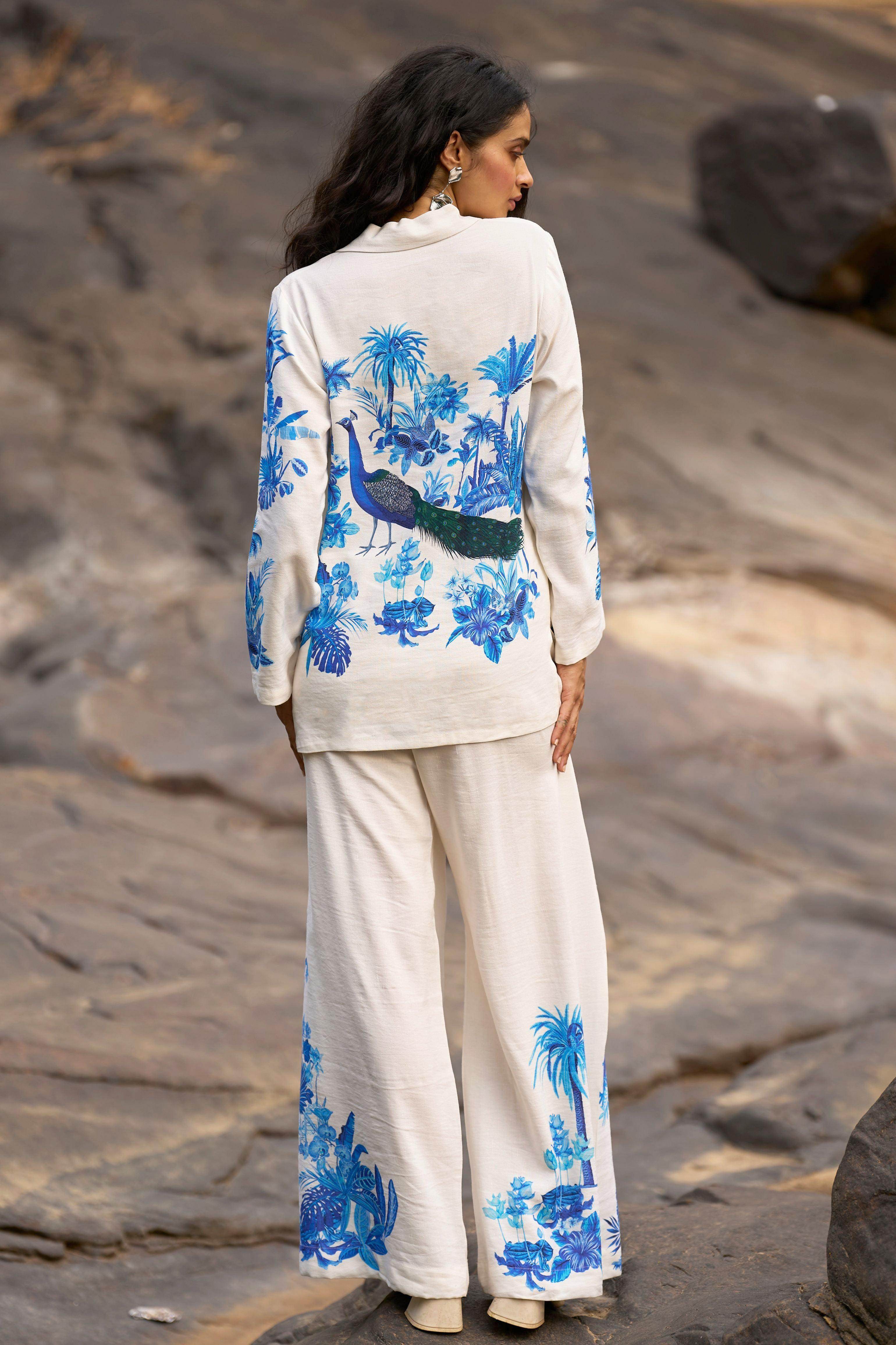 Boxy white linen shirt with placed prints in tones of ink and blue. Soft floral motifs in the front complement the large scale peacock and floral motifs in the back. V-neck with notch collar. Front button down placket. Full sleeves.