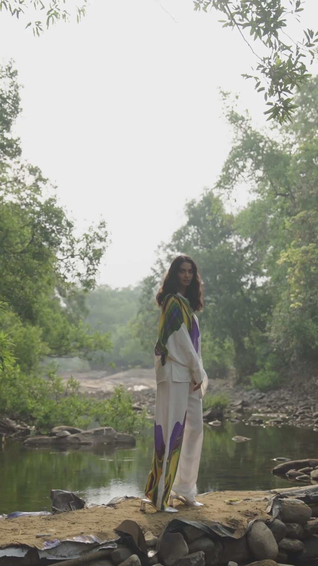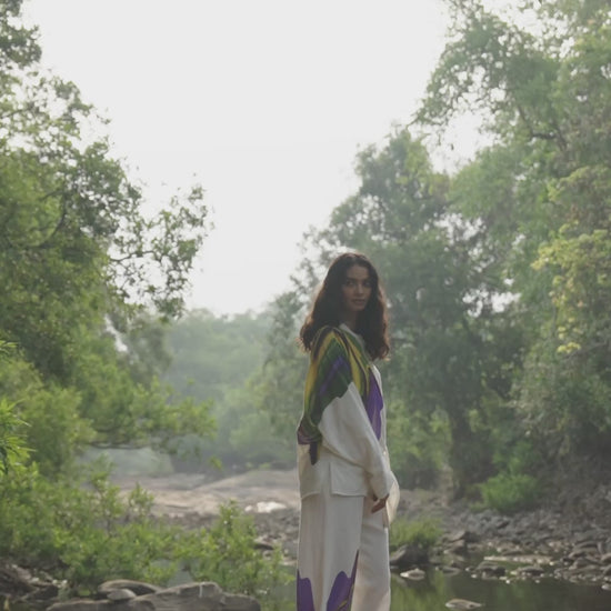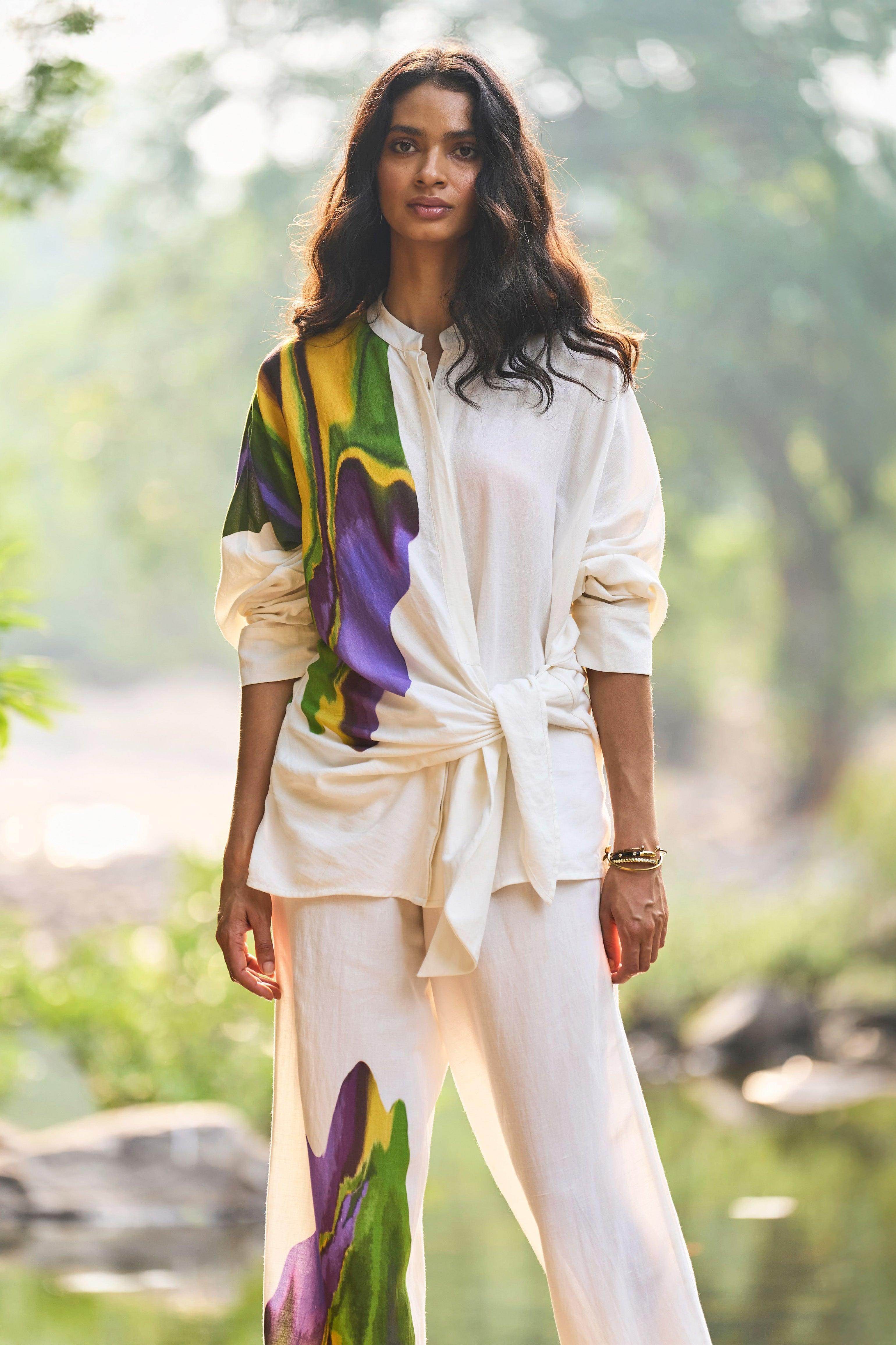 White linen full sleeve button-down shirt with dolman sleeves and a self-tie knot on the side. Placement abstract watercolour print on the shoulder. Concealed placket, and side slits for ease. Regular fit.