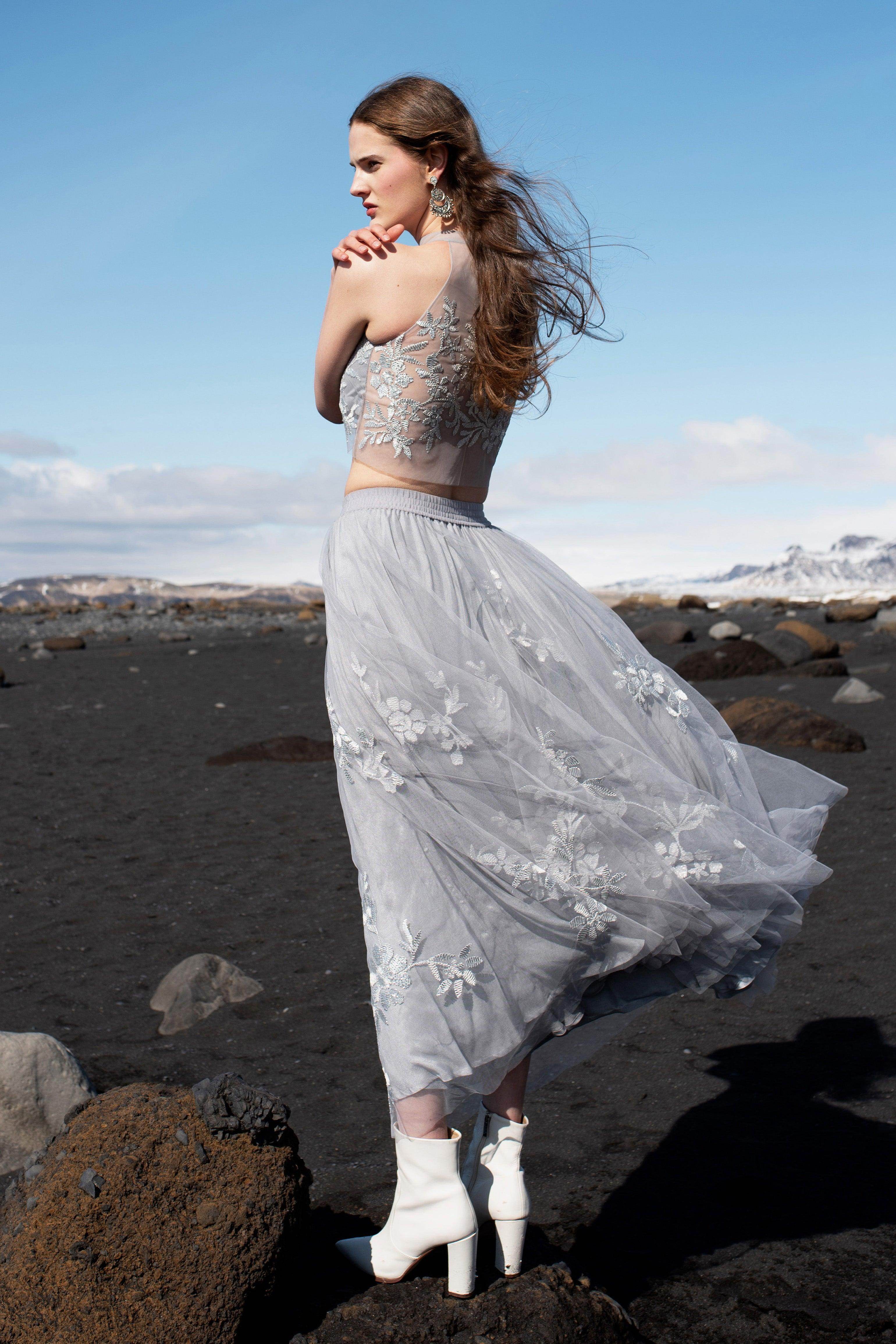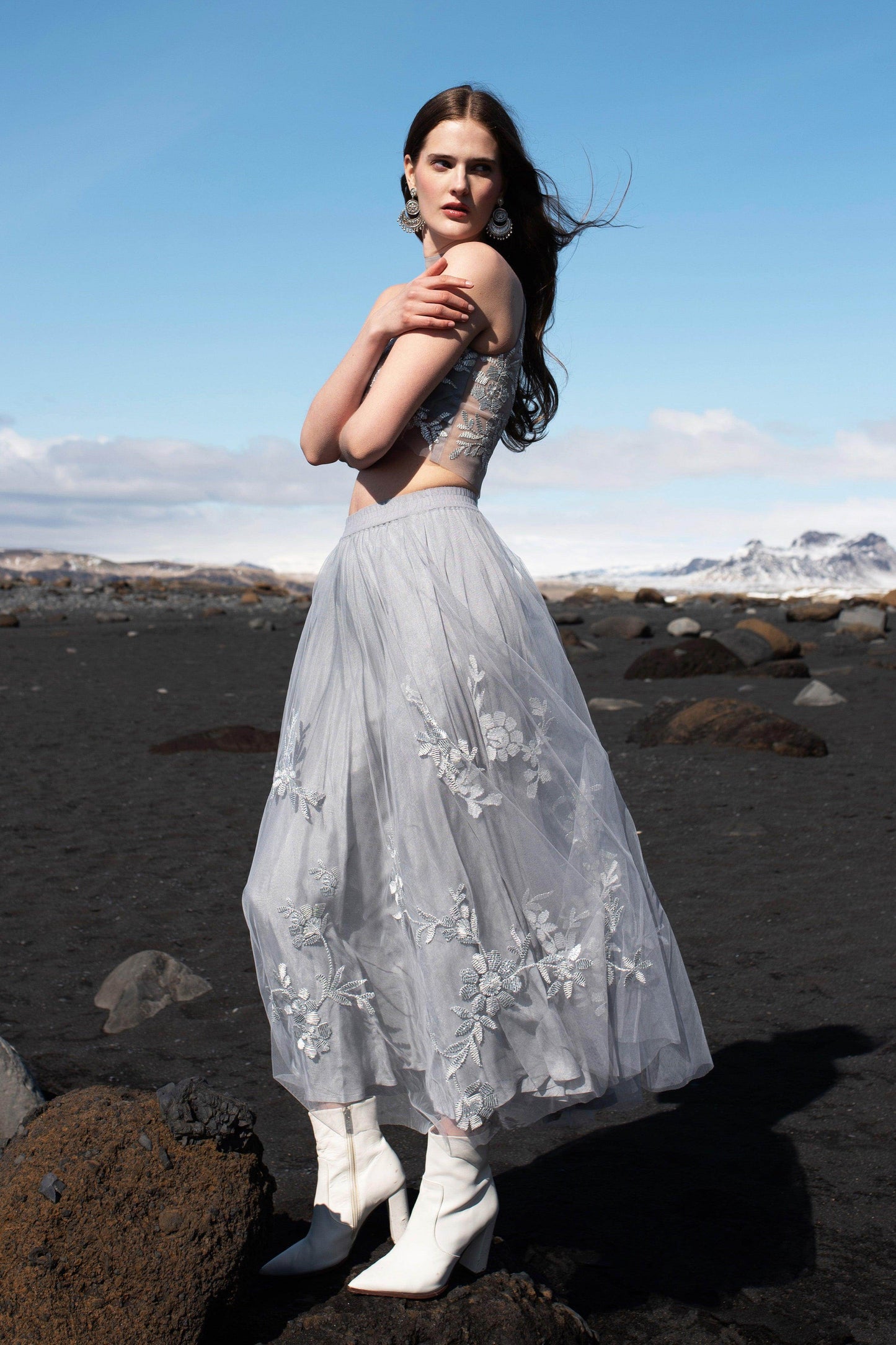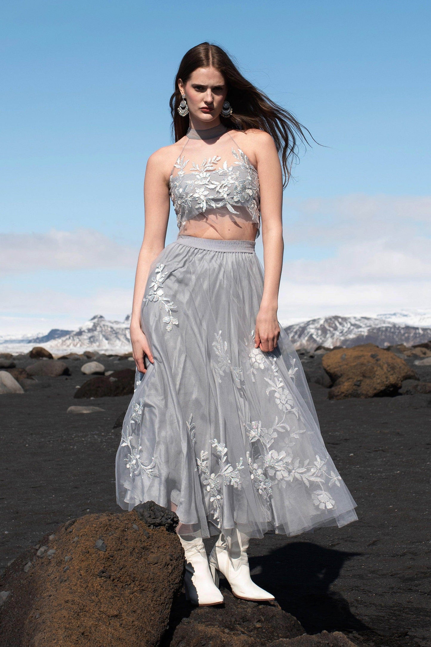 Steel grey skirt set crafted in soft tulle fabric manually embellished with silver gota ribbon embroidered motifs. Illusion neckline top with placement floral ribbon embroidery at the front and back. The top is semi-lined at the front and has a button loop closure at the back neck. Paired with a matching skirt with scattered allover floral ribbon embroidered motifs. Elasticated at the waist. The skirt is fully lined. Hand raw-cut hem on the top and the skirt.