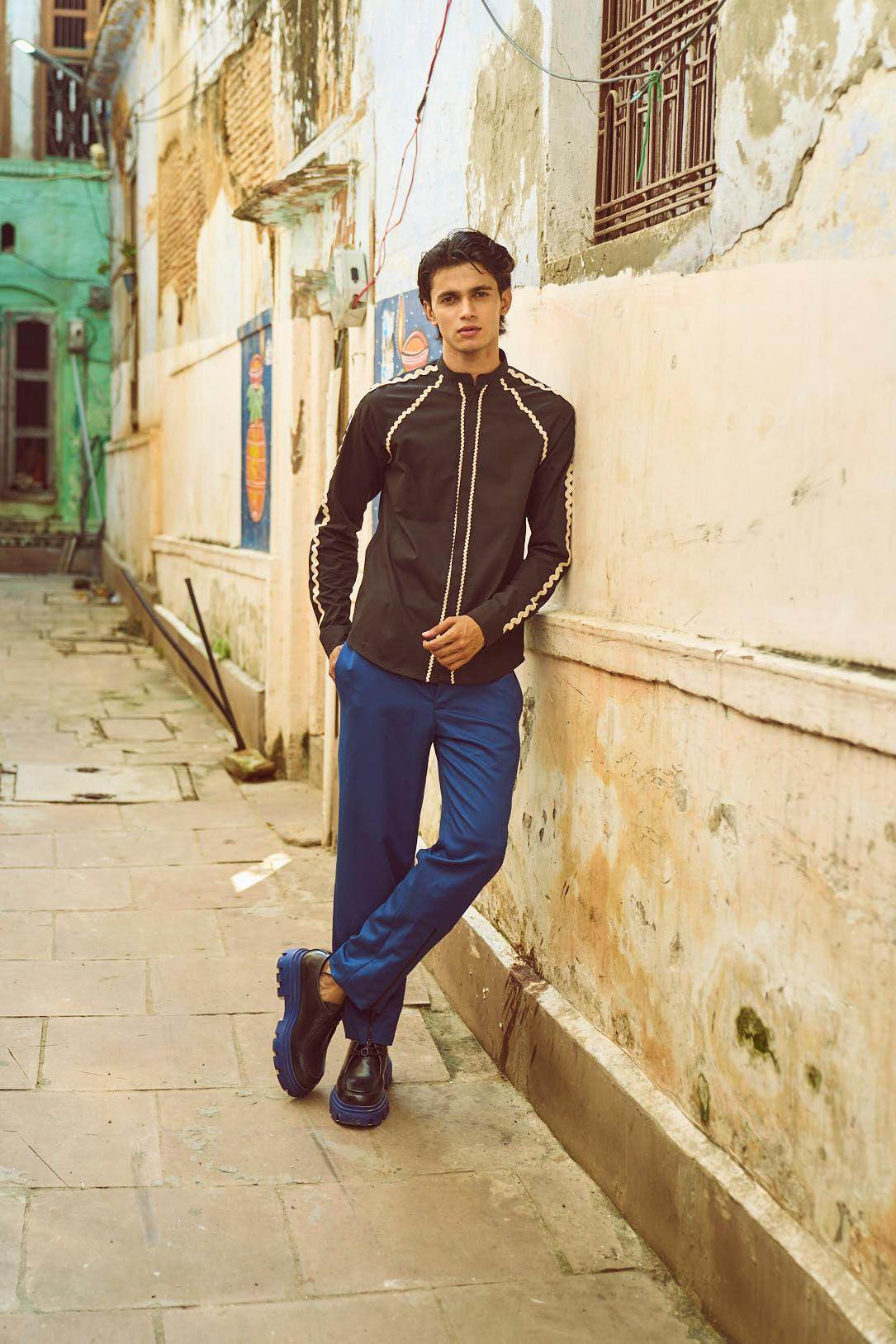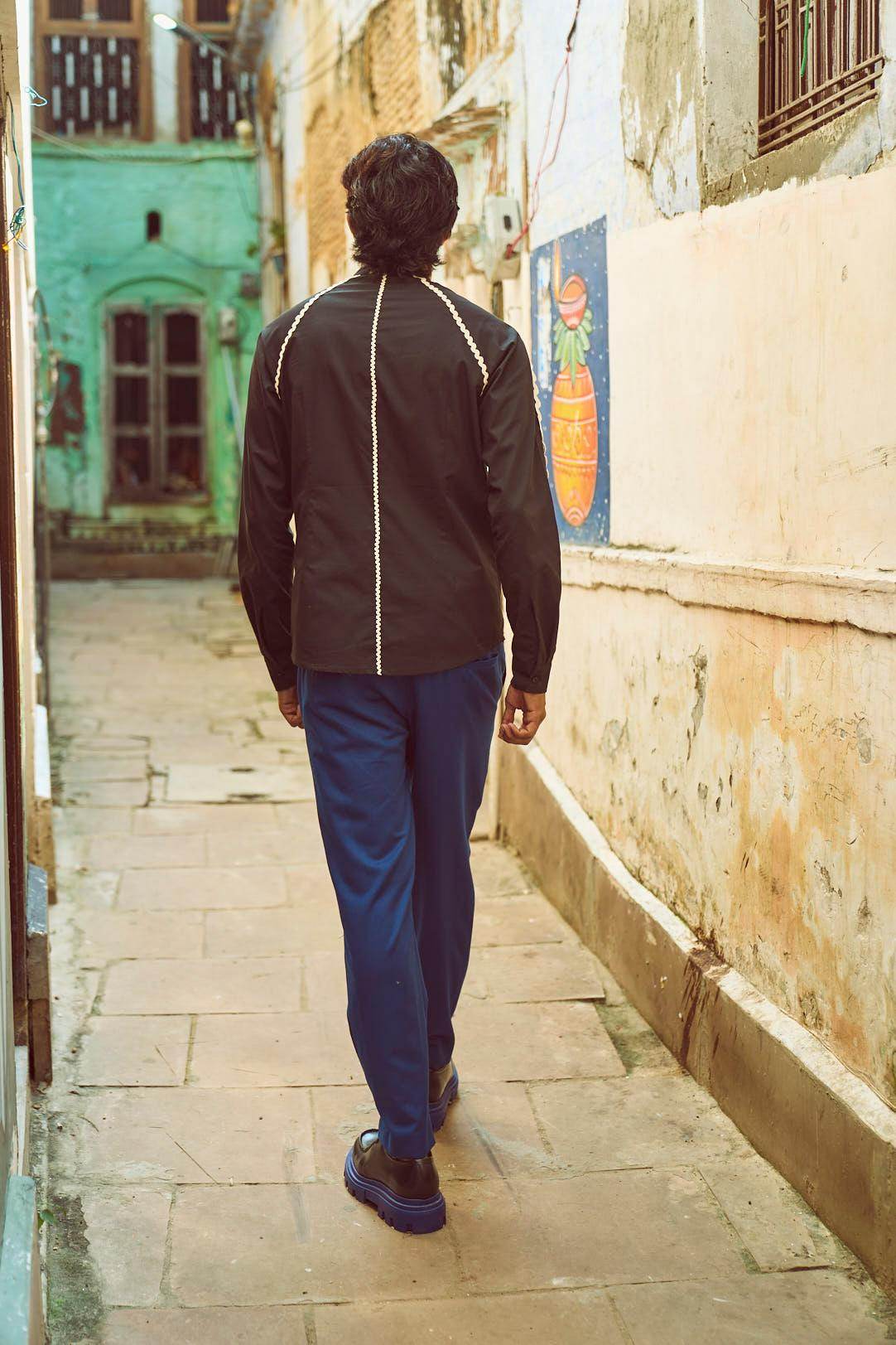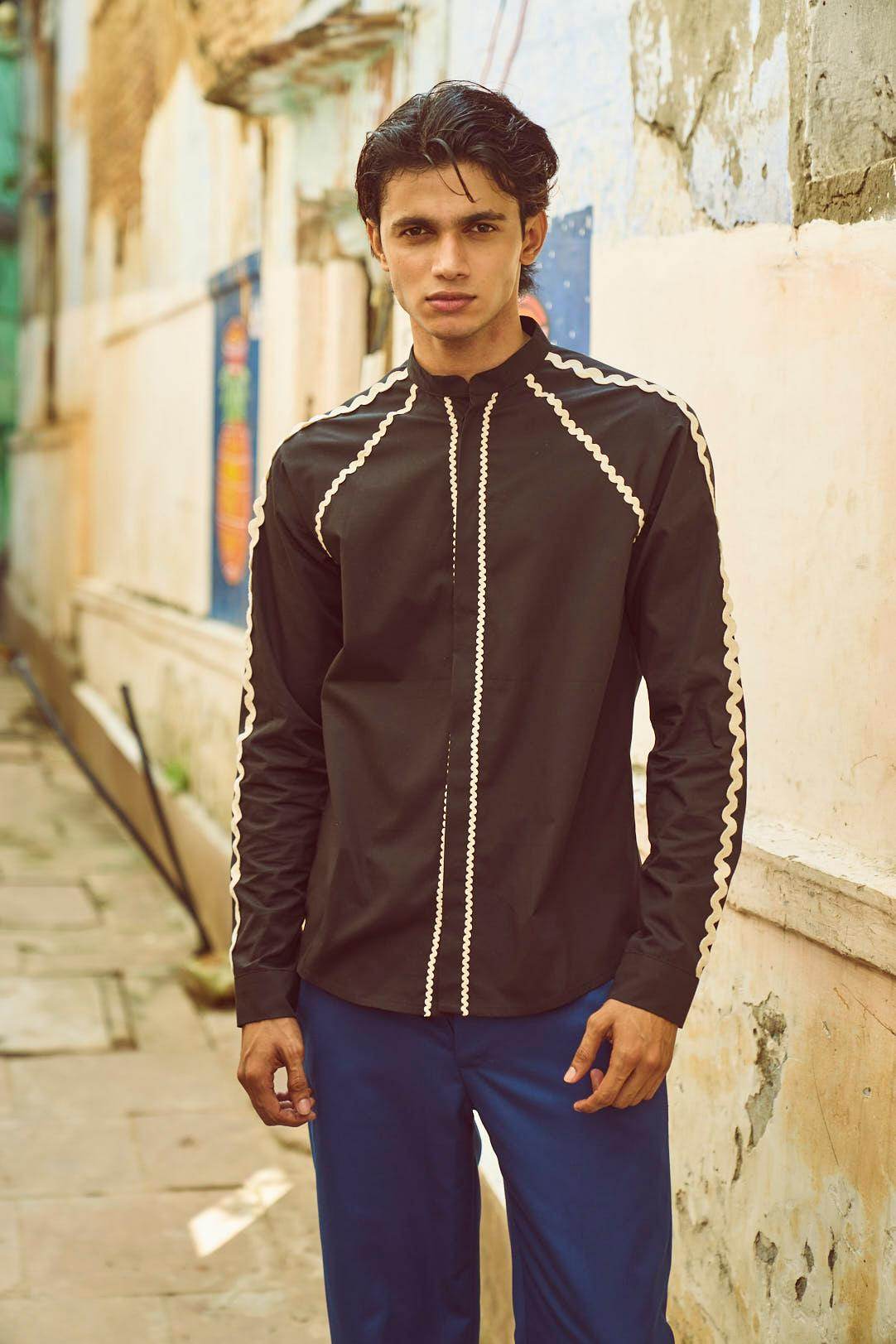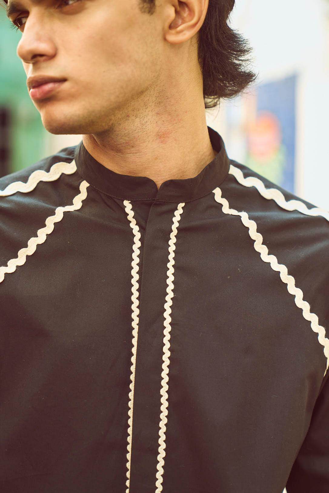 Band collar shirt in black cotton poplin. Contrasting ivory rick-rack tape placed on the center, front, shoulder, back, and sleeves in varying sizes. Concealed button placket. Full sleeves. Regular fit.