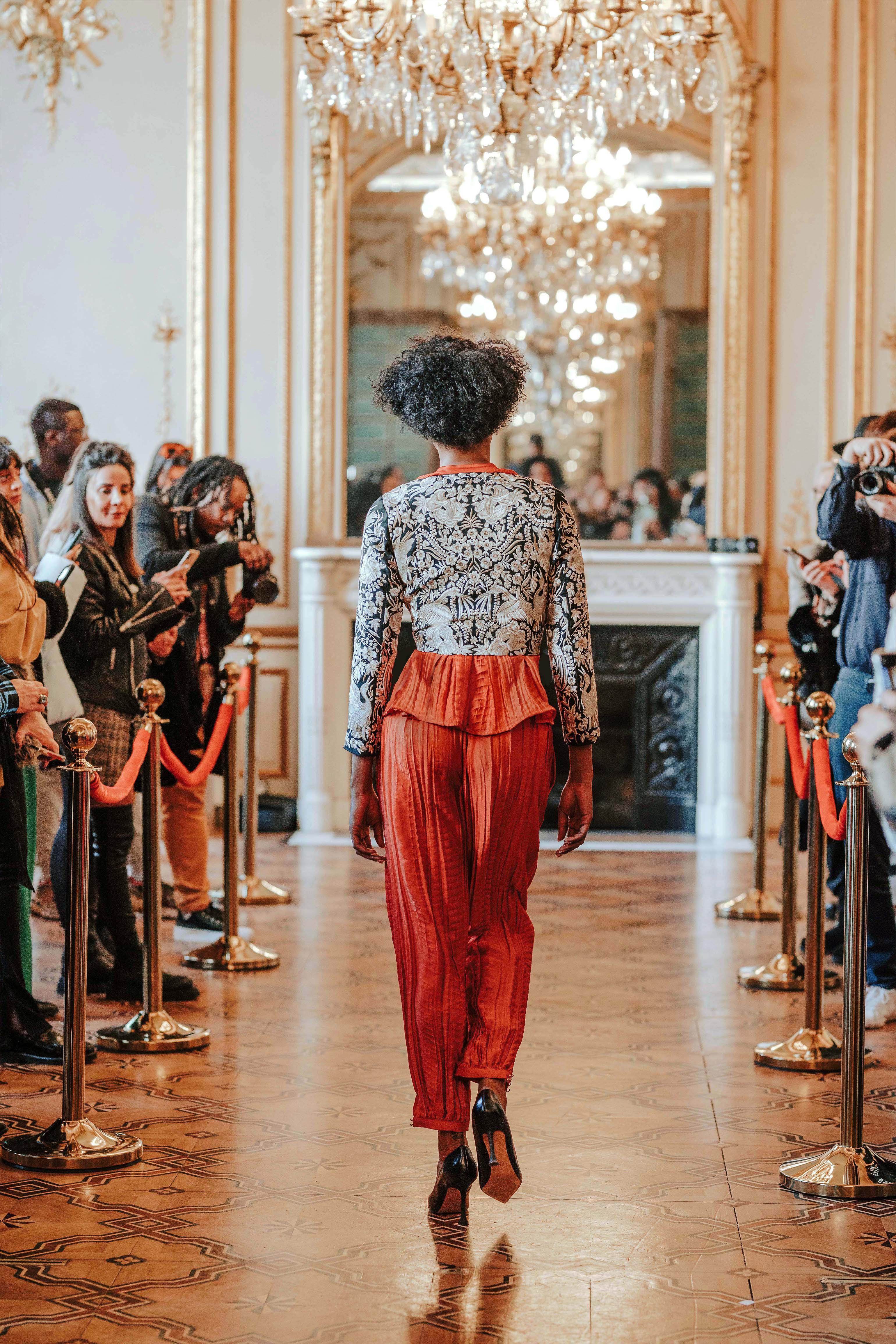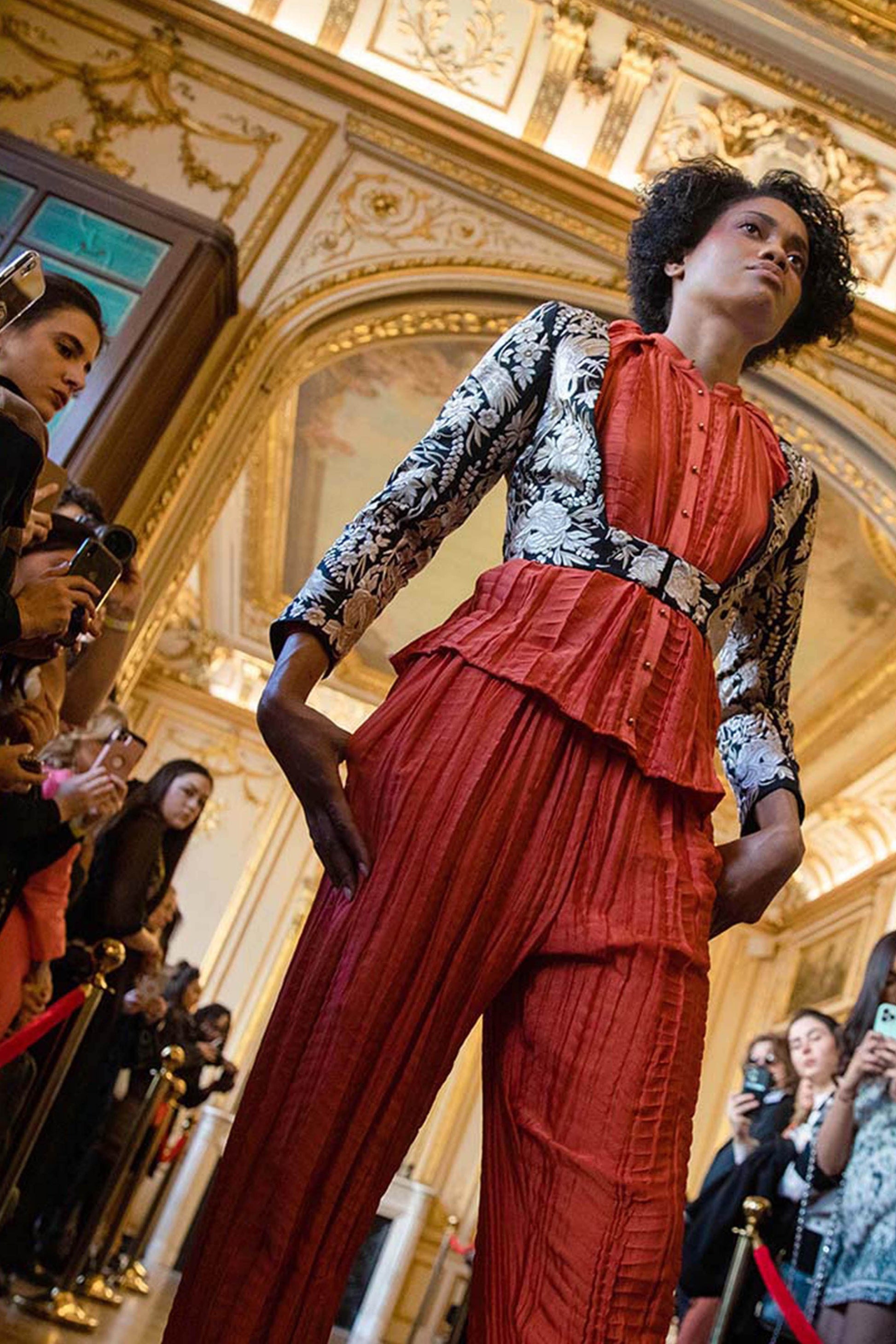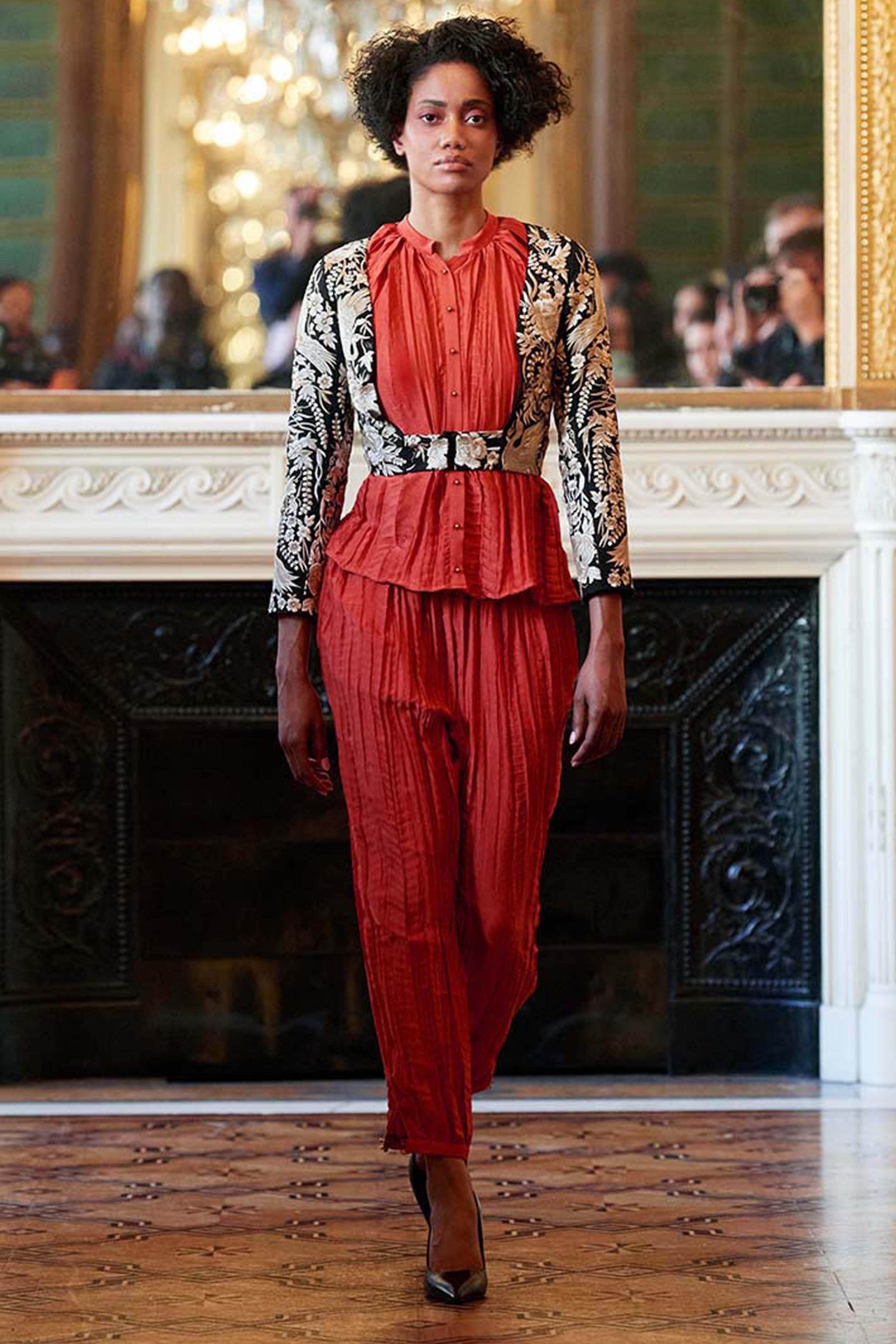 Rust hand-crushed shirt. Button-down shirt with center placket and metallic stud buttons. Band collar, full sleeves. Matching hand-crushed pants with pockets. Fully elasticated waist and metallic button opening at the cuff.