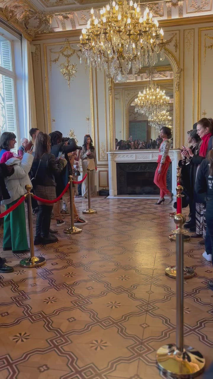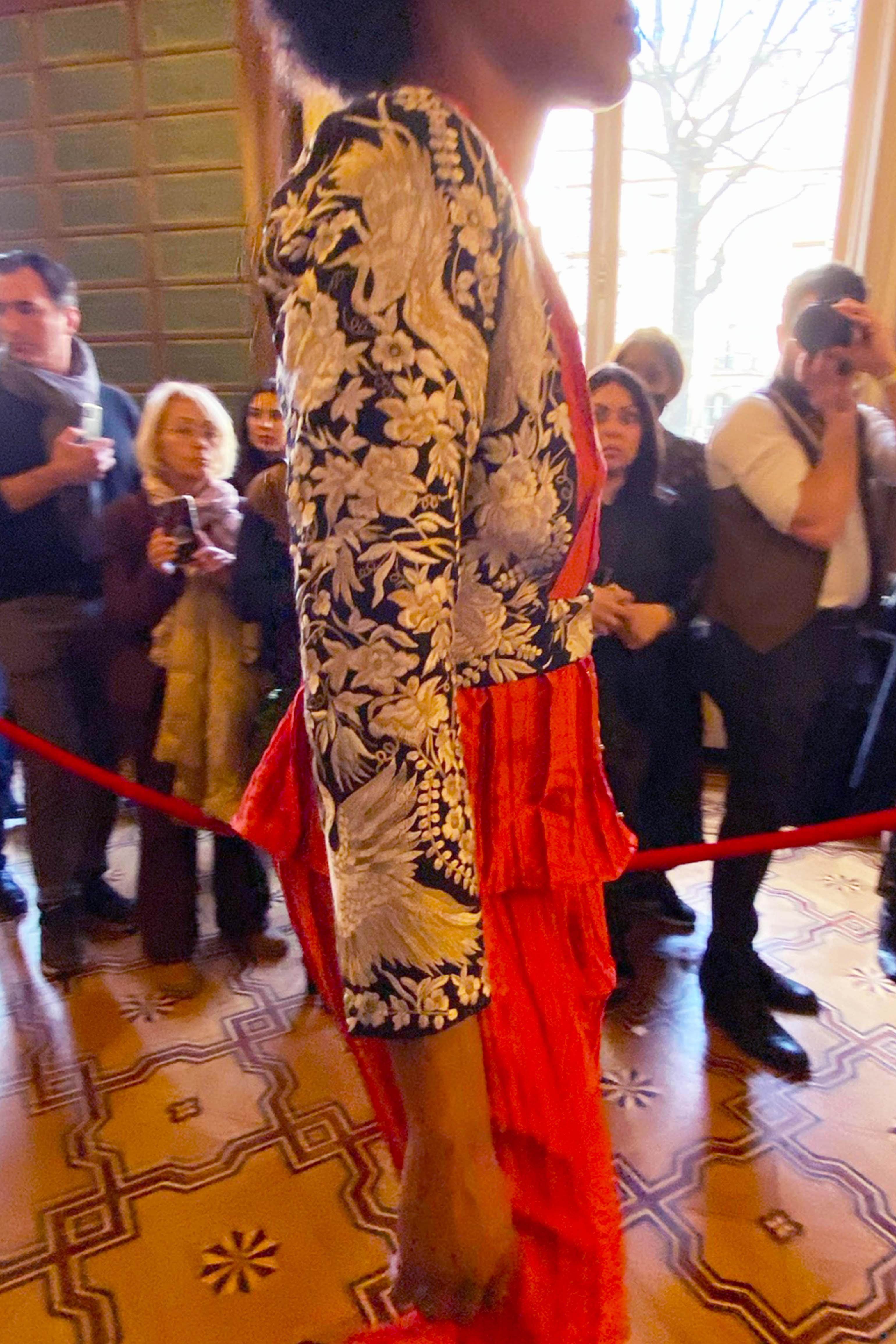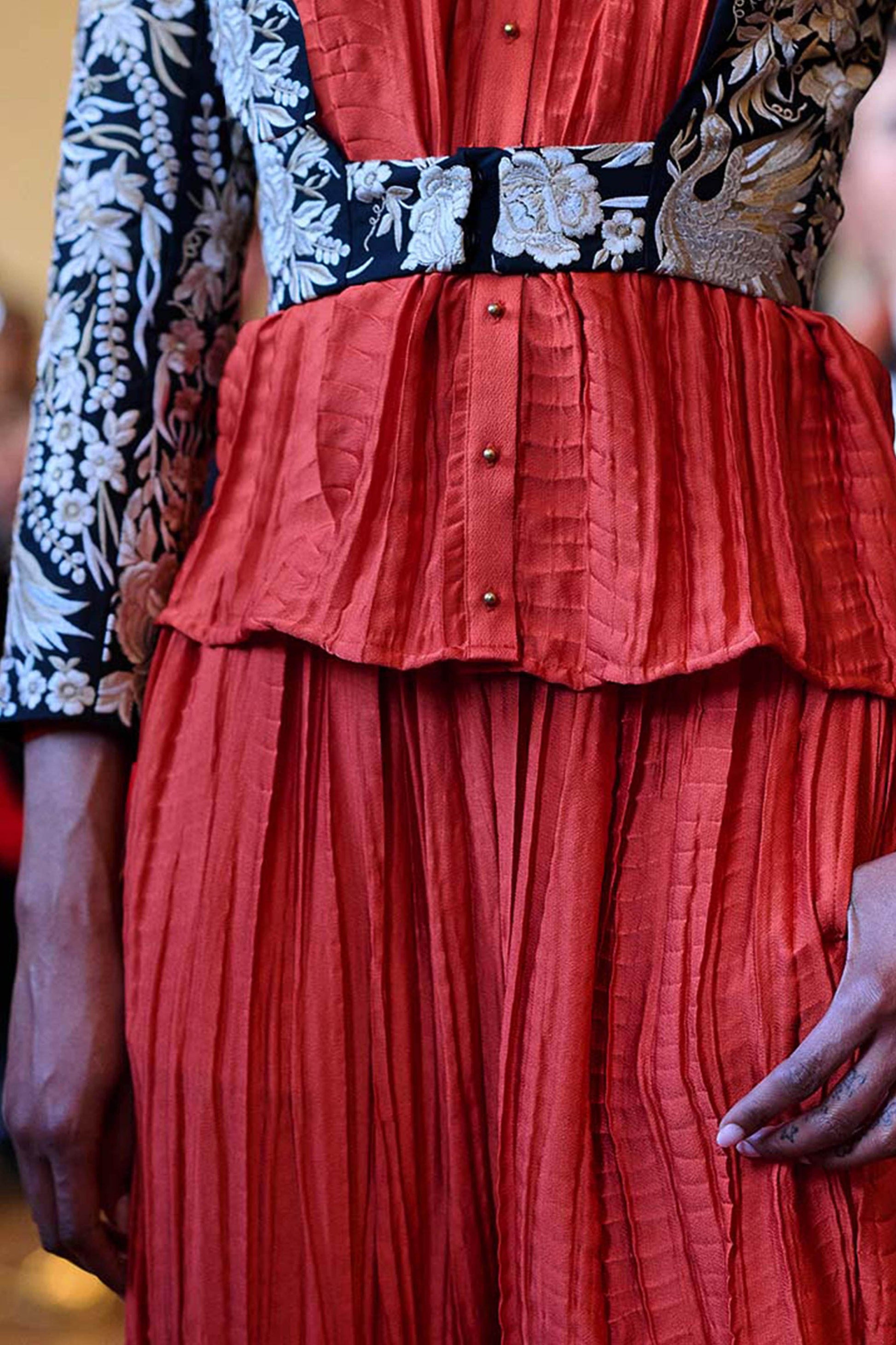 Rust hand-crushed shirt. Button-down shirt with center placket and metallic stud buttons. Band collar, full sleeves. Matching hand-crushed pants with pockets. Fully elasticated waist and metallic button opening at the cuff.