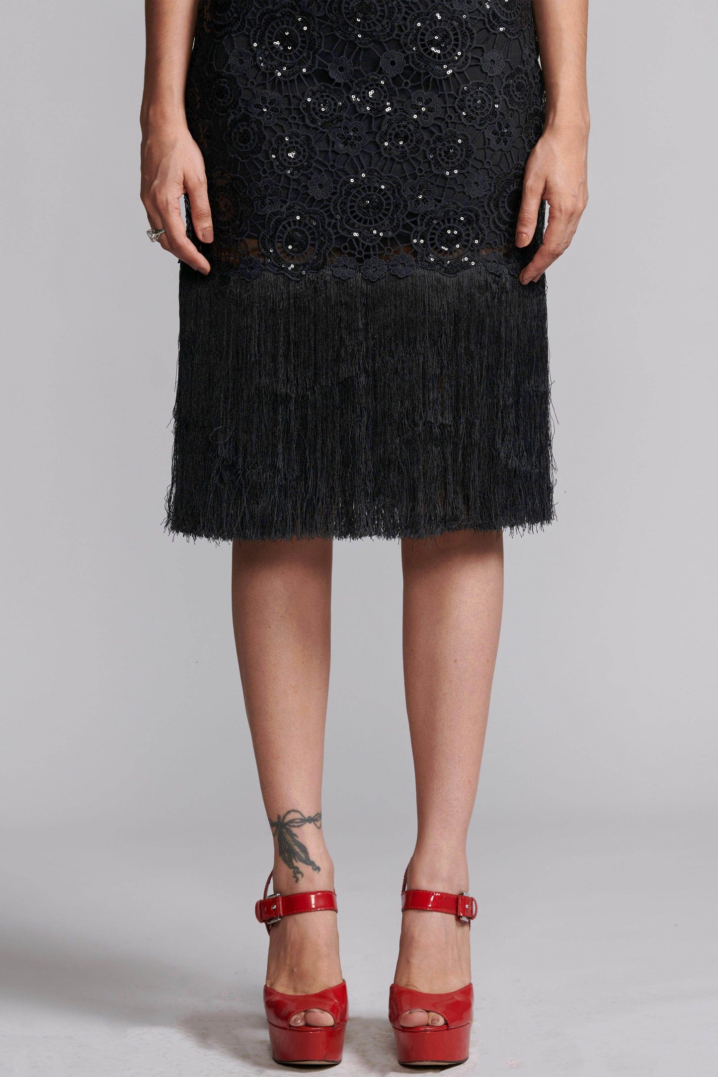 Black off-shoulder midi dress in floral cutout lace with sequin appliqué. Features hand-applied 3D flowers and sequins strategically placed. Fringe detailing at the hem. Side seam zipper. Comes with adjustable straps. Fully lined.
