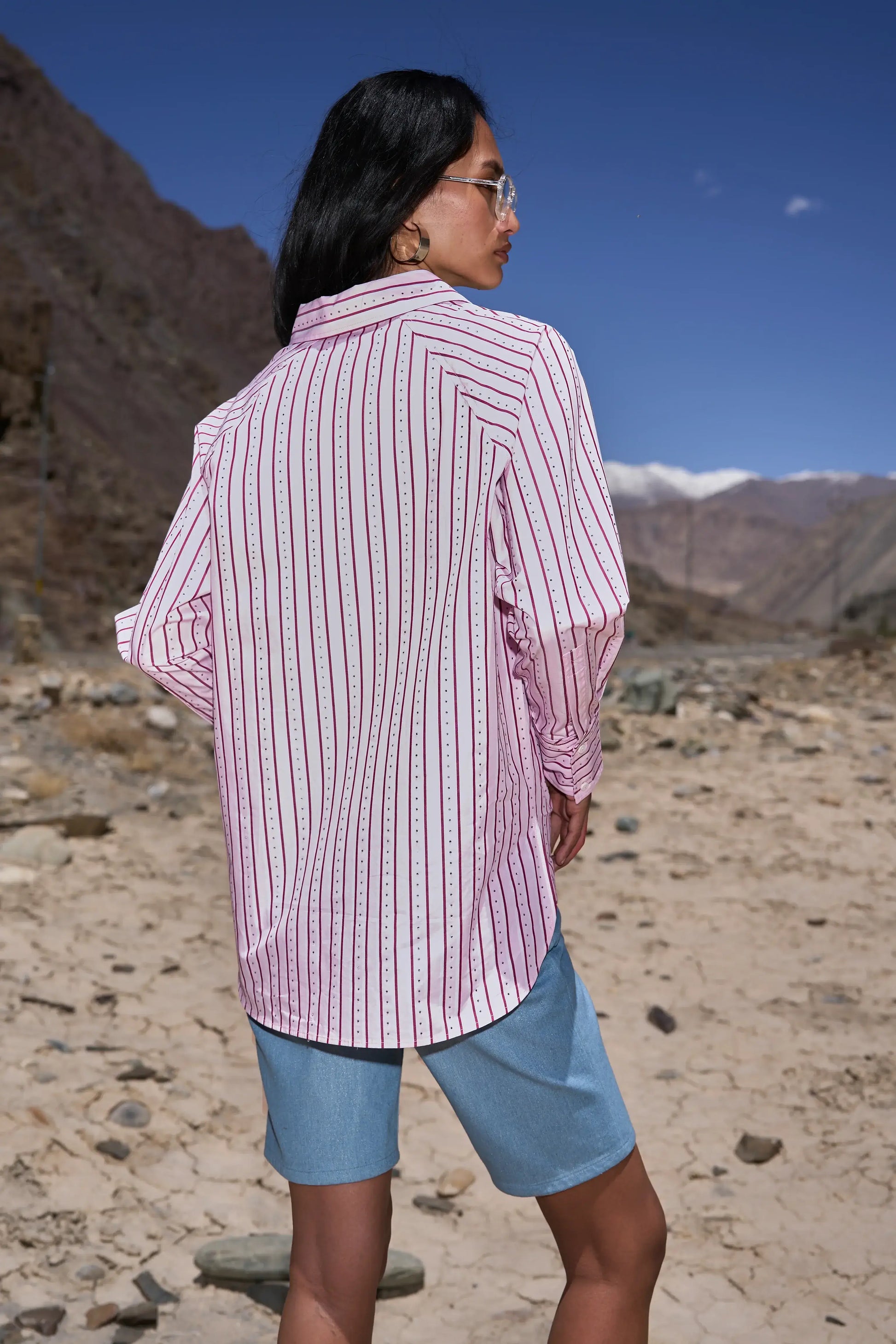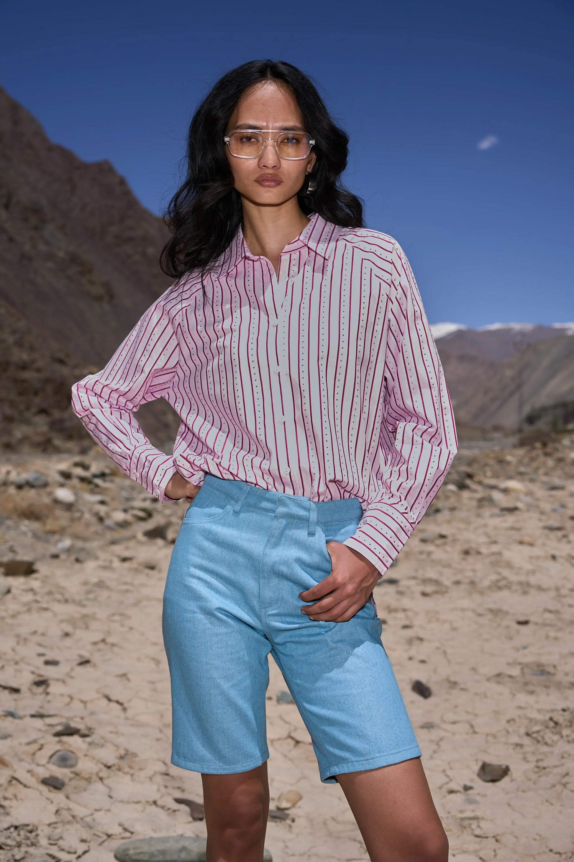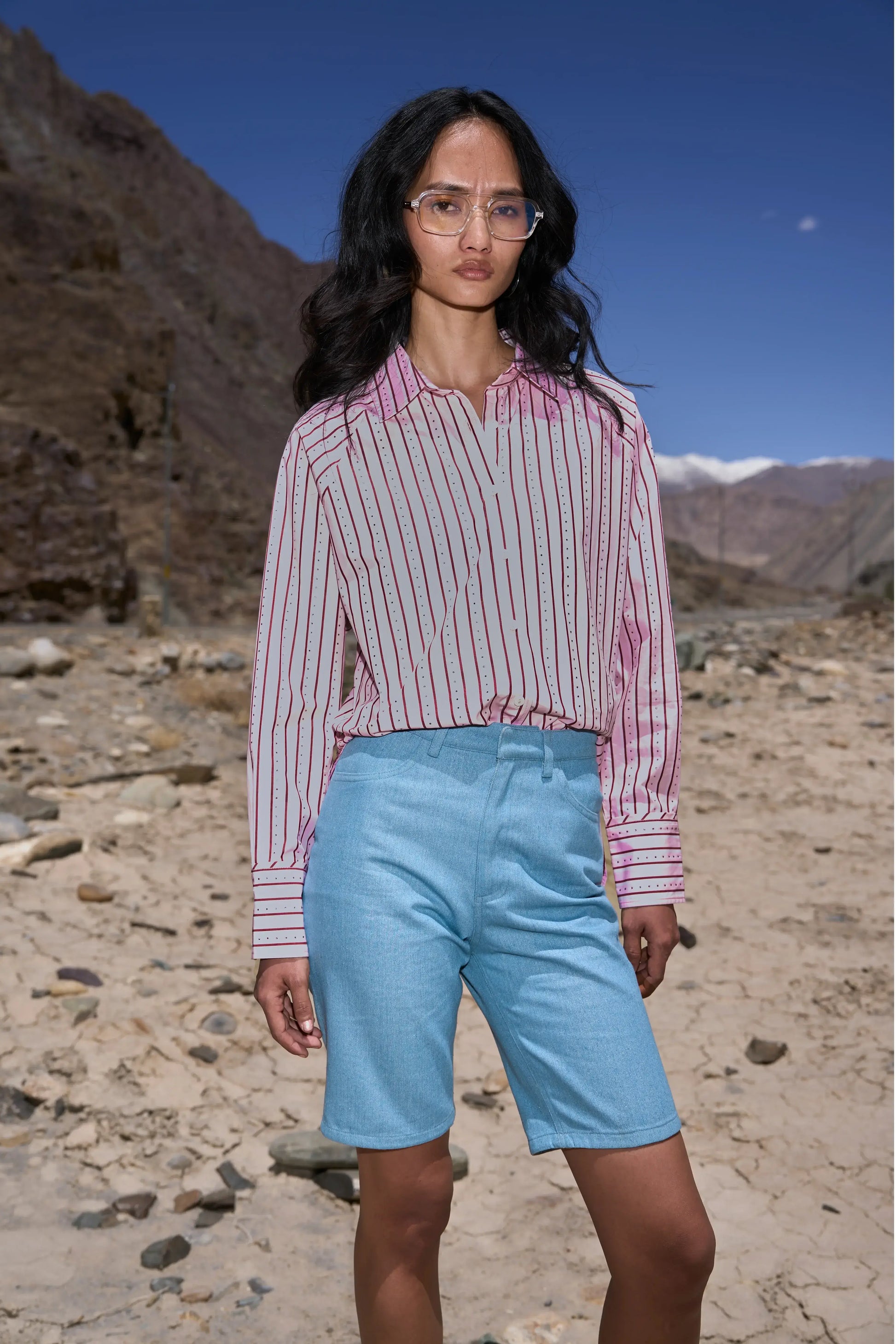Washed denim shorts with subtle shimmer and foil print effect. Belt loops at the waist, hook/eye and zip closure in the front. Pockets at the sides and back.