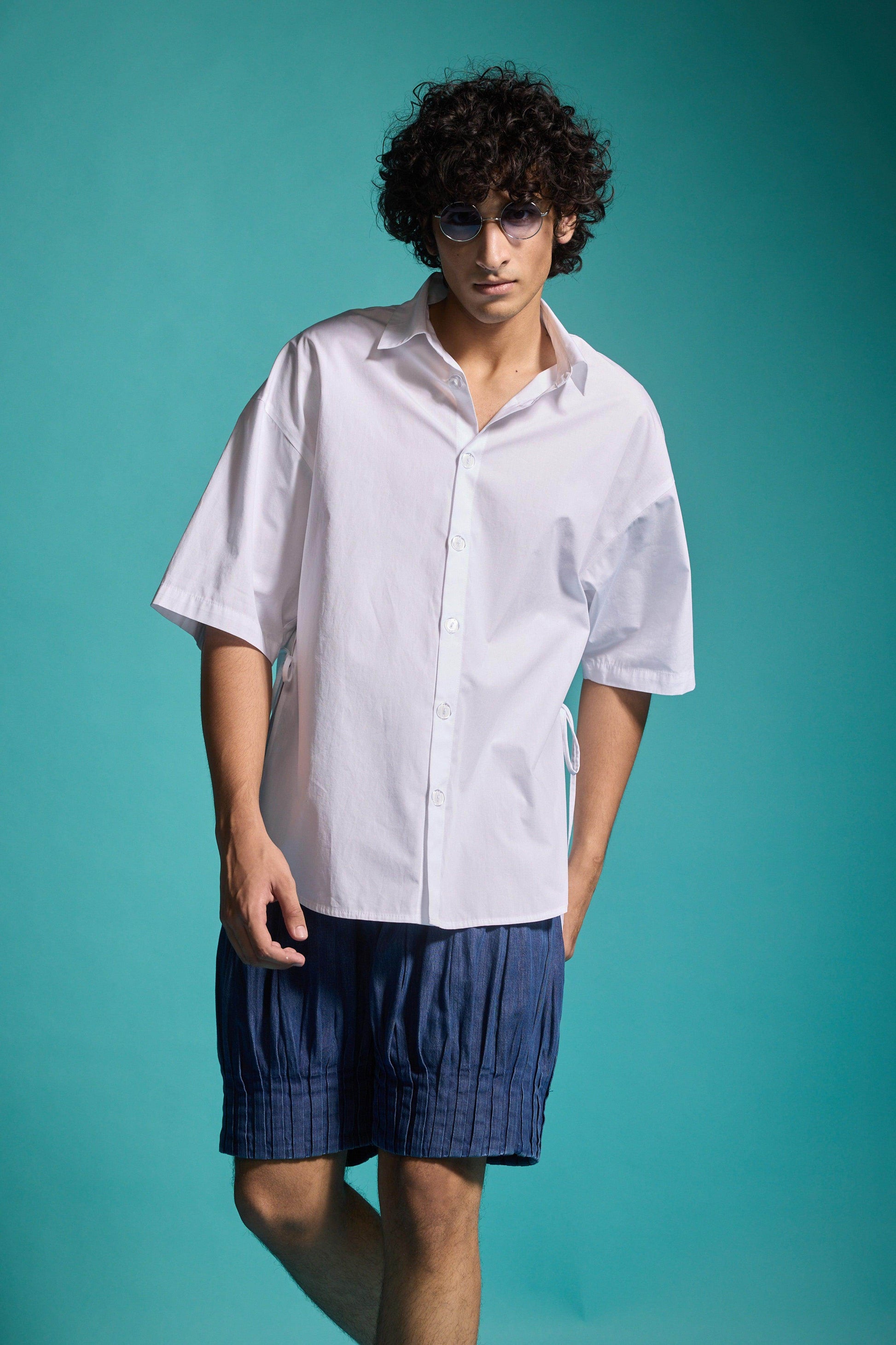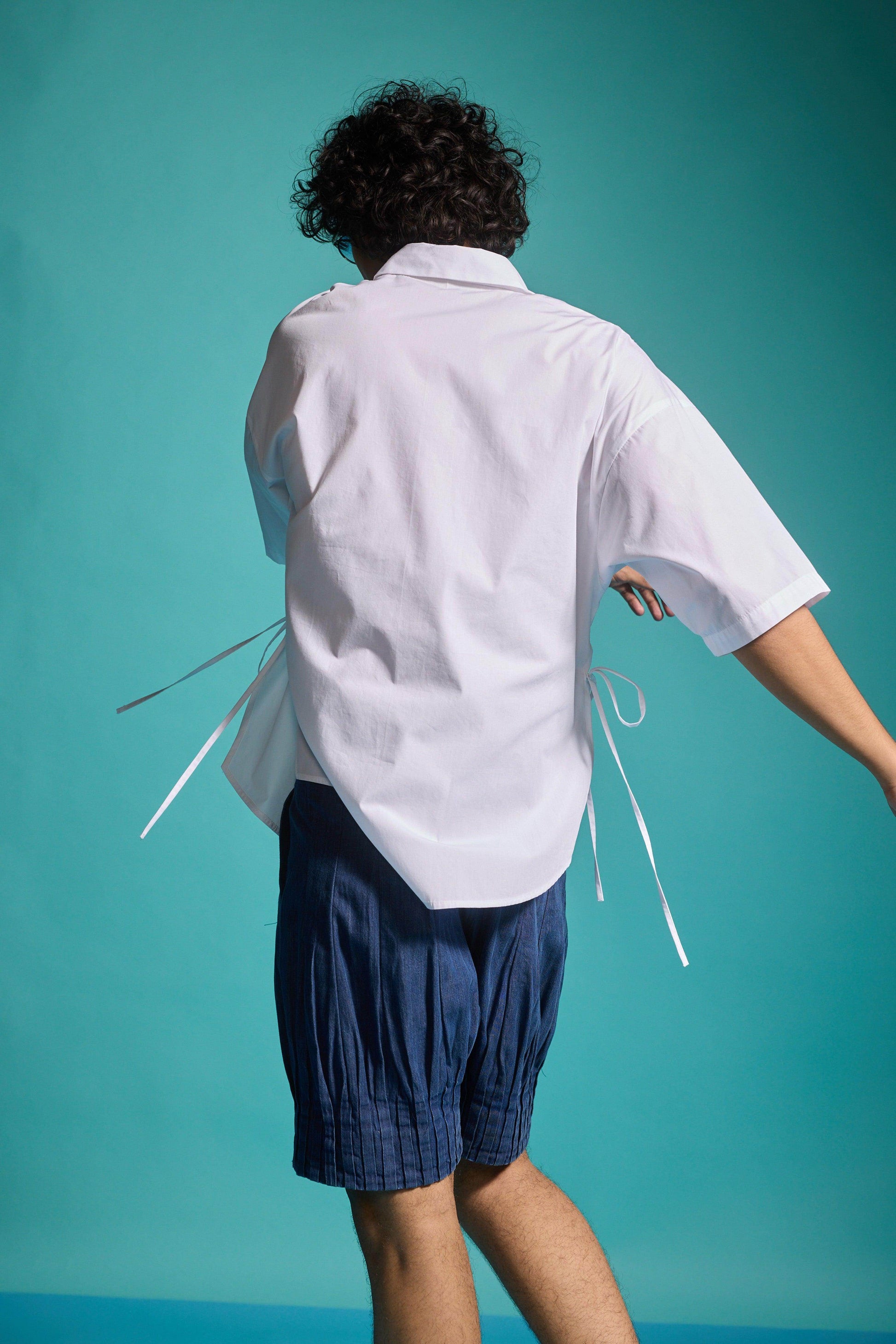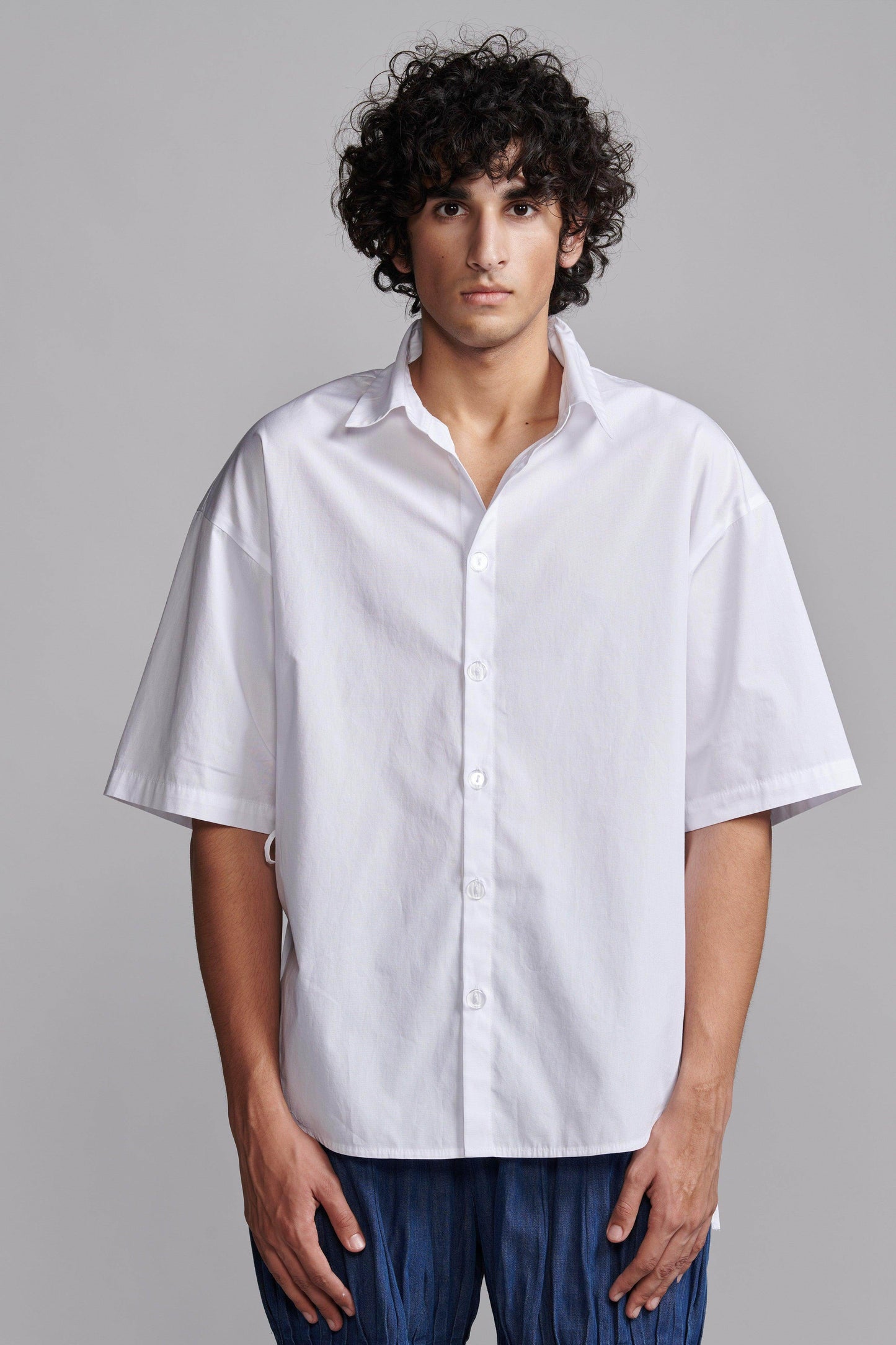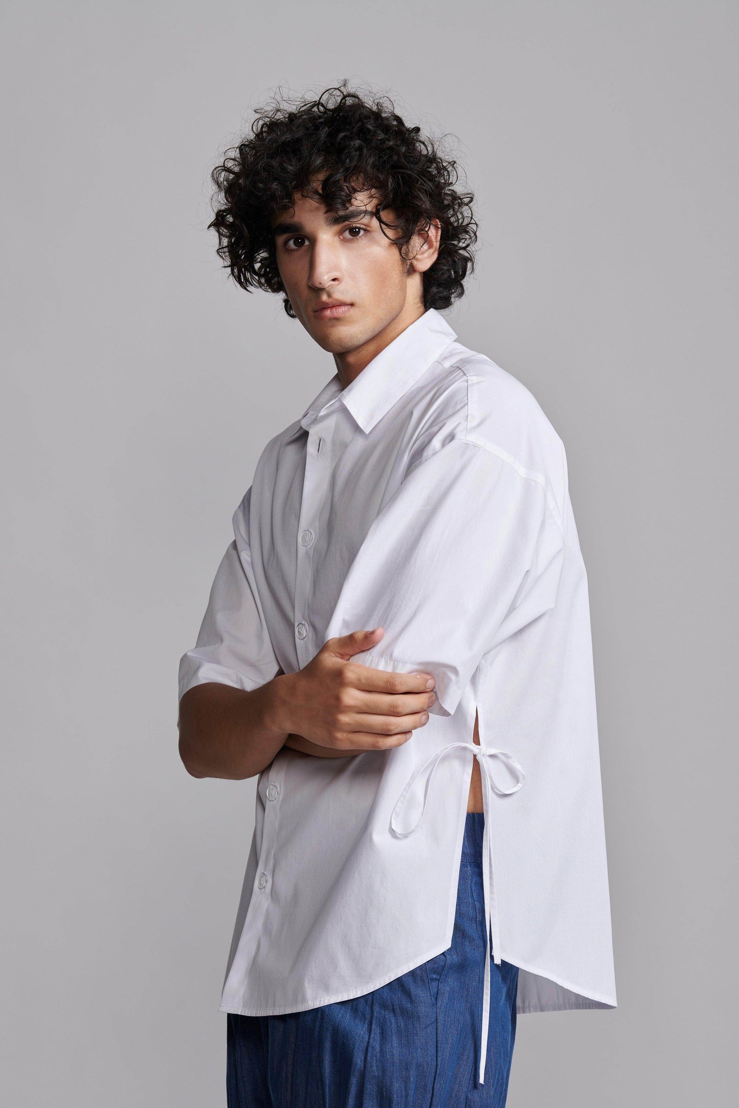 White relaxed fit poplin shirt with side slits and self-fabric knot ties. Features a button-down placket and shirt collar.