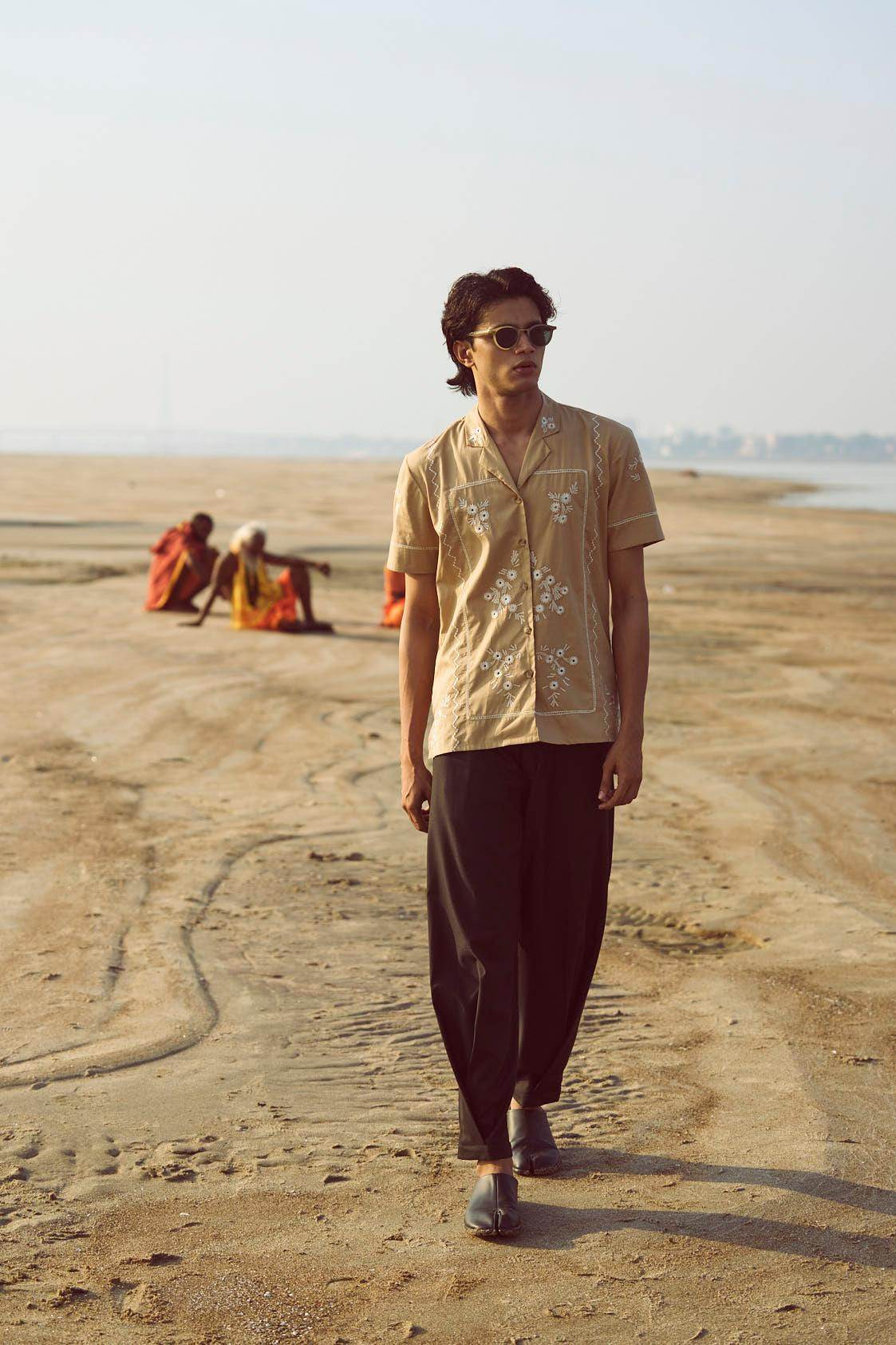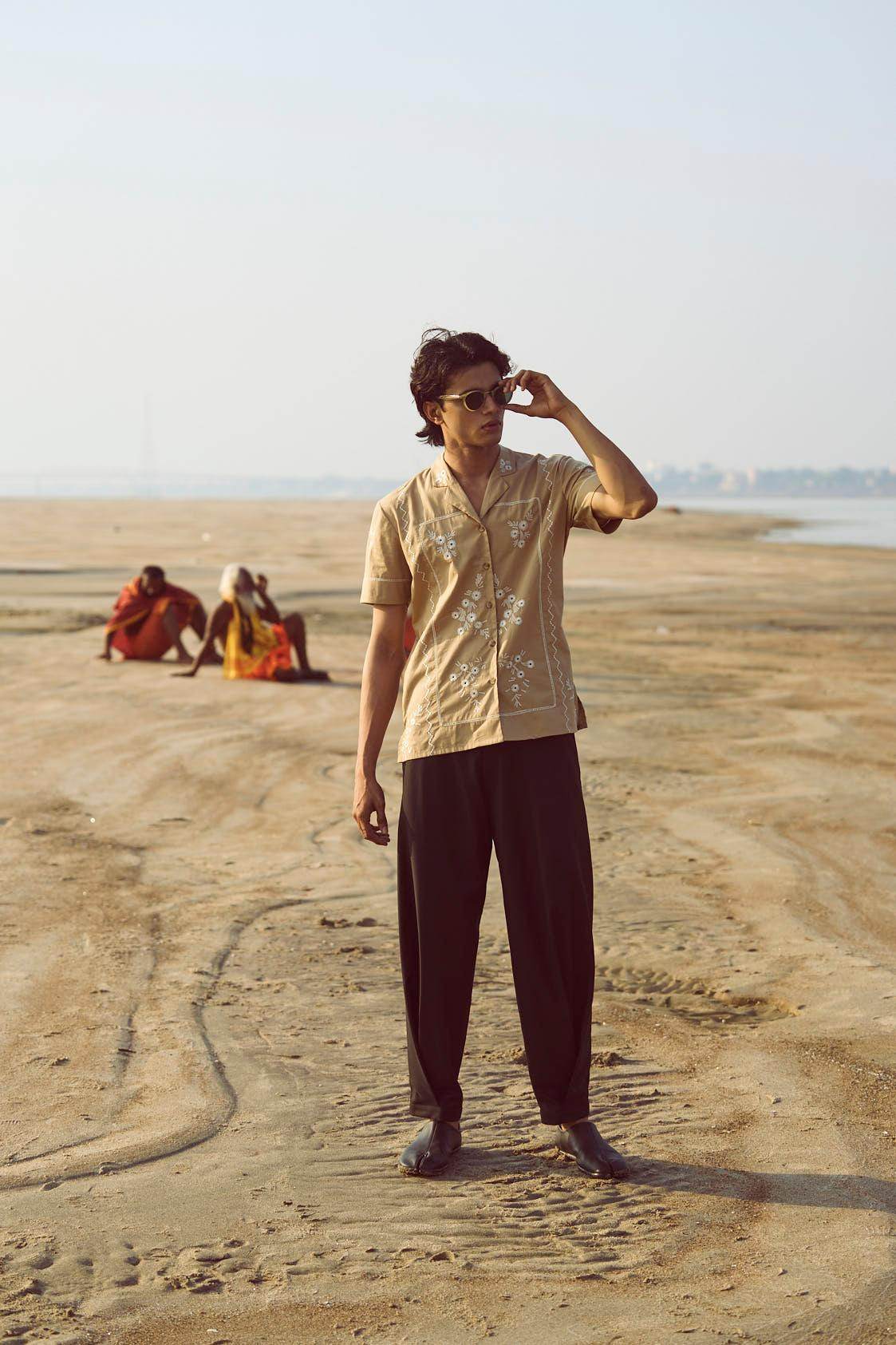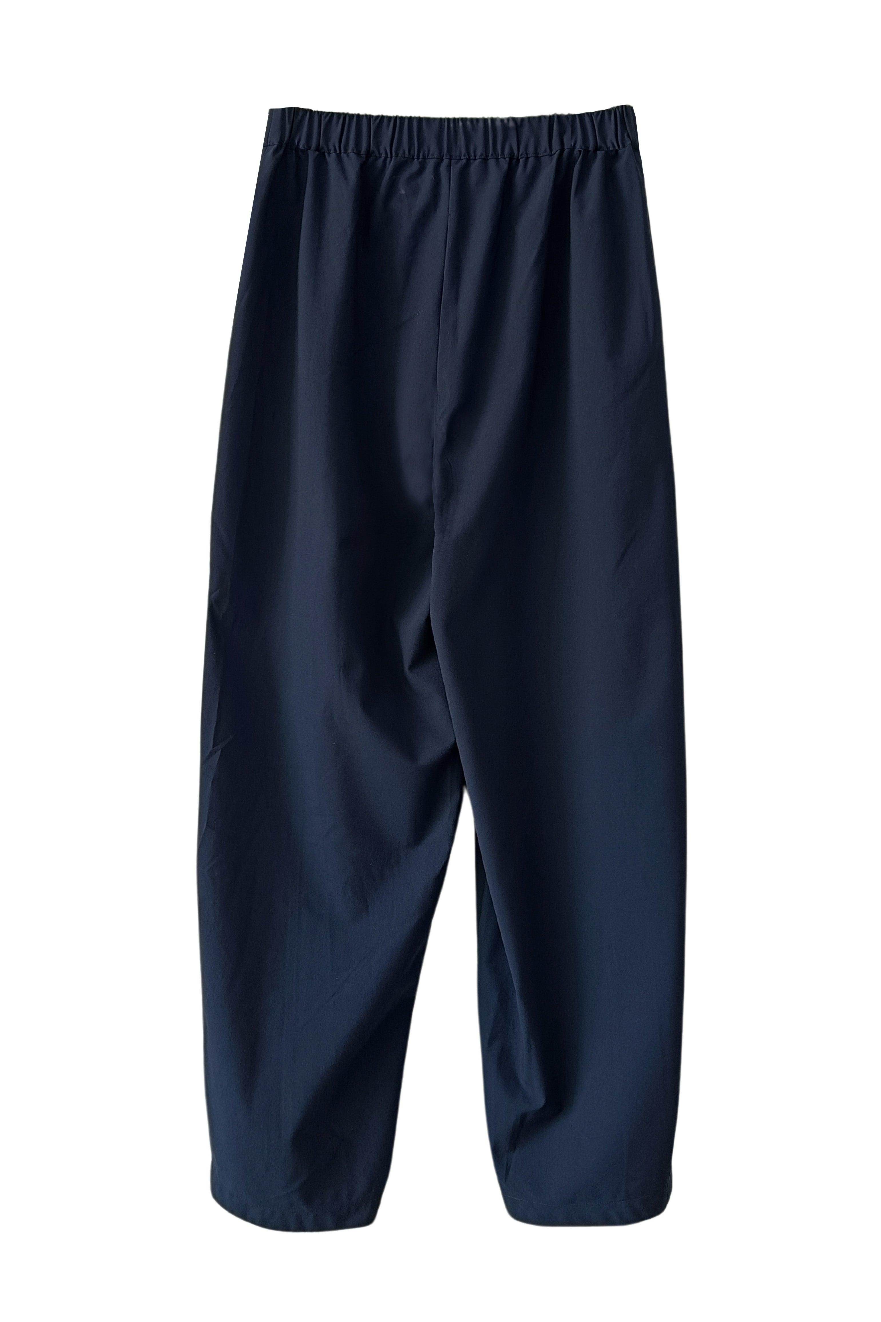 Inverted box pleats pant in all weather suiting material. Pleats are sewn at the cuffs to create an architectural shape and add volume that tapers toward the cuff. Semi-elasticated at the waist. Pockets on the side and back. Hook and eye closure. Zip fly. Relaxed fit.