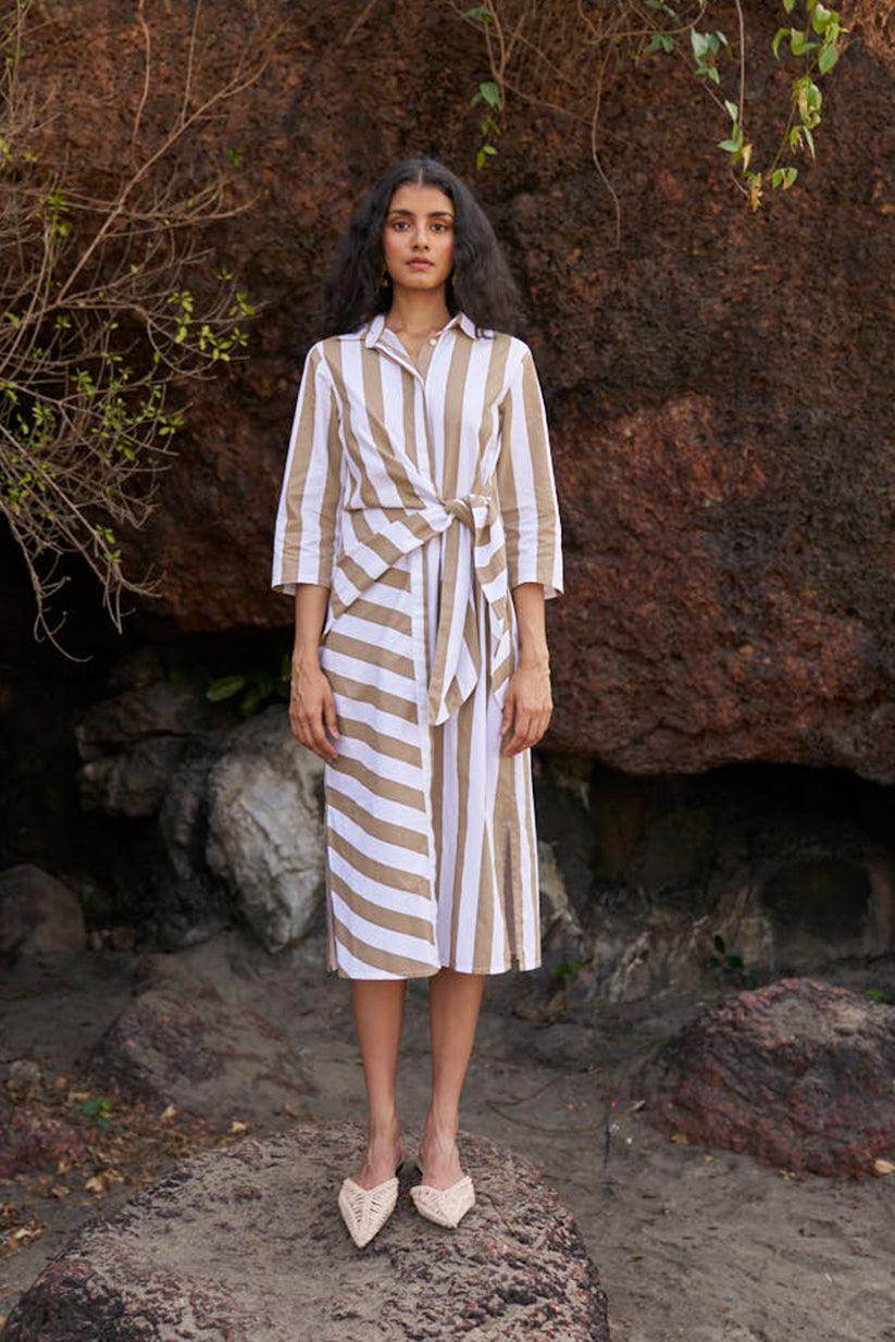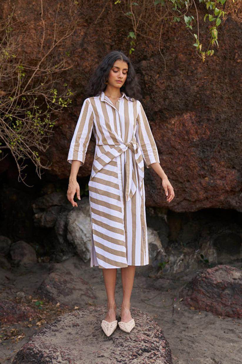 Khaki on white striped shirt dress in midi length with a side tie detailing off the center front. Concealed button placket and slits on both sides. 3/4th sleeves.