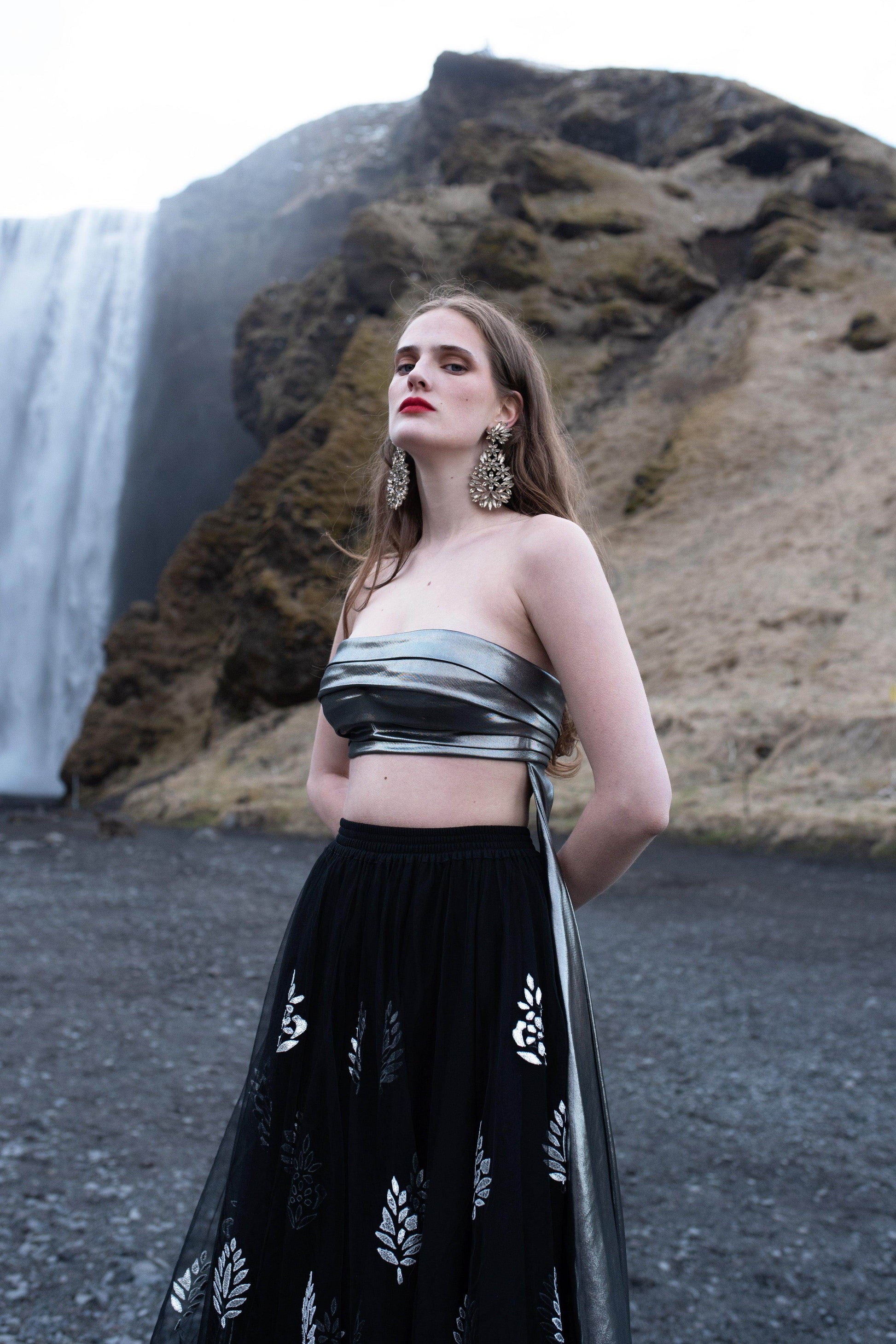 Pewter-silver bandeau tube top in stretchable knitted lamé fabric. Hand-sewn cummerbund-inspired delicate pleat detail at the front. Free-flowing draped panel attached on the wearer’s left for added movement and drama. Hook-eye closure at the back. Paired with ethereal tulle layered skirt, adorned with meticulously hand-applied silver patchwork appliqué in floral-inspired motifs. Elasticated at the waist. The skirt flares out towards the bottom, creating volume and mesmerizing movement at the hem. The top comes with removable pad pockets. The garment is fully lined.