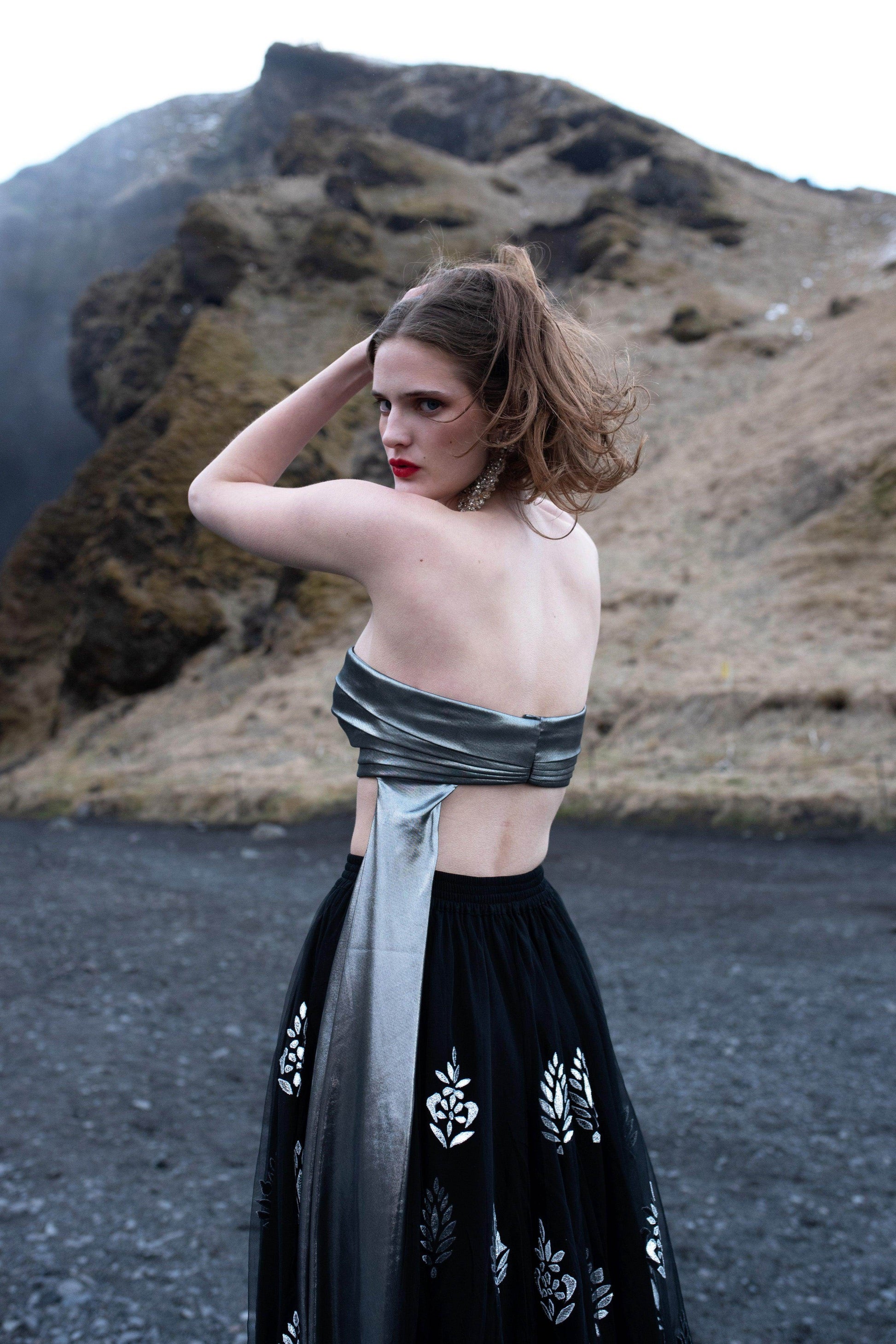SILVER AND BLACK APPLIQUE MAXI SKIRT SET