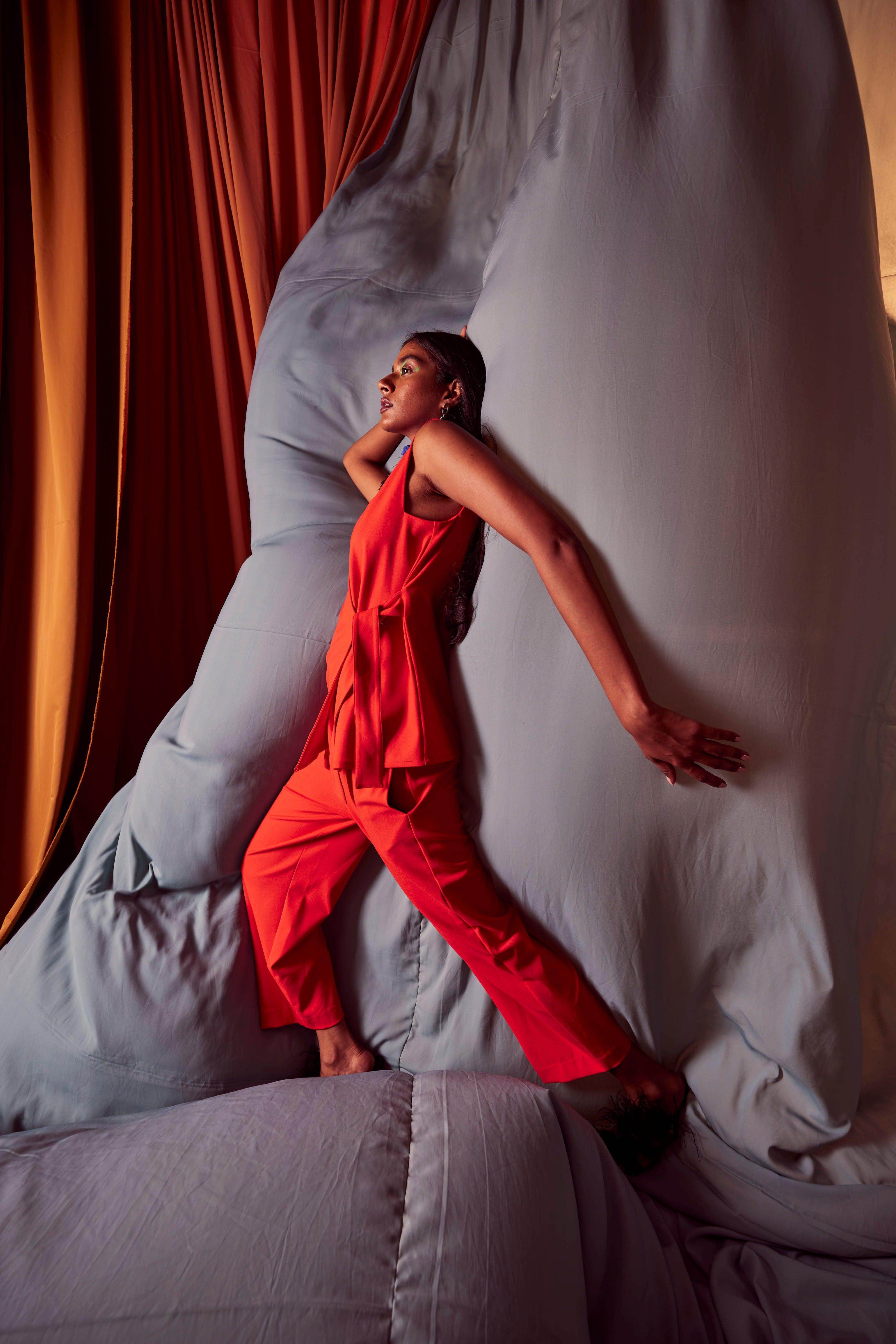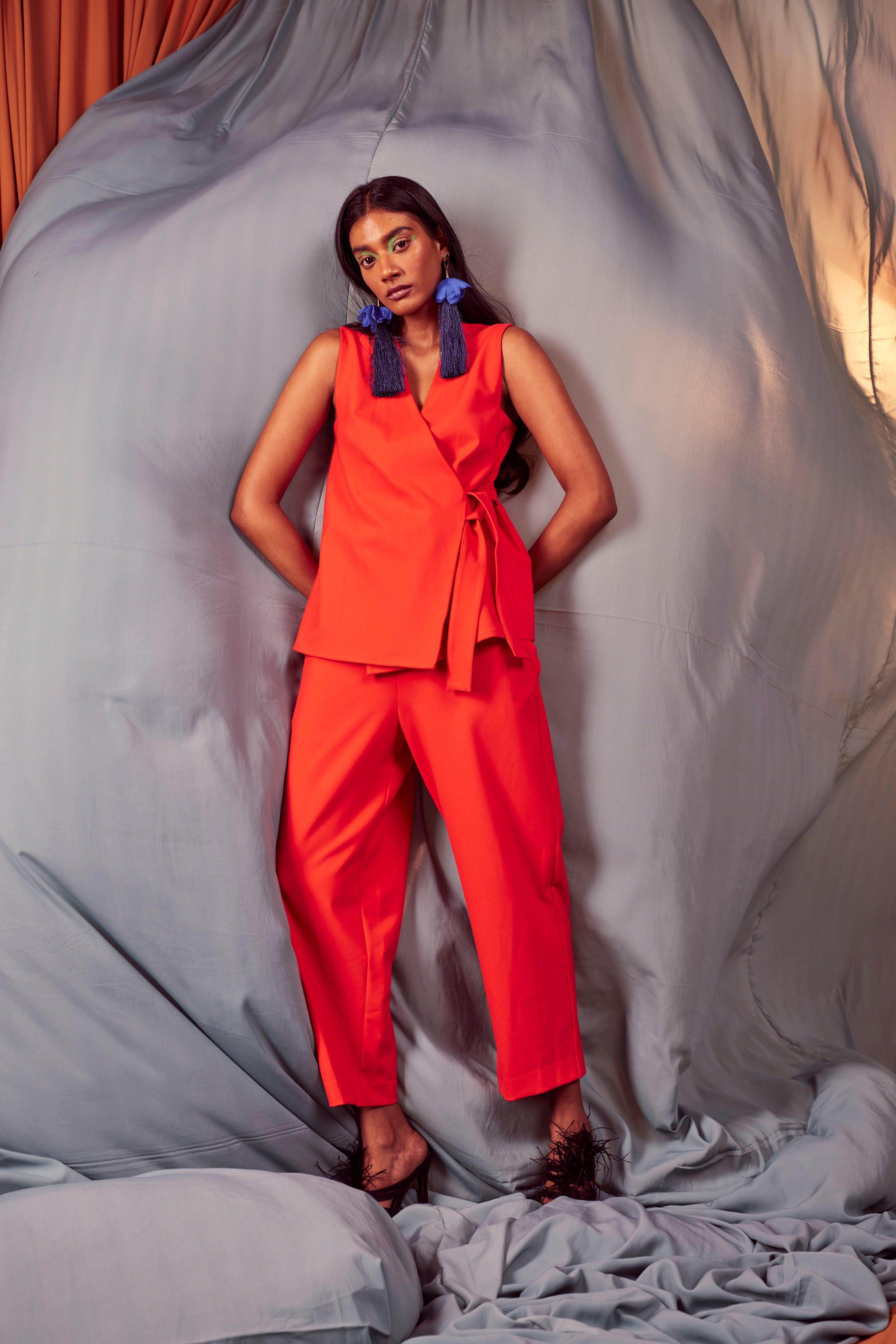 Coral-toned deconstructed, waistcoat-inspired top with squared armholes and 2 button closure. Paired with matching culottes.