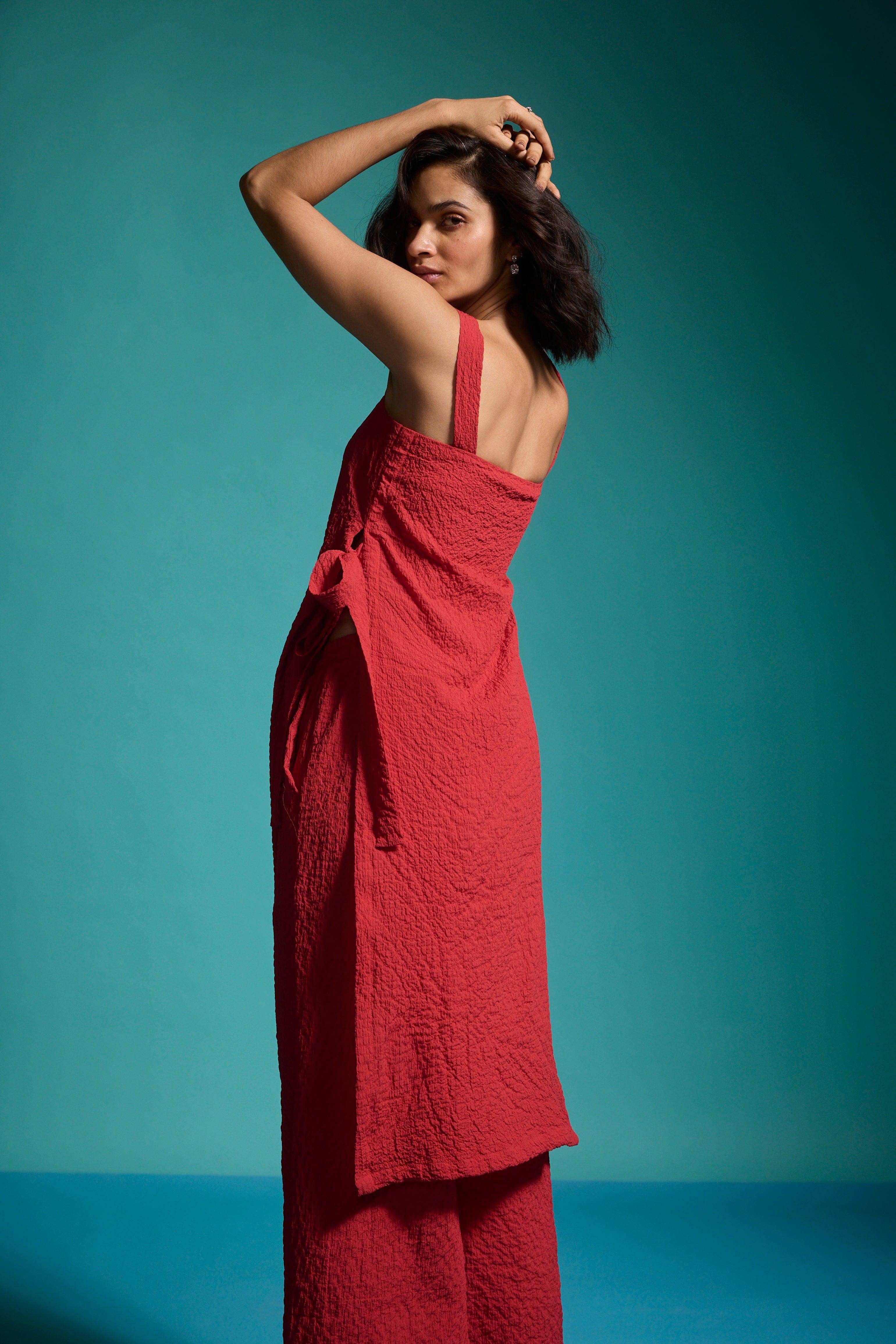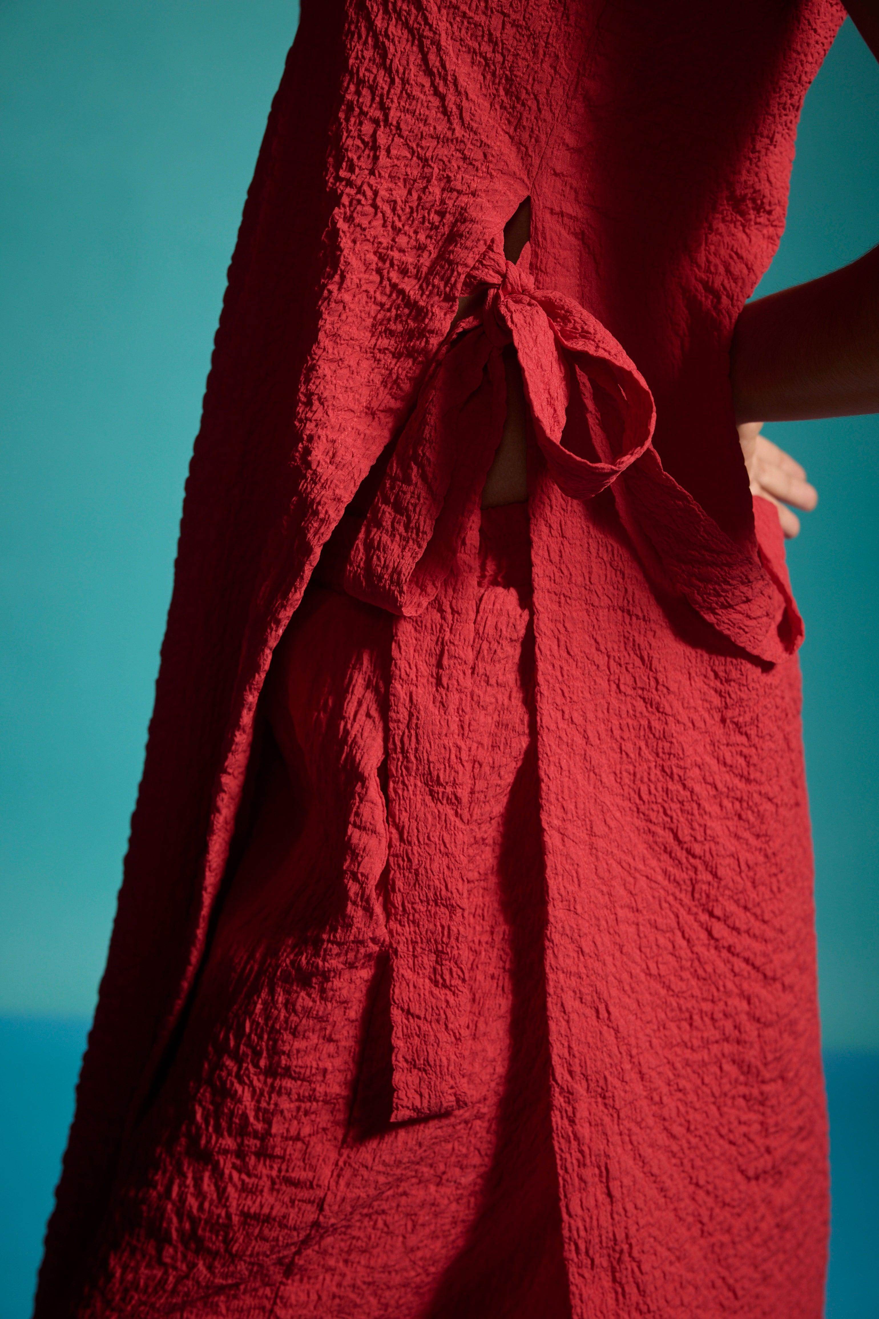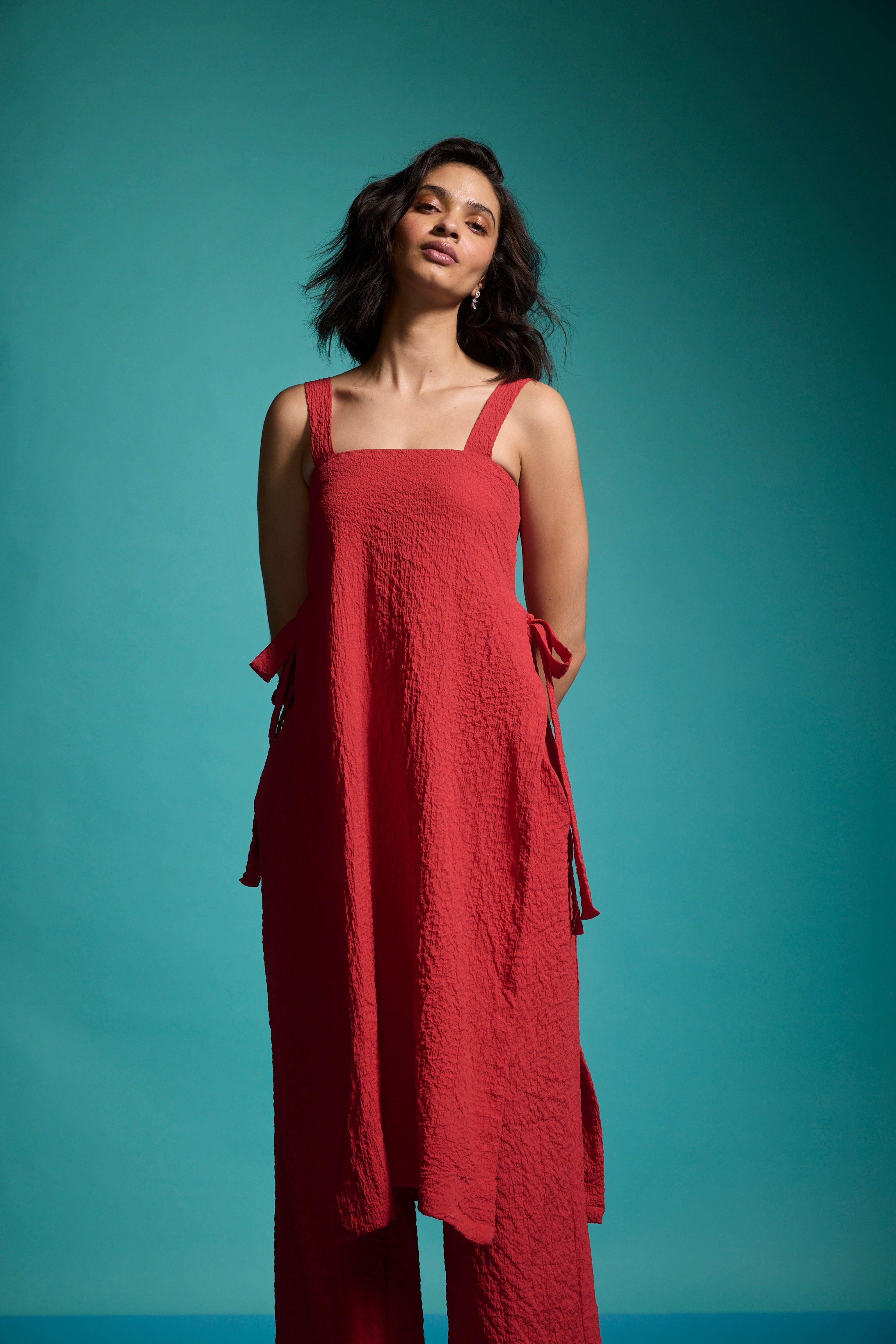 Red sleeveless top in textural fabric with a ruched/crushed effect. Features shoulder straps, high side seam slits with self-fabric ties for added drama, and a side zipper closure.