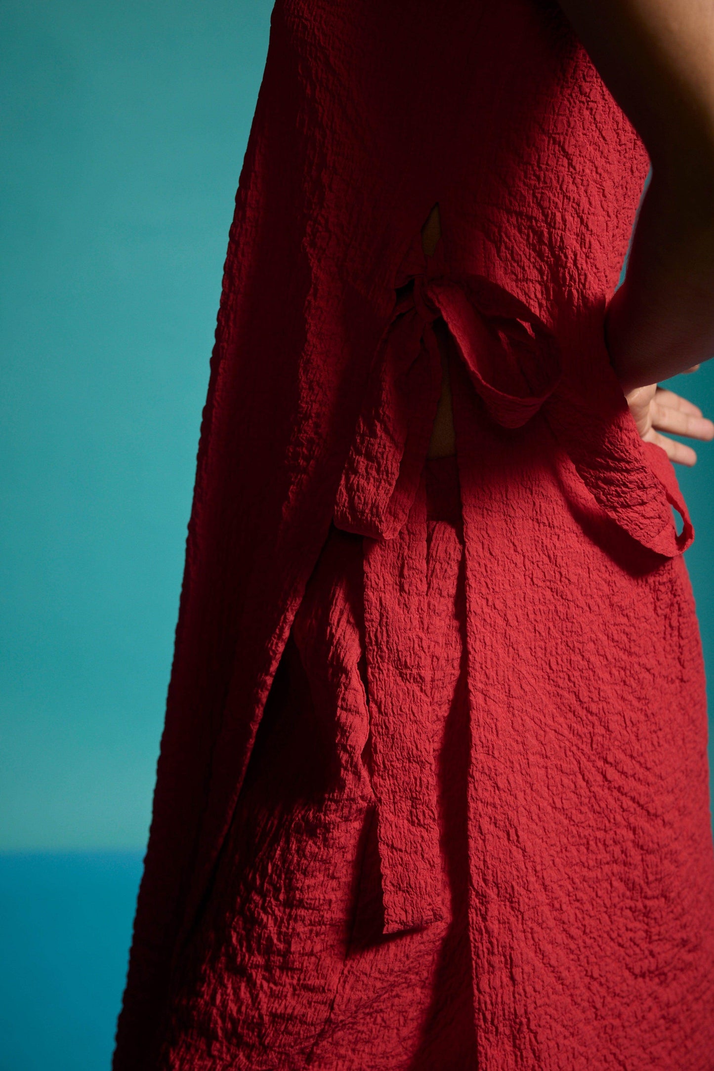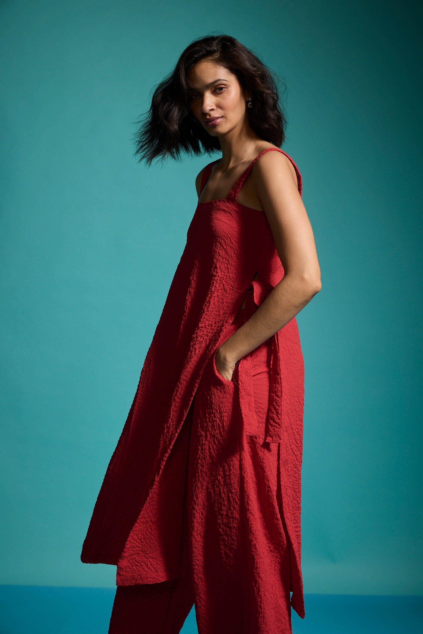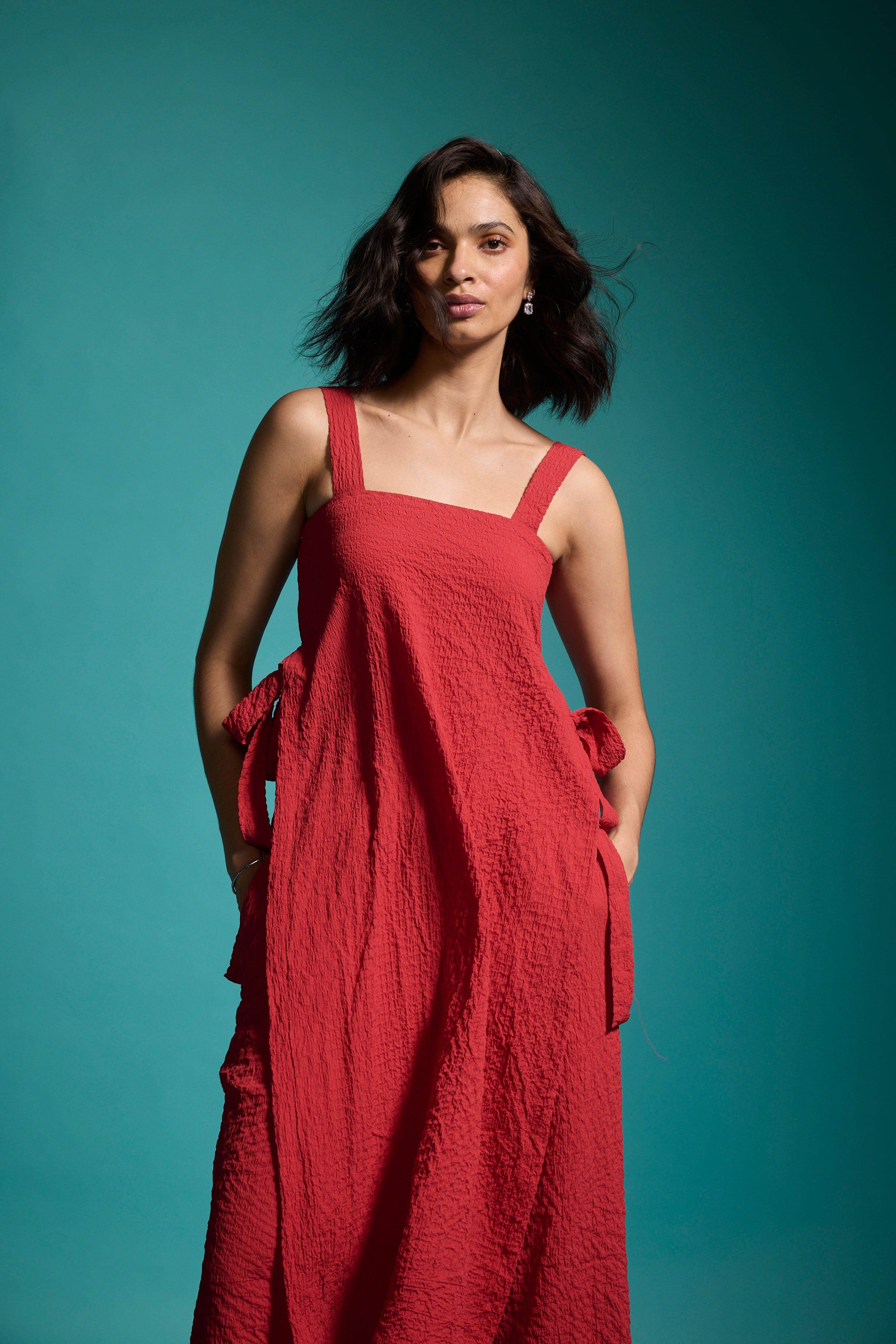 Red sleeveless top in textural fabric with a ruched/crushed effect. Features shoulder straps, high side seam slits with self-fabric ties for added drama, and a side zipper closure.