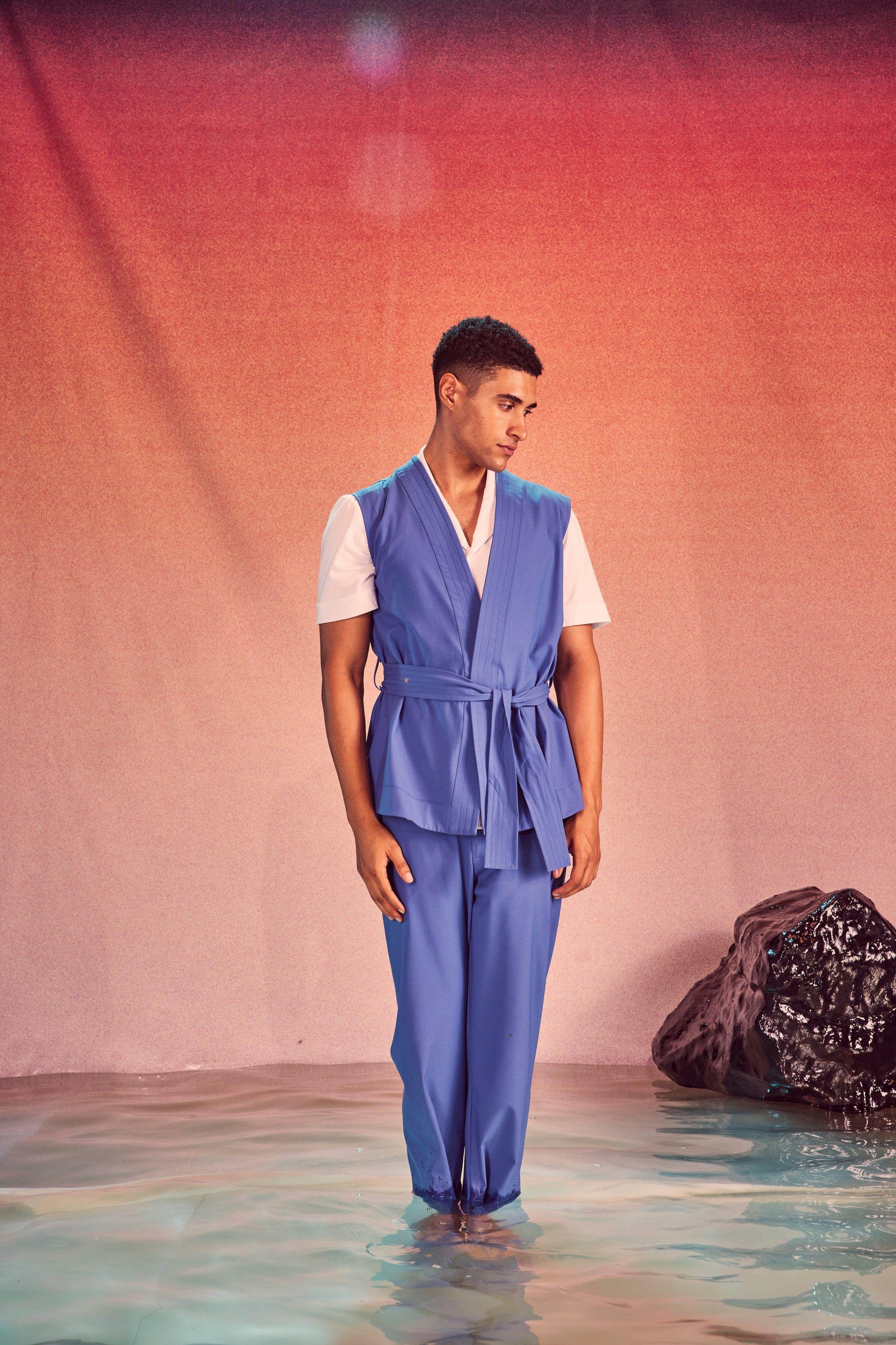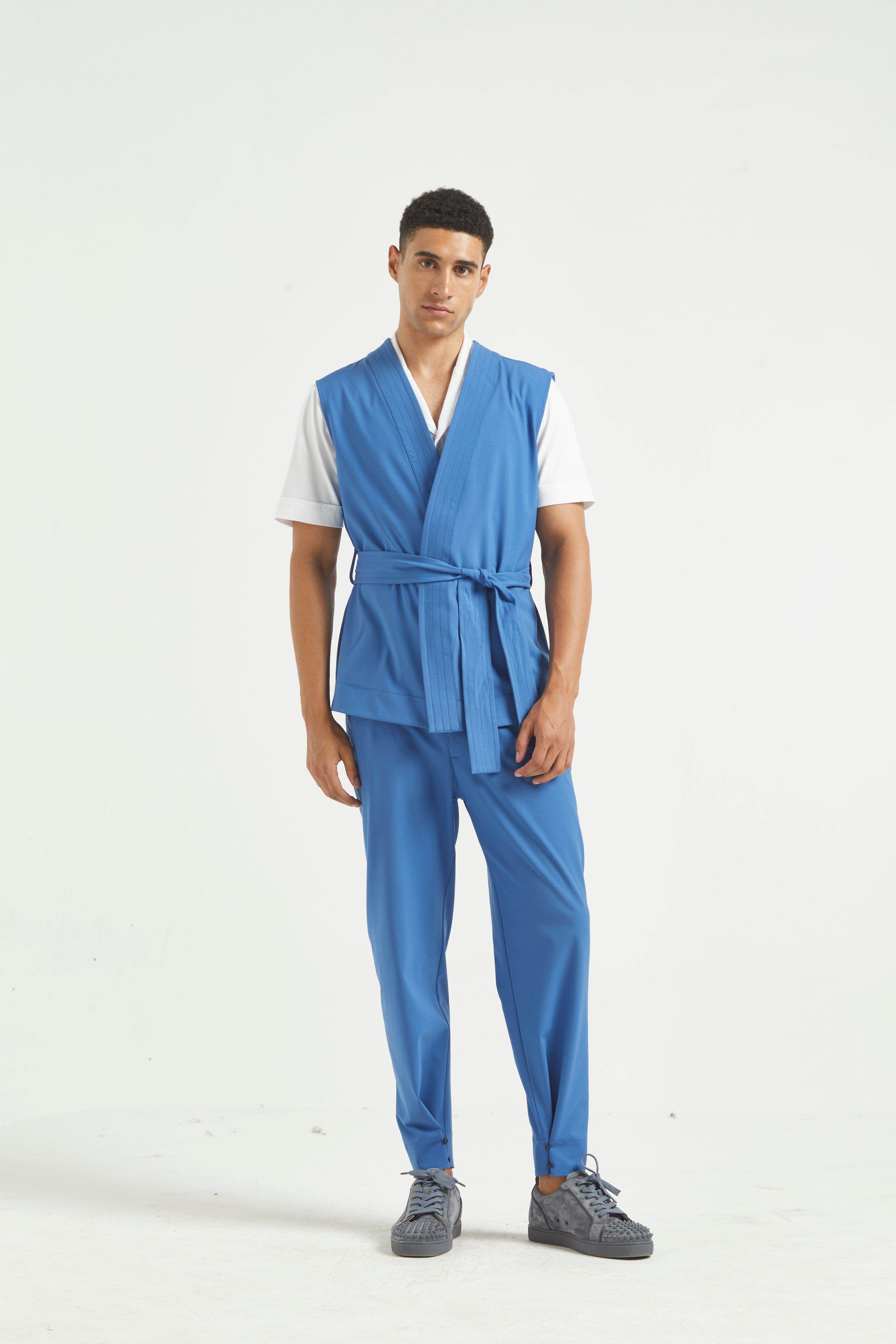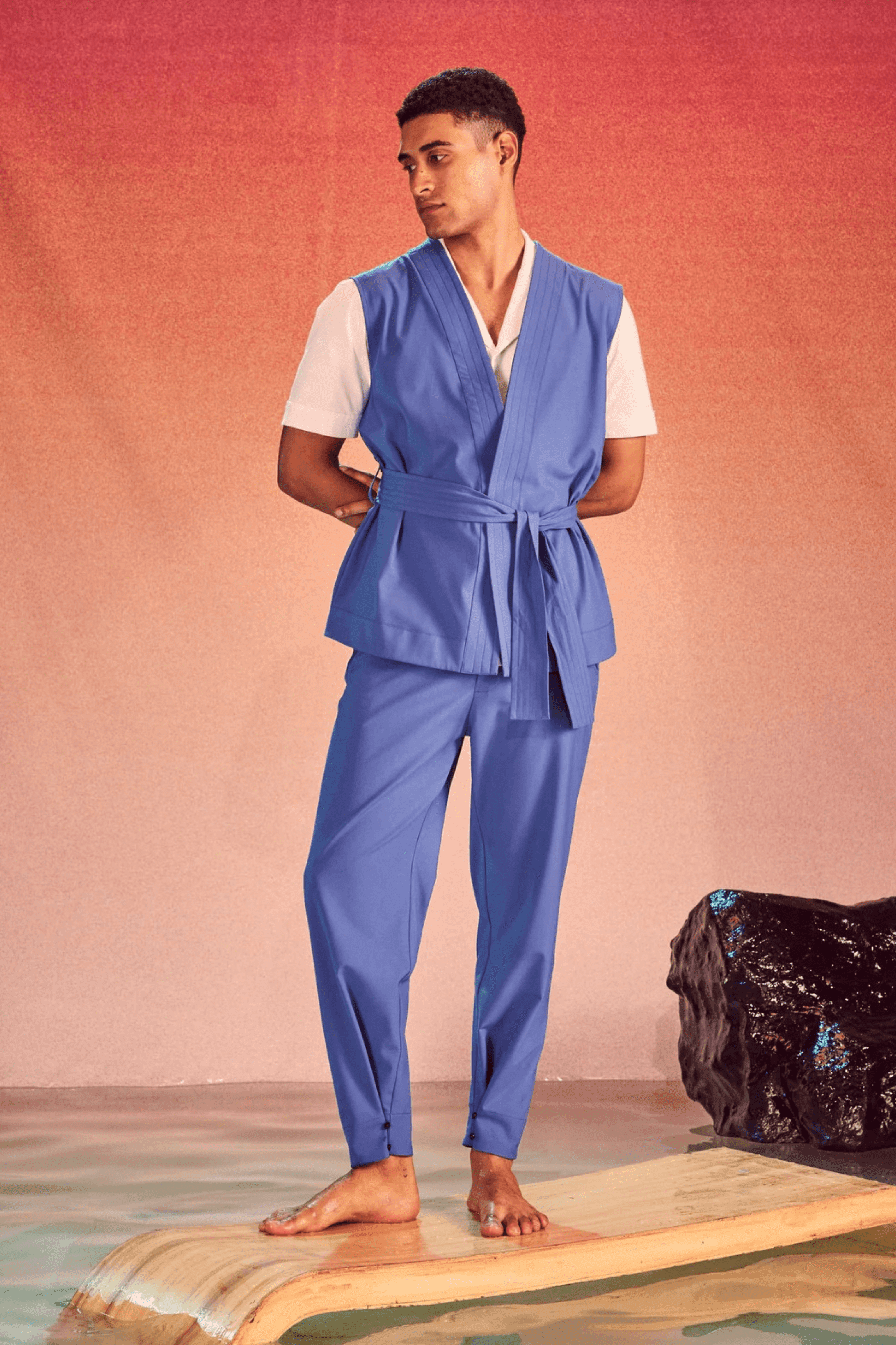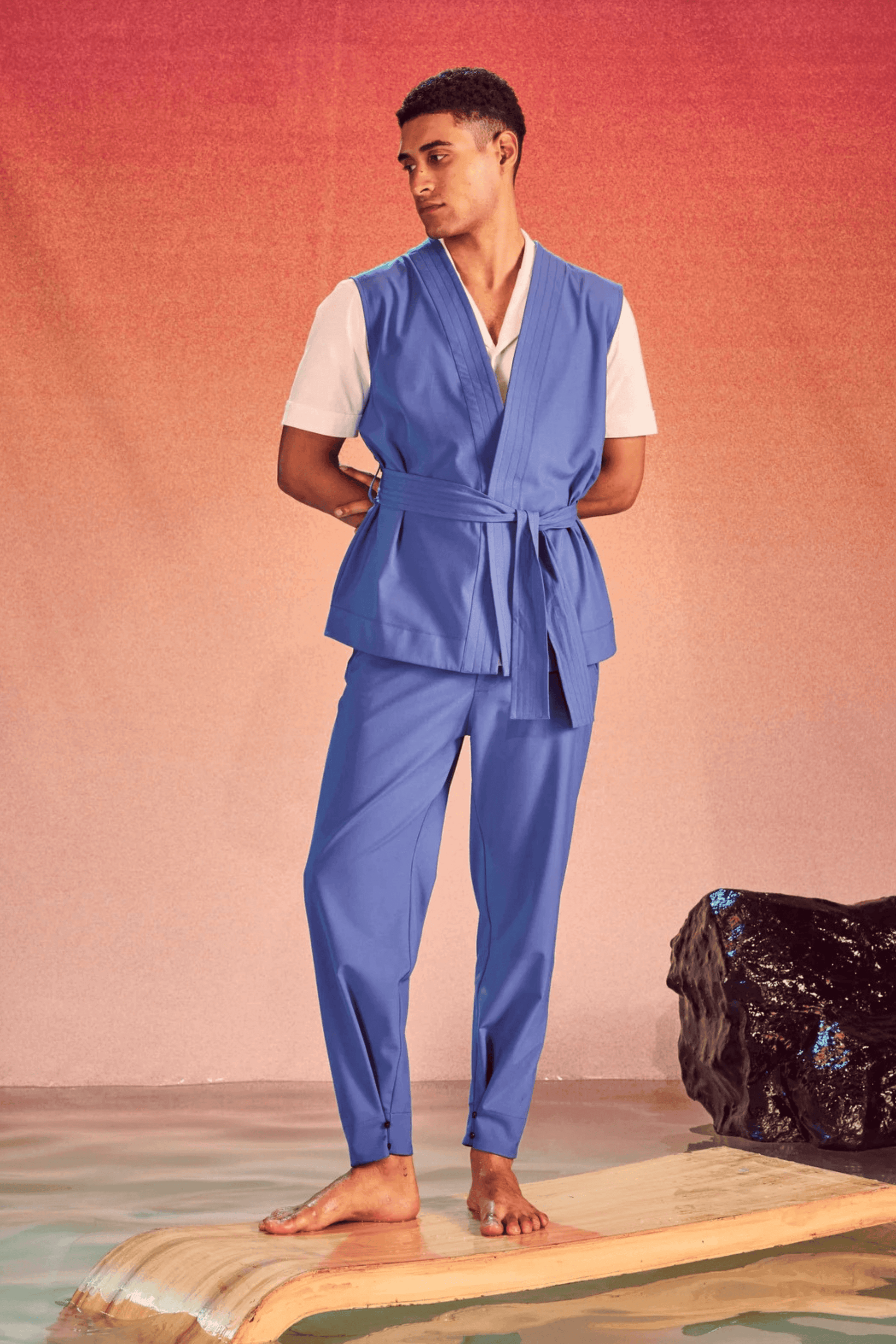 Azure blue sleeveless wrap suit. Unlined shawl-collar jacket with trapunto stitch detail on the lapel. Front overlap with a self-tie belt at the waist. Paired with matching button cuff pants. Can be worn as straight pants, or buttoned at the hem to provide a tapered fit.
