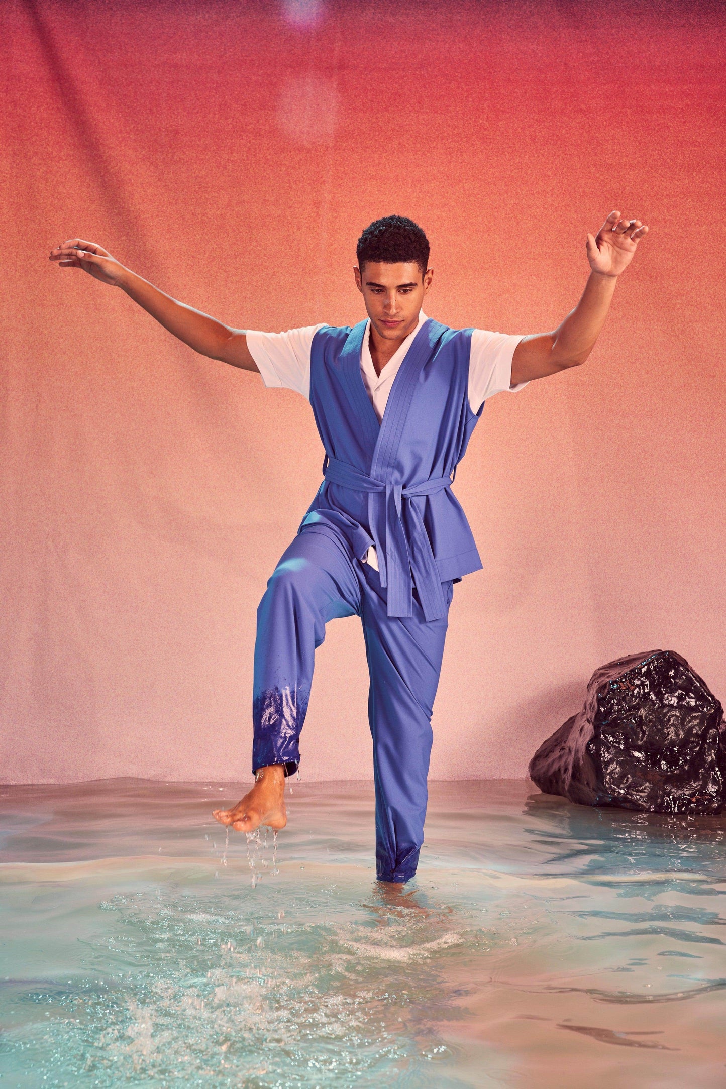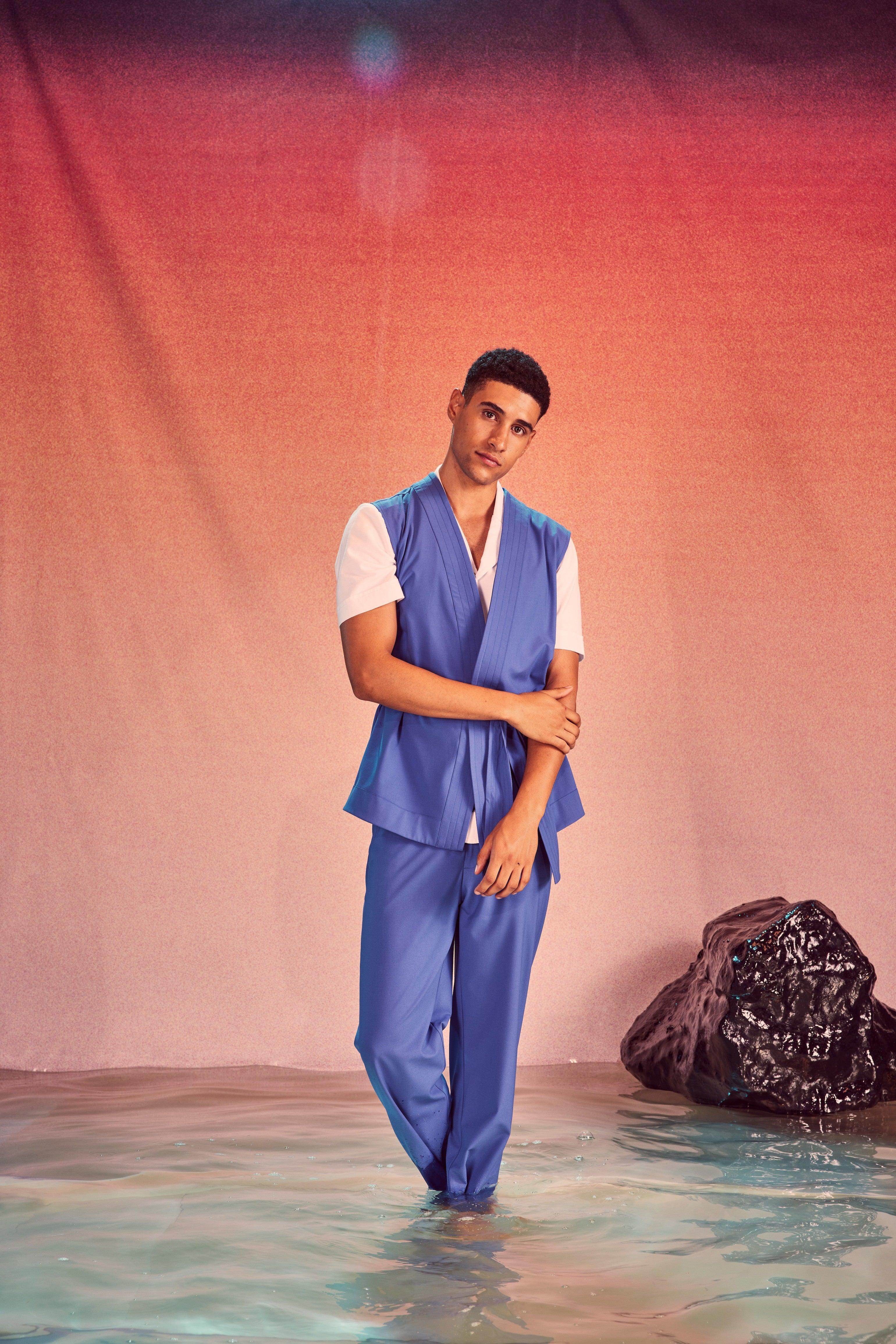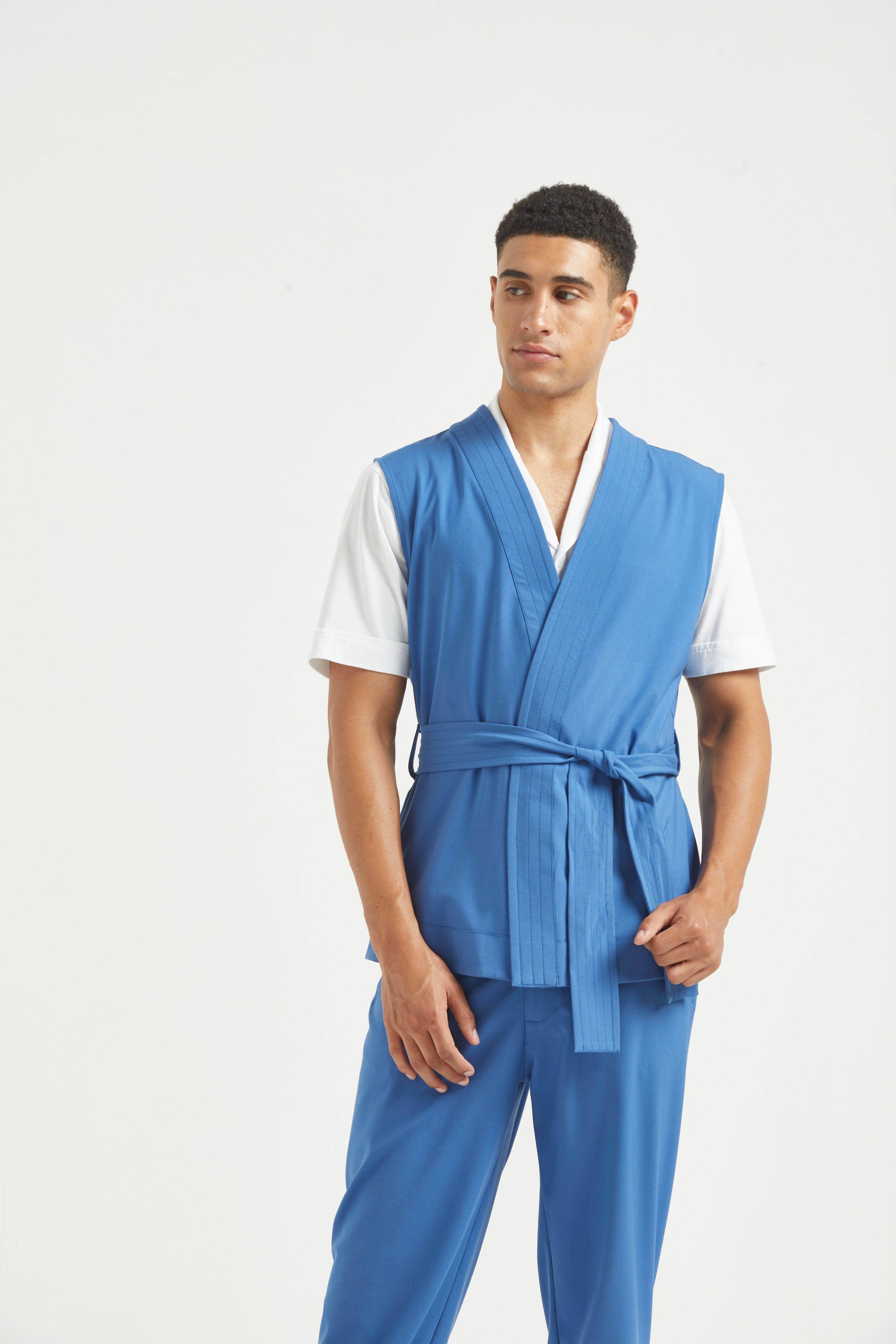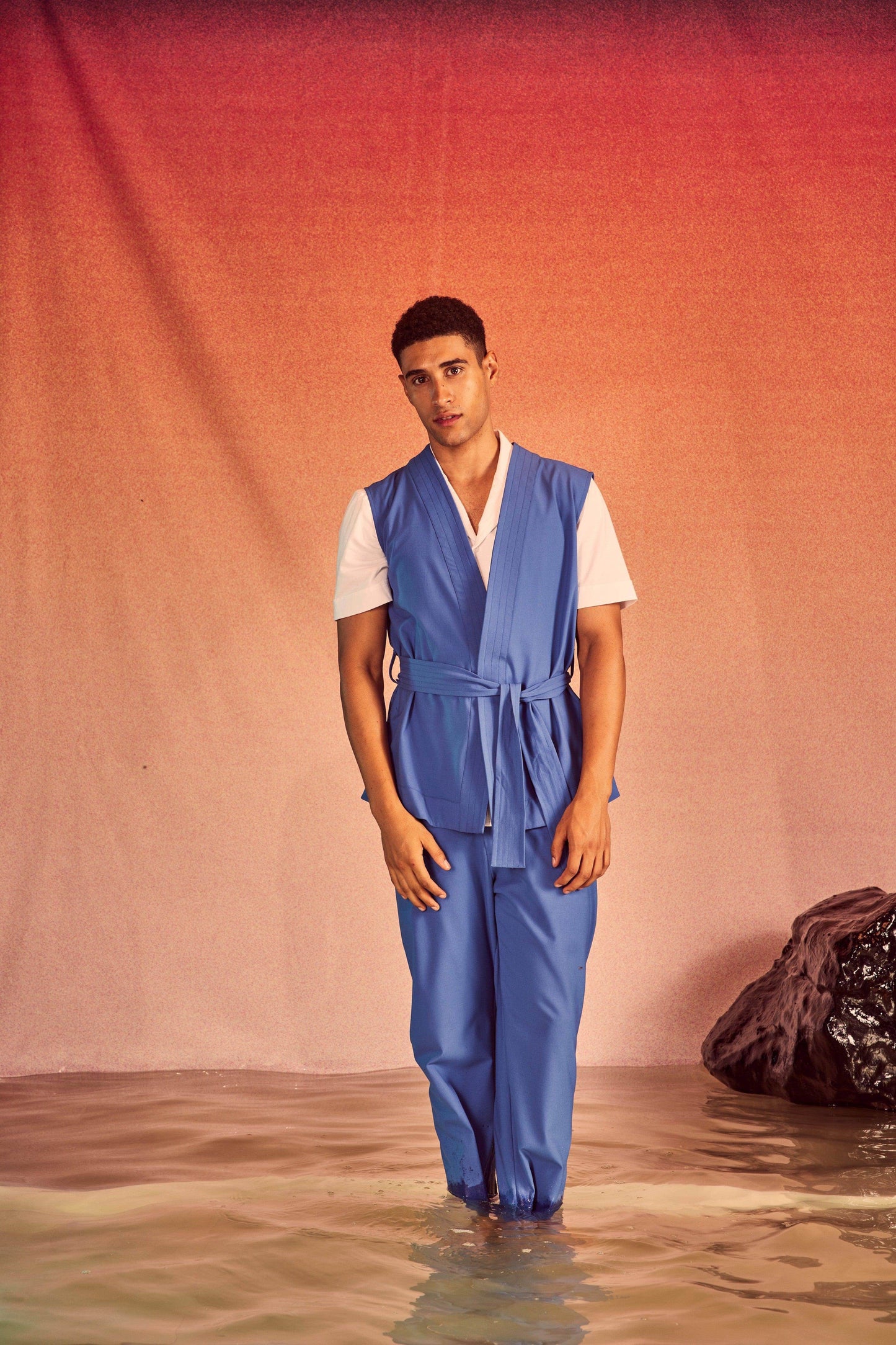 Azure blue sleeveless wrap suit. Unlined shawl-collar jacket with trapunto stitch detail on the lapel. Front overlap with a self-tie belt at the waist. Paired with matching button cuff pants. Can be worn as straight pants, or buttoned at the hem to provide a tapered fit.
