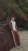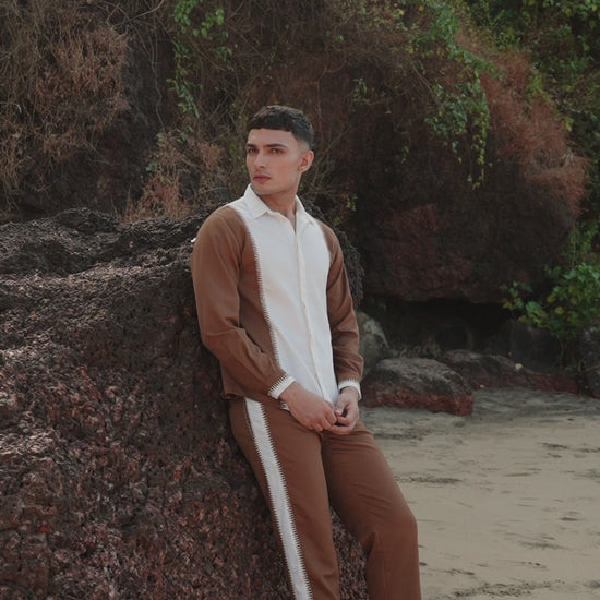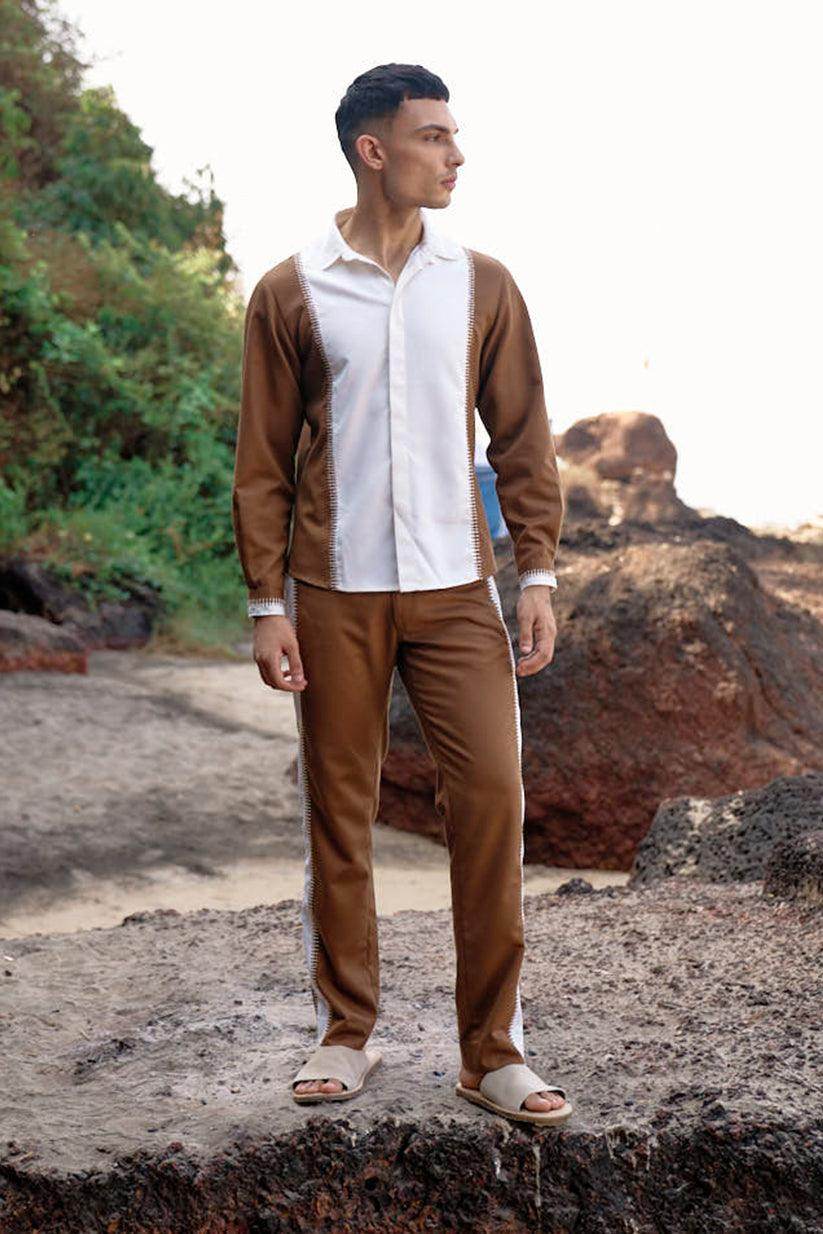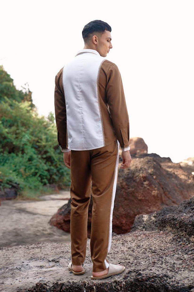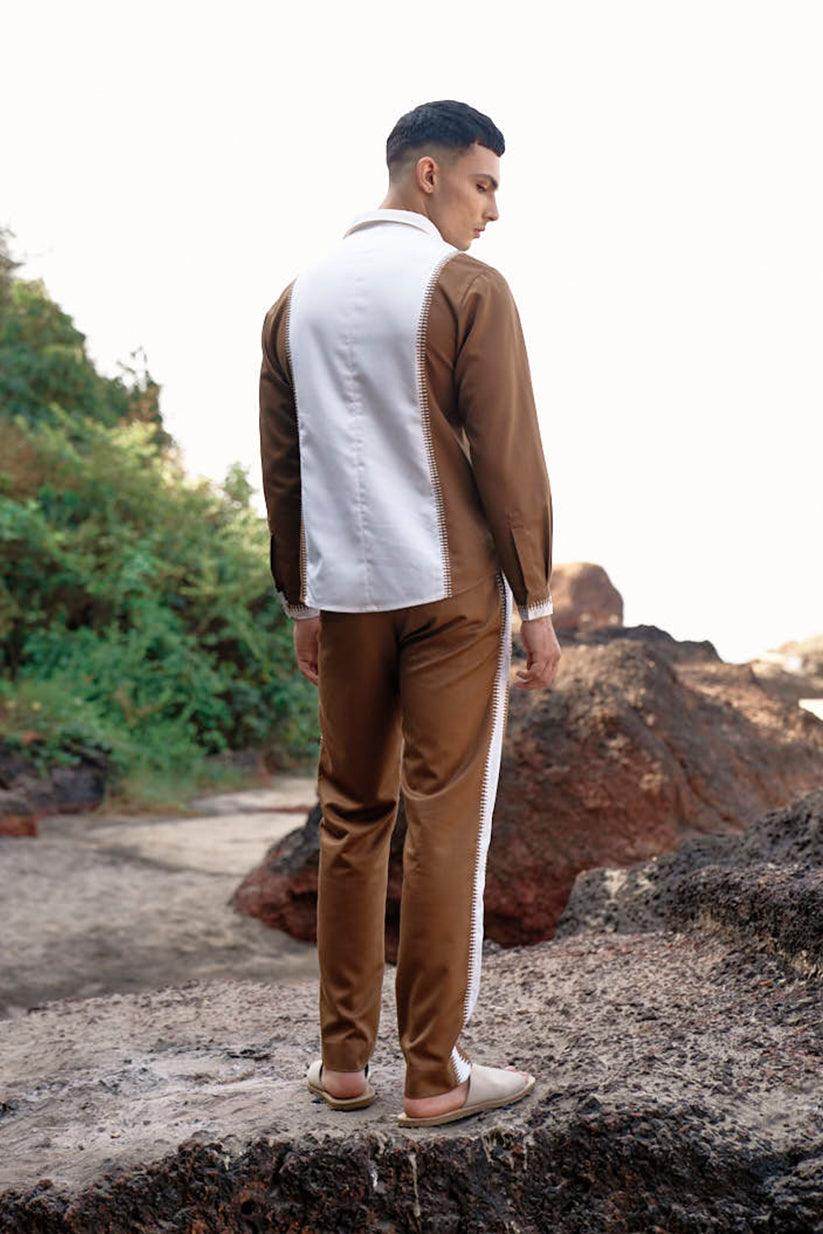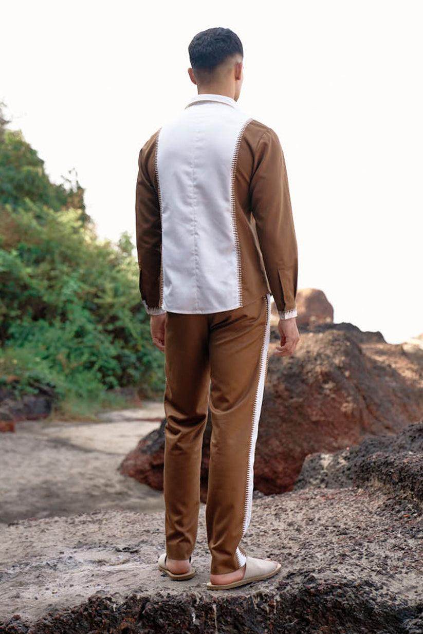 Color-blocked brown/ivory shirt and pants. Manually applied contrast stitch detailing on the seams. Zip and button closure, belt loops on the waist. Pockets in the sides and back.