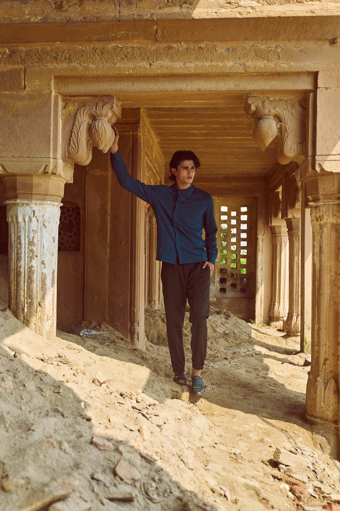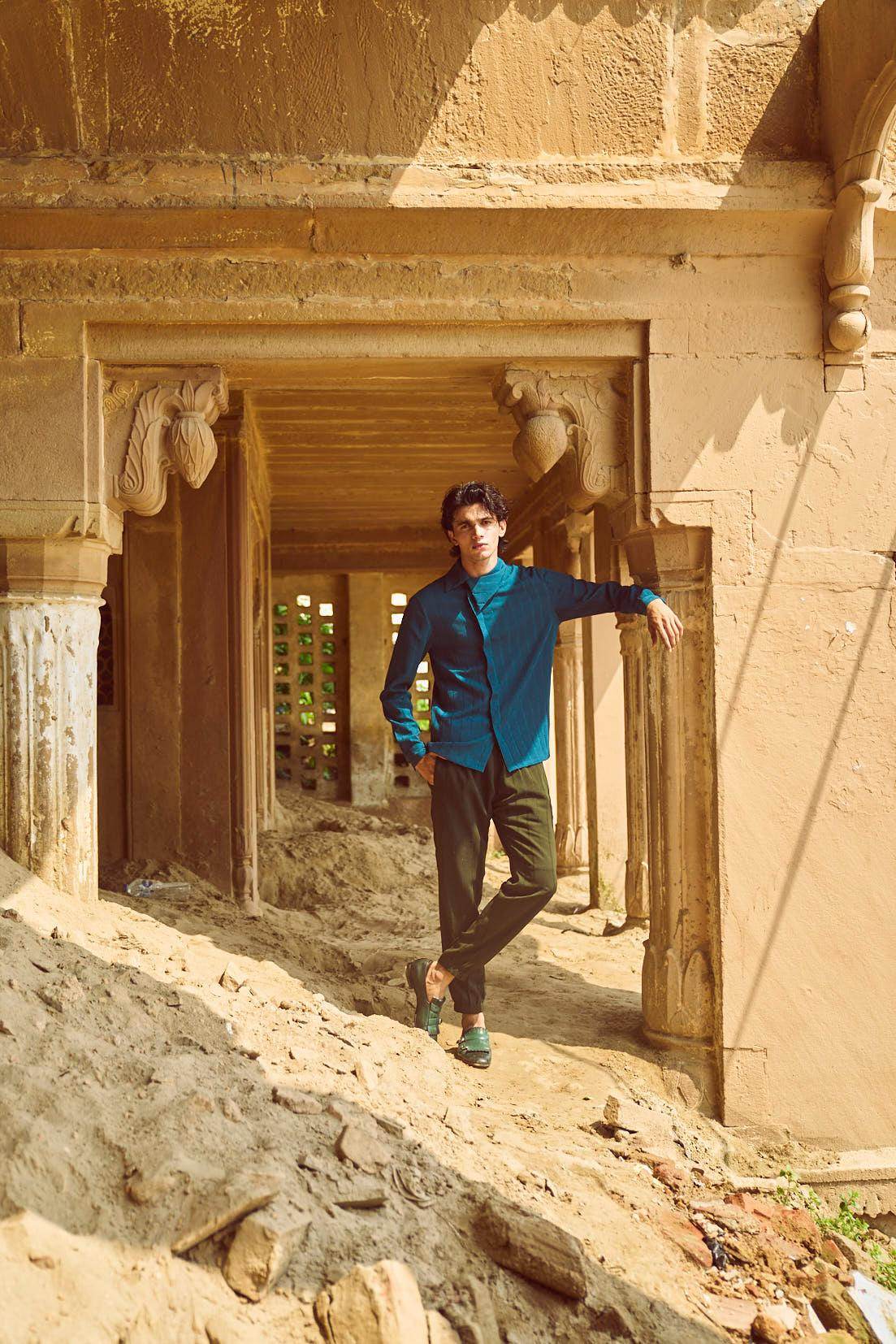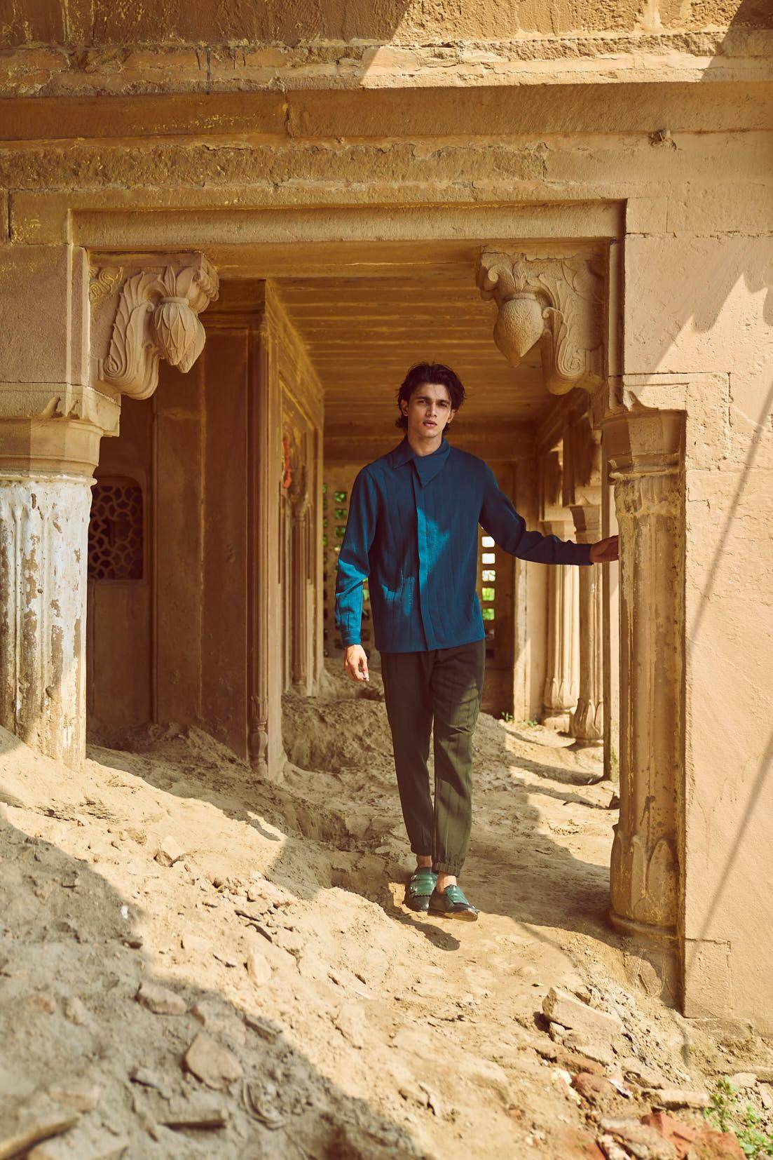 Teal blue full-sleeve shirt in textured shadow stripe fabric. Off-center split cowl collar with concealed placket. Regular fit. Paired with military green jogger pants in textured shadow stripe fabric. Pockets on the side and back. Drawstrings at the front. Elasticated at the waist and cuff.