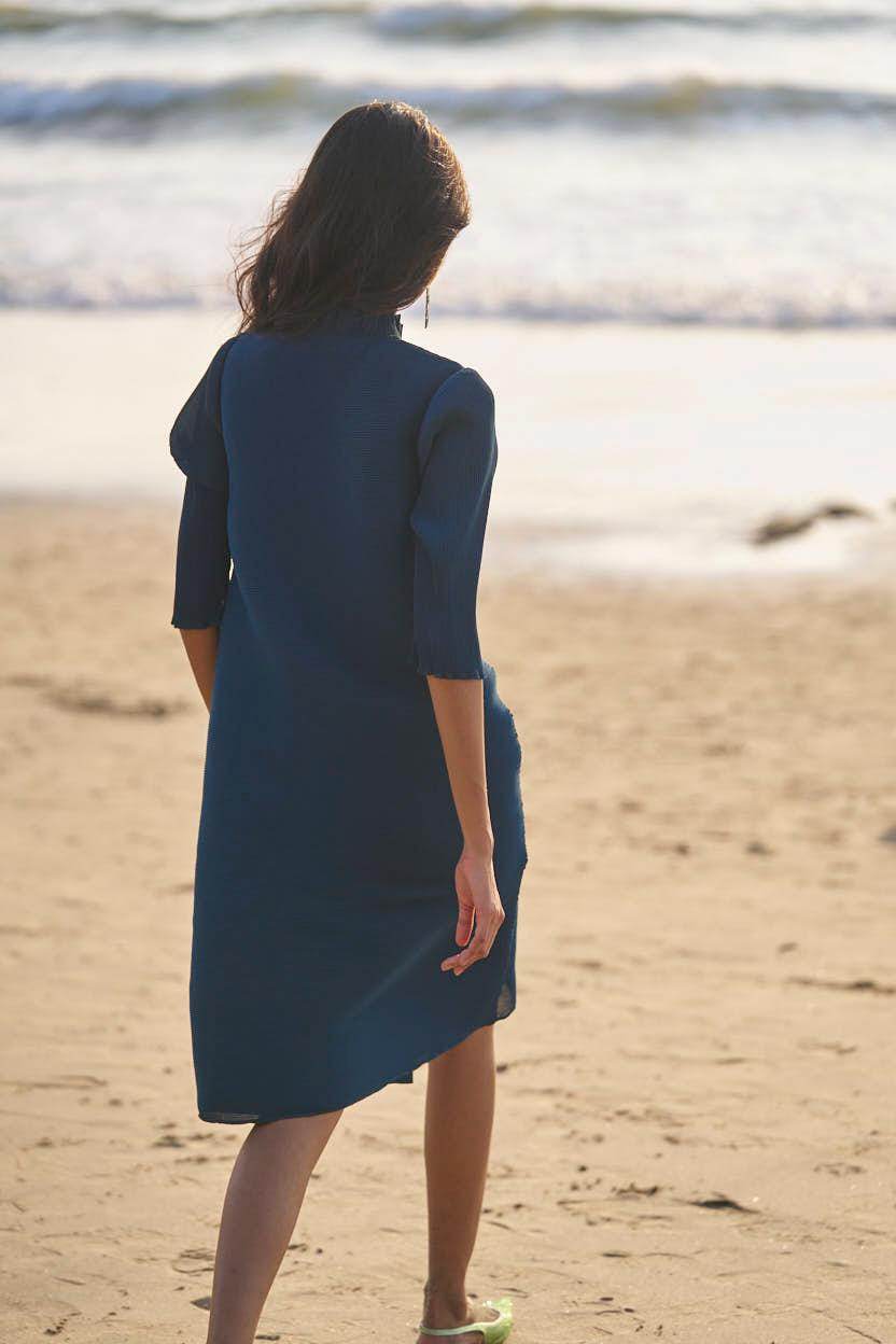 Teal pleated button down A-line midi dress with a dainty frill band collar. 3/4th sleeves with lettuce hem. Concealed placket with snap button closure. The garment is fully lined.