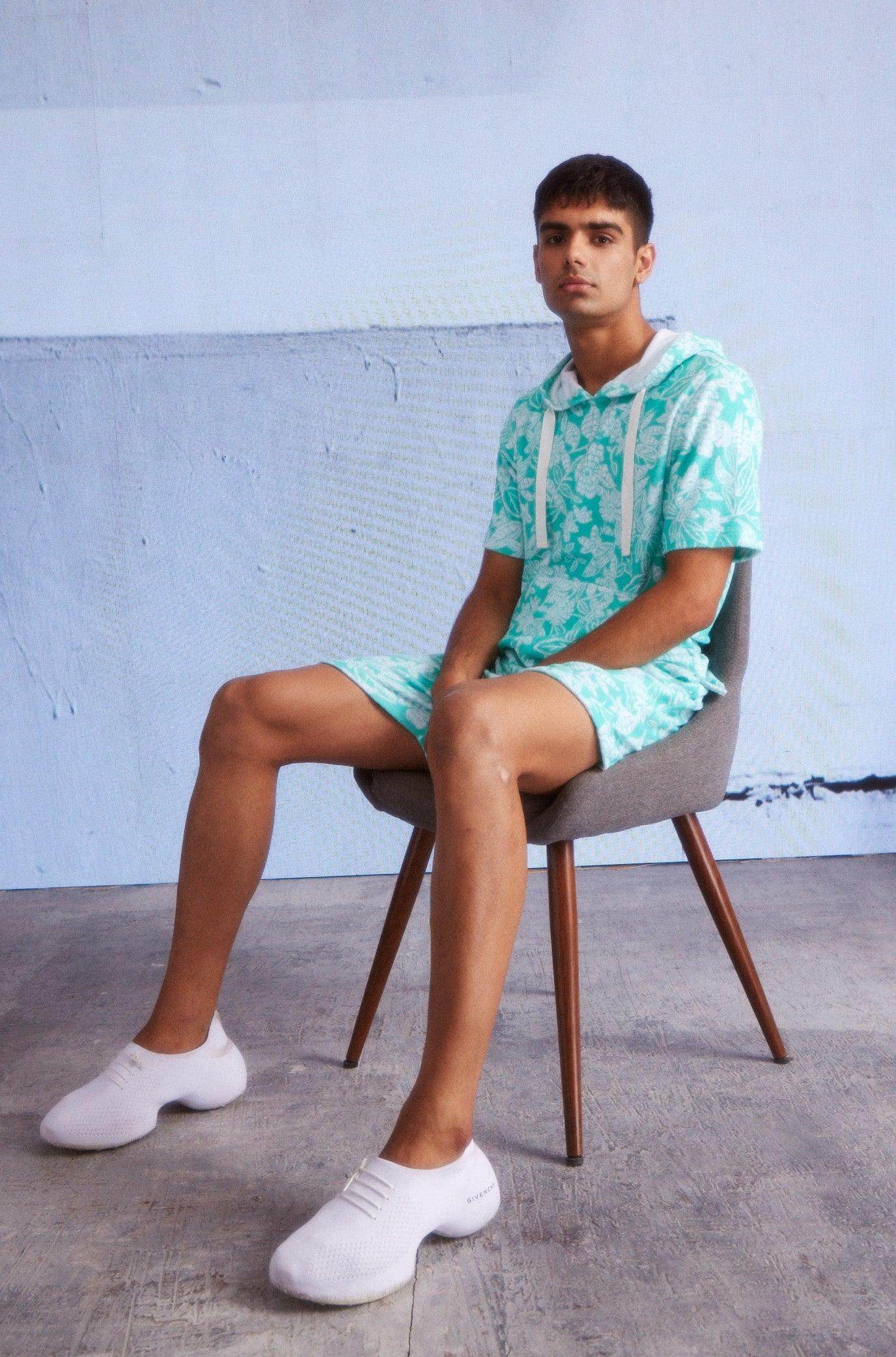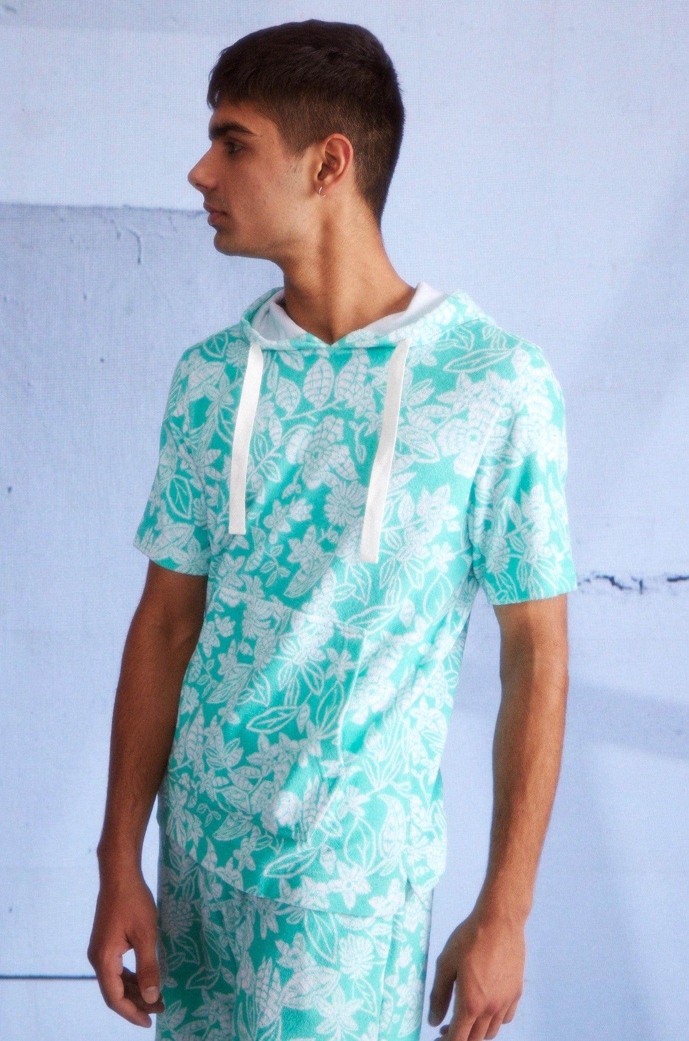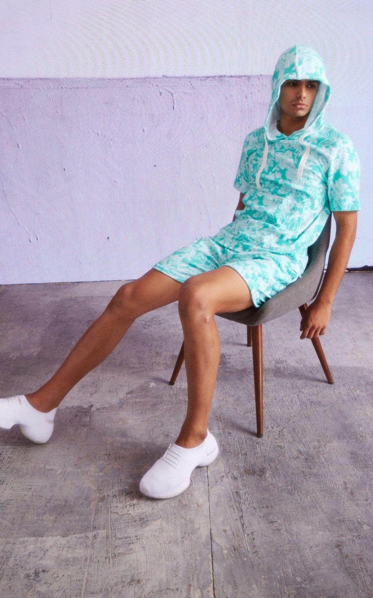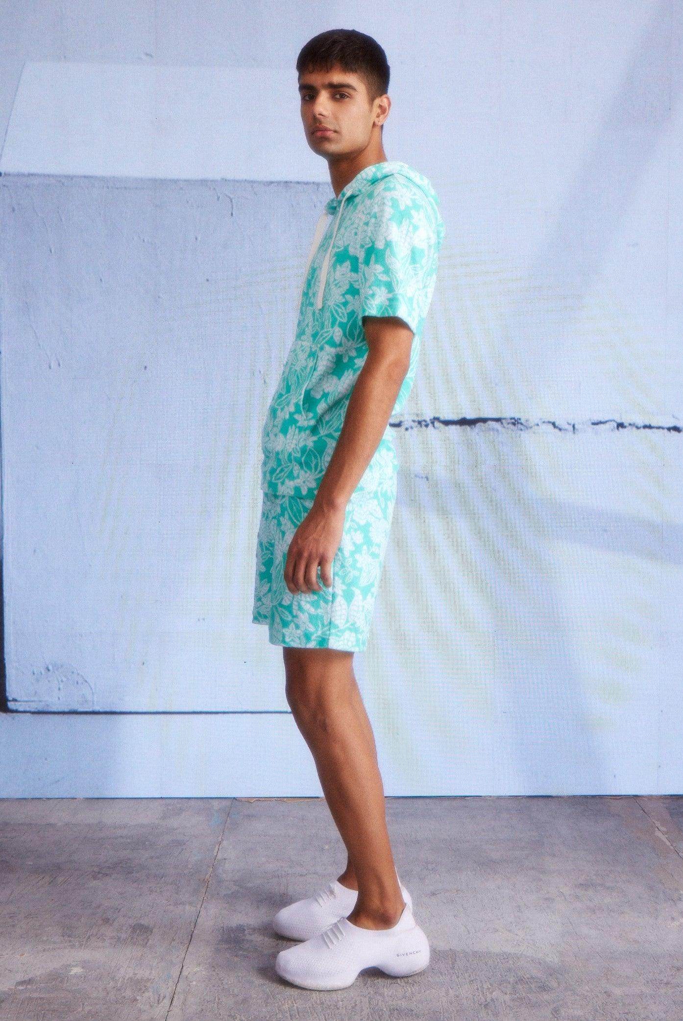 Half sleeve hoodie in patterned mint green and ivory towel terry. Drawstring detail at the collar. Kangaroo pockets in the front. Half sleeve, relaxed fit. Paired with matching shorts. Elasticated at the waist and drawstrings. Pockets on the sides and back. Relaxed fit.